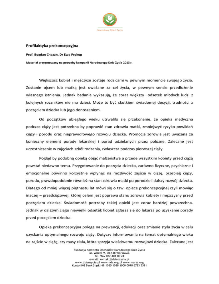 Profilaktyka prekoncepcyjna Prof. Bogdan Chazan, Dr Ewa Prokop Materiał przygotowany na potrzeby kampanii Narodowego Dnia Życia 2013 r. Większość kobiet i mężczyzn zostaje rodzicami w pewnym momencie swojego życia. Zostanie ojcem lub matką jest uważane za cel życia, w pewnym sensie przedłużenie własnego istnienia. Jednak badania wykazują, że coraz większy odsetek młodych ludzi z kolejnych roczników nie ma dzieci. Może to być skutkiem świadomej decyzji, trudności z poczęciem dziecka lub jego donoszeniem. Od początków ubiegłego wieku utrwaliło się przekonanie, że opieka medyczna podczas ciąży jest potrzebna by poprawić stan zdrowia matki, zmniejszyć ryzyko powikłań ciąży i porodu oraz nieprawidłowego rozwoju dziecka. Promocja zdrowia jest uważana za konieczny element porady lekarskiej i porad udzielanych przez położne. Zalecane jest uczestniczenie w zajęciach szkół rodzenia, zwłaszcza podczas pierwszej ciąży. Pogląd by podobną opieką objąć małżeństwa a przede wszystkim kobiety przed ciążą powstał niedawno temu. Przygotowanie do poczęcia dziecka, zarówno fizyczne, psychiczne i emocjonalne powinno korzystnie wpłynąć na możliwość zajścia w ciążę, przebieg ciąży, porodu, prawdopodobnie również na stan zdrowia matki po porodzie i dalszy rozwój dziecka. Dlatego od mniej więcej piętnastu lat mówi się o tzw. opiece prekoncepcyjnej czyli mówiąc inaczej – przedciążowej, której celem jest poprawa stanu zdrowia kobiety i mężczyzny przed poczęciem dziecka. Świadomość potrzeby takiej opieki jest coraz bardziej powszechna. Jednak w dalszym ciągu niewielki odsetek kobiet zgłasza się do lekarza po uzyskanie porady przed poczęciem dziecka. Opieka prekoncepcyjna polega na prewencji, edukacji oraz zmianie stylu życia w celu uzyskania optymalnego rozwoju ciąży. Dotyczy informowania na temat optymalnego wieku na zajście w ciążę, czy masy ciała, która sprzyja właściwemu rozwojowi dziecka. Zalecane jest Fundacja Komitetu Obchodów Narodowego Dnia Życia ul. Wilcza 9, 00-538 Warszawa tel./fax 022 401 06 24 e-mail: [email protected] www.dzienzycia.pl www.ndz.org.pl www.marsz.org Konto ING Bank Śląski 49 1050 1038 1000 0090 6723 5391 stosowaniu właściwej diety, oraz w określonych przypadkach jej suplementów. Istotną kwestią jest rezygnacja z używek. Porada prekoncepcyjna dotycząca niektórych zakażeń zaburzających płodność lub prowadzących do zakażenia dziecka przed lub po urodzeniu może zmniejszyć ryzyko zakażenia lub jego negatywny wpływ. Stan zdrowia męża i żony przed poczęciem dziecka, ich styl życia, praca zawodowa, obecność chorób w rodzinie mają istotny wpływ na prawdopodobieństwo urodzenia zdrowego dziecka. Dlatego tam, gdzie to możliwe należy dążyć do oceny sytuacji przed rozpoczęciem ciąży i podjąć w razie potrzeby działania mające na celu uniknięcie niepowodzenia prokreacji. Kobiety, których dotyczy określone ryzyko zdrowotne ze względu na obecność chorób w rodzinie czy u niej samej powinny być przed ciążą poddane indywidualnej ocenie i działaniom poprawiającym szanse na udaną prokreację. Osoby zainteresowane powinny bez problemów uzyskać poradę prekoncepcyną u lekarza rodzinnego, lekarze ginekologa czy położnej. Fundacja Komitetu Obchodów Narodowego Dnia Życia ul. Wilcza 9, 00-538 Warszawa tel./fax 022 401 06 24 e-mail: [email protected] www.dzienzycia.pl www.ndz.org.pl www.marsz.org Konto ING Bank Śląski 49 1050 1038 1000 0090 6723 5391