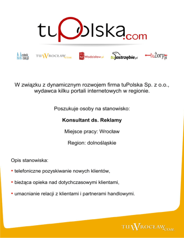W związku z dynamicznym rozwojem firma tuPolska Sp. z o.o., wydawca kilku portali internetowych w regionie. Poszukuje osoby na stanowisko: Konsultant ds. Reklamy Miejsce pracy: Wrocław Region: dolnośląskie Opis stanowiska: telefoniczne pozyskiwanie nowych klientów, bieżąca opieka nad dotychczasowymi klientami, umacnianie relacji z klientami i partnerami handlowymi. Wymagania: doświadczenie w sprzedaży - warunek konieczny, znajomość branży reklamowo-medialnej będzie dodatkowym atutem, umiejętność prowadzenia negocjacji handlowych, skuteczność podejmowanych działań, umiejętność diagnozowania potrzeb klienta i dostosowania oferty, znajomość metod pozyskiwania klientów i budowania długotrwałych relacji, kreatywne podejście do pozyskiwania klientów, znajomość i umiejętność wykorzystania programów pakietu MS Office, wykształcenie min. średnie, orientacja na osiągnięcia i wyniki, wysoka kultura osobista, odporność na stres i umiejętność pracy pod presją czasu. Oferujemy: pracę w największym medium regionalnym, pracę w młodym, entuzjastycznym zespole, precyzyjnie określone możliwości rozwoju zawodowego, możliwość realizacji własnych pomysłów, wynagrodzenie prowizyjne oraz transparenty system motywacyjny. Zainteresowane osoby prosimy o przesyłanie swojego CV wraz z listem motywacyjnym pod adres [email protected]. Skontaktujemy się tylko z wybranymi kandydatami."