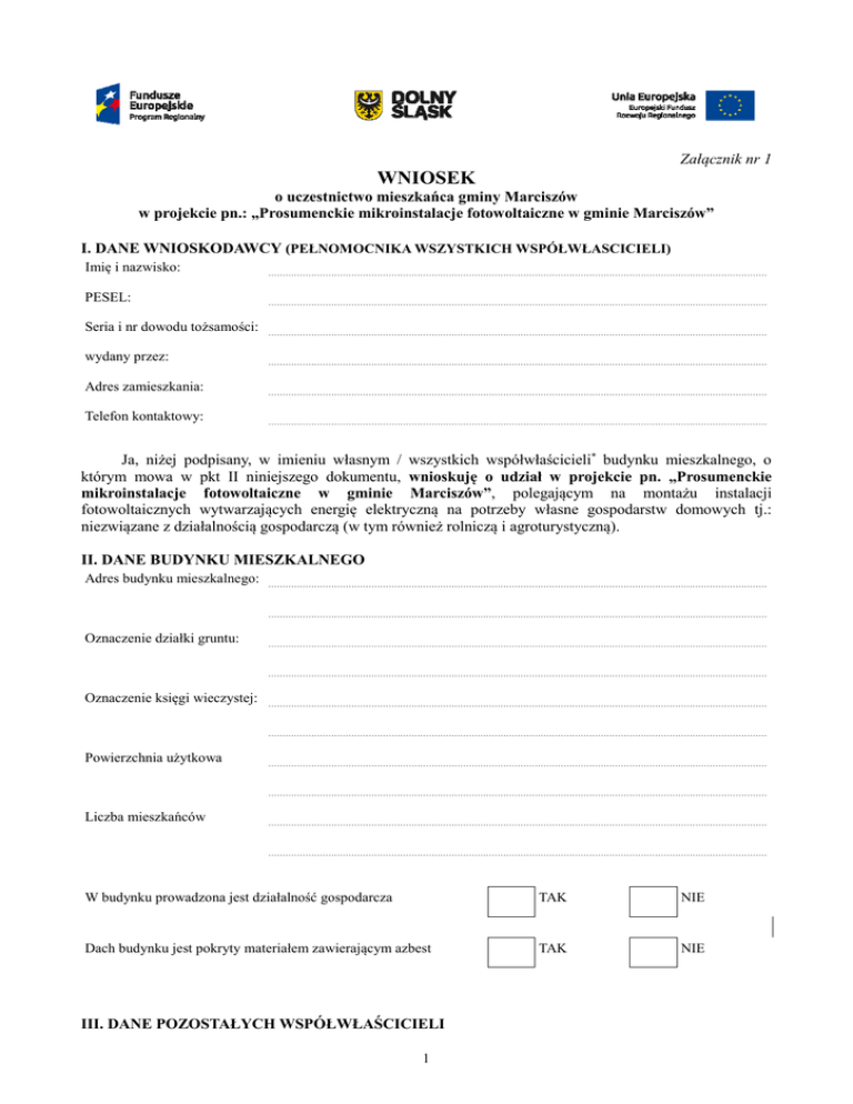 Załącznik nr 1 WNIOSEK o uczestnictwo mieszkańca gminy Marciszów w projekcie pn.: „Prosumenckie mikroinstalacje fotowoltaiczne w gminie Marciszów” I. DANE WNIOSKODAWCY (PEŁNOMOCNIKA WSZYSTKICH WSPÓŁWŁASCICIELI) Imię i nazwisko: ………………………………………………………………………………………………………………………………………………………… PESEL: ………………………………………………………………………………………………………………………………………………………… Seria i nr dowodu tożsamości: ………………………………………………………………………………………………………………………………………………………… wydany przez: ………………………………………………………………………………………………………………………………………………………… Adres zamieszkania: ………………………………………………………………………………………………………………………………………………………… Telefon kontaktowy: ………………………………………………………………………………………………………………………………………………………… Ja, niżej podpisany, w imieniu własnym / wszystkich współwłaścicieli* budynku mieszkalnego, o którym mowa w pkt II niniejszego dokumentu, wnioskuję o udział w projekcie pn. „Prosumenckie mikroinstalacje fotowoltaiczne w gminie Marciszów”, polegającym na montażu instalacji fotowoltaicznych wytwarzających energię elektryczną na potrzeby własne gospodarstw domowych tj.: niezwiązane z działalnością gospodarczą (w tym również rolniczą i agroturystyczną). II. DANE BUDYNKU MIESZKALNEGO Adres budynku mieszkalnego: ………………………………………………………………………………………………………………………………………………………… ………………………………………………………………………………………………………………………………………………………… Oznaczenie działki gruntu: ………………………………………………………………………………………………………………………………………………………… ………………………………………………………………………………………………………………………………………………………… Oznaczenie księgi wieczystej: ………………………………………………………………………………………………………………………………………………………… ………………………………………………………………………………………………………………………………………………………… Powierzchnia użytkowa ………………………………………………………………………………………………………………………………………………………… ………………………………………………………………………………………………………………………………………………………… Liczba mieszkańców ………………………………………………………………………………………………………………………………………………………… ………………………………………………………………………………………………………………………………………………………… W budynku prowadzona jest działalność gospodarcza TAK NIE Dach budynku jest pokryty materiałem zawierającym azbest TAK NIE III. DANE POZOSTAŁYCH WSPÓŁWŁAŚCICIELI 1 Współwłaściciel 1 Imię i nazwisko: ………………………………………………………………………………………………………………………………………………………… PESEL: ………………………………………………………………………………………………………………………………………………………… Seria i nr dowodu tożsamości: ………………………………………………………………………………………………………………………………………………………… wydany przez: ………………………………………………………………………………………………………………………………………………………… Adres zamieszkania: ………………………………………………………………………………………………………………………………………………………… ………………………………………………………………………………………………………………………………………………………… Współwłaściciel 2 Imię i nazwisko: ………………………………………………………………………………………………………………………………………………………… PESEL: ………………………………………………………………………………………………………………………………………………………… Seria i nr dowodu tożsamości: ………………………………………………………………………………………………………………………………………………………… wydany przez: ………………………………………………………………………………………………………………………………………………………… Adres zamieszkania: ……………………………………………………………