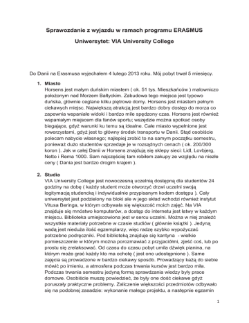 Sprawozdanie z wyjazdu w ramach programu ERASMUS Uniwersytet: VIA University College Do Danii na Erasmusa wyjechałem 4 lutego 2013 roku. Mój pobyt trwał 5 miesięcy. 1. Miasto Horsens jest małym duńskim miastem ( ok. 51 tys. Mieszkańców ) malowniczo położonym nad Morzem Bałtyckim. Zabudowa tego miejsca jest typowo duńska, głównie ceglane kilku piętrowe domy. Horsens jest miastem pełnym ciekawych miejsc. Największą atrakcją jest bardzo dobry dostęp do morza co zapewnia wspaniałe widoki i bardzo mile spędzony czas. Horsens jest również wspaniałym miejscem dla fanów sportu; wszędzie można spotkać osoby biegające, gdyż warunki ku temu są idealne. Całe miasto wypełnione jest rowerzystami, gdyż jest to główny środek transportu w Danii. Stąd osobiście polecam nabycie własnego; najlepiej zrobić to na samym początku semestru, ponieważ dużo studentów sprzedaje je w rozsądnych cenach ( ok. 200/300 koron ). Jak w całej Danii w Horsens znajdują się sklepy sieci: Lidl, Lovbjerg, Netto i Rema 1000. Sam najczęściej tam robiłem zakupy ze względu na niezłe ceny ( Dania jest bardzo drogim krajem ). 2. Studia VIA University College jest nowoczesną uczelnią dostępną dla studentów 24 godziny na dobę ( każdy student może otworzyć drzwi uczelni swoją legitymacją studencką i indywidualnie przypisanym kodem dostępu ). Cały uniwersytet jest podzielony na bloki ale w jego skład wchodzi również instytut Vitusa Beringa, w którym odbywała się większość moich zajęć. Na VIA znajduje się mnóstwo komputerów, a dostęp do internetu jest łatwy w każdym miejscu. Biblioteka umiejscowiona jest w sercu uczelni. Można w niej znaleźć wszystkie materiały potrzebne w czasie studiów ( głównie książki ). Jedyną wadą jest nieduża ilość egzemplarzy, więc radzę szybko wypożyczać potrzebne podręczniki. Pod biblioteką znajduje się kantyna - wielkie pomieszczenie w którym można porozmawiać z przyjaciółmi, zjeść coś, lub po prostu się zrelaksować. Od czasu do czasu pobyt umila dźwięk pianina, na którym może grać każdy kto ma ochotę ( jest ono udostępnione ). Same zajęcia są prowadzone w bardzo ciekawy sposób. Prowadzący każą do siebie mówić po imieniu, a atmosfera podczas trwania kursów jest bardzo miła. Podczas trwania semestru jedyną formą sprawdzania wiedzy były prace domowe. Osobiście muszę powiedzieć, że były one dość ciekawe gdyż poruszały praktyczne problemy. Zaliczenie większości przedmiotów odbywało się na podobnej zasadzie: wykonanie małego projektu, a następnie egzamin 1 ustny na jego podstawie. Poziom trudności egzaminów był porównywalny do tych na Politechnice Lubelskiej. 3. Życie studenckie Podczas trwania mojego pobytu mieszkałem w akademiku znajdującym się około 3 kilometry od uczelni, tak zwanej Kamjatce. W Horsens znajduje się jeszcze jeden kompleks mieszkań dla studentów, który znajduje się tuż przy uczelni ( Student Village ), lecz opłata za wynajęcie pokoju jest większa niż w przypadku Kamjatki ( ok. 415 euro miesięcznie w przypadku SV, 393 euro w Kamjatce ). W obu przypadkach mieszkania są dwu lub trzyosobowe i są one wyposażone we wszystkie potrzebne sprzęty ( kuchenka, mikrofalówka, lodówka, czajnik i sztućce ). Pokoje są nieduże ale wystarczająco zapewniają potrzebną przestrzeń do życia. W piwnicy budynku znajduje się pralnia z suszarnią. Aby z niej korzystać trzeba wykupić kartę pralniczą ( 50 koron ) a następnie wpłacić na nią chcianą ilość pieniędzy. Cena jednego prania to 10 koron, opłata za korzystanie z suszarki elektrycznej również 10 koron. W centrum kampusu znajduje się Common Room – miejsce spotkań studentów w którym odbywa się większość imprez. Na zewnątrz Common Roomu jest kilka ławek na których można się zrelaksować w słoneczny dzień. Na Kamjatce znaleźć można również świetnie wyposażoną siłownie która jest bezpłatnie udostępniona studentom. Tuż przy Common Roomie znajduje się biuro Drosselbo, w którym można załatwić wszystkie sprawy związane z pobytem na Kamjatce. Niedaleko drogi jest parking rowerowy. Należy pamiętać o oznaczeniu roweru ( naklejką, którą można otrzymać w biurze Drosselbo ), ponieważ pracownicy Drosselbo usuwają nieoznaczone. Przy VIA znajduje się bardzo dobrze wyposażona hala gimnastyczna. Każdy fan sportu znajdzie tu coś dla siebie, ja uczęszczałem na siatkówkę. Za wstęp na wszystkie zajęcia przez cały semestr, trzeba zapłacić ok. 400 koron ( jest to najbardziej opłacalne, ponieważ wstęp na jeden sport kosztuje ok. 300 koron ). 4. Atmosfera Atmosfera podczas pobytu na ERASMUSIE jest niesamowita. Ludzie są otwarci, można porozmawiać z każdym na każdy temat. Na VIA można spotkać osoby z całego świata. Największe imprezy odbywały się w klubie Crazy Daizy. Znajduje się on kilka minut od centrum Horsens i jest on przeznaczony głównie dla studentów ERASMUSA. Ciekawym miejscem spotkań jest Student Bar prowadzony przez samych studentów. Znajduje się on przy uczelni i jest świetnym miejscem na zawieranie nowych znajomości. Jak już wcześniej pisałem świetnym miejscem na wspólne spędzanie czasu jest również Common Room na Kamjatce. 2 5. Finanse Jak już wspomniałem, Dania jest bardzo drogim krajem. Szacunkowo można powiedzieć że wszystkie produkty są dwa razy droższe niż w Polsce ( szczególnie drogie jest mięso ). W moim przypadku praktycznie całe stypendium szło na mieszkanie ( 393 euro ) i na spokojny pobyt potrzebowałem średnio dodatkowych 400 złotych miesięcznie. Dlatego gorąco polecam poszukiwanie prywatnego mieszkania, zwłaszcza za pośrednictwem facebooka ( grupa Erasmus Horsens ), gdzie można uzyskać wiele pomocnych rad. 6. Podsumowanie Gorąco polecam wyjazd na program ERASMUS każdemu kto jest otwarty na ludzi i nie boi się zmian. Jest to nie tylko bardzo ciekawe doświadczen