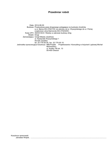 Przedmiar robót Data: 2014-08-30 Budowa: Przebudowa pasa drogowego polegająca na budowie chodnika w ul. Bema DG 270211W na odcinku od ul. Wyszyńskiego do ul. Polnej (częściowo ulica Ejsmonda DG 270234W) Kody CPV: 45233120-6 Roboty w zakresie budowy dróg Obiekt: Drogi Zamawiający: Urząd Miasta Józefowa ul. Kardynała Wyszyńskiego 1 05-420 Józefów tel. 22 779 00 00, fax. 22 779 00 15 Jednostka opracowująca kosztorys: MM-Projekt Projektowanie i Konsulting w Inżynierii Lądowej Michał Michniewicz ul. Krótka 7B lok. 13 05-400 Otwock Kosztorys opracowali: Jarosław Wójcik, ............................................................................................................................................................. Jozefow Przedmiar robót Podstawa nakładu, opis pozycji 1 ROBOTY DROGOWE 1.1 ROBOTY PRZYGOTOWAWCZE Ilosć Krot. Jedn. 1 Nr STWiOR: D-01.01.01 KNNR 1/111/1 Roboty pomiarowe przy liniowych robotach ziemnych, trasa dróg w terenie równinnym 2 Nr STWiOR: D-01.03.05 KNR 231/1406/3 Regulacja pionowa studzienek dla urządzeń podziemnych. Regulacja włazów kanałowych kanalizacja sanitarna. Regulacja wysokościowa studni i włazu kanałowego, 3 Nr STWiOR: D-01.02.04 KNNR 6/805/6 Rozebranie nawierzchni chodników z płyt betonowych, chodniki, na podsypce piaskowej, płyty 50x50x7·cm 4 Nr STWiOR: D-01.02.04 KNNR 6/803/3 Rozebranie nawierzchni zjazdów z kostki betonowej na podsypce cementowo-piaskowej, mechanicznie 5 Nr STWiOR: D-01.02.01 KNNR 1/102/5 Mechaniczne karczowanie, krzaki i podszycie średniej gęstości (od 31-60 % powierzchni) 1 km 14 szt 1 520 m2 650 m2 8 m2 840 m2 1 990 m2 855 m2 555 m3 2 845 m2 488 m2 2 478 m2 367 m2 635 m2 1.2 ROBOTY ZIEMNE 6 Nr STWiOR: D-01.02.02 KNNR 1/113/1 Usunięcie warstwy ziemi urodzajnej (humusu) za pomocą spycharek, grubość warstwy do 15·cm 7 Nr STWiOR: D-04.01.01 KNNR 6/101/3 (2) Korytowanie pod chodnik o sredniej głębokości - 15 cm 8 Nr STWiOR: D-04.01.01 KNNR 6/101/2 (1) Koryta wykonywane pod nawierzchnię zjazdów i chodnika mechanicznie, głębokość 30·cm, kategoria gruntu II-VI, 9 Nr STWiOR: D-02.01.01 KNNR 1/205/1 Transport i utylizacja nadmiaru urobku z korytowania i wykopu na odległośc do 5 km 1.3 PODBUDOWY 10 Nr STWiOR: D-04.01.01 KNNR 6/103/3 (1) Profilowanie i zagęszczanie podłoża pod warstwy konstrukcyjne nawierzchni, wykonywane mechanicznie, kategoria gruntu II-VI, walec wibracyjny 11 Nr STWiOR: D-04.02.01 KNNR 6/104/3 Warstwy odsączające z kruszyw naturalnych (pospółki) 0-63mm(mechaniczne zagęszczenie), wykonanie mechaniczne, grubość po zagęszczeniu 15·cm na zjazdach 12 Nr STWiOR: D-04.04.02 KNNR 6/113/1 WARSTWA PODBUDOWY Z MIESZANKI KRUSZYWA ŁAMANEGO 0-31,5 mm STABILIZOWANEGO MECHANICZNIE GR. 15 cm NA CHODNIKU I ZJAZDACH 13 Nr STWiOR: D-04.04.02 KNNR 6/113/3 Podbudowy pod zjazdami i chodniku wzmocnionym z kruszyw łamanych,0-63 mm warstwa dolna, po zagęszczeniu 30·cm 1.4 ODWODNIENIE 14 Nr STWiOR: D-03.03.02 KNNR 6/113/3 Pobocze chłonne z kruszyw łamanych,31,5-63 mm warstwa dolna, po zagęszczeniu 40·cm strona nr: 30.08.2014 2 Zuzia (C) DataComp 1994-2009(lic. 27105) Jozefow Podstawa nakładu, opis pozycji Ilosć Krot. Jedn. 15 Nr STWiOR: D-03.03.02 KNR AT-04 0101-01 Oplot pobocza chłonnego z geowłókniny 16 Nr STWiOR: D-03.03.02 KNNR 6/113/5 Zasypanie pobocza chłonnego klińcem 16/31,5 gł. 10cm 2 000 m2 635 m2 790 m2 65 m2 1 940 m2 50 m2 215 m 950 m 1 400 m 70 m 350 m3 350 m2 1.5 NAWIERZCHNIE 17 Nr STWiOR: D-05.03.23 KNR AT-03 0304-03 Nawierzchnia zjazdów z kostki brukowej betonowej (behaton bezfazowa kol.grafit) gr. 8 cm układana mechanicznie na podsypce cementowo-piaskowej 3 cm 18 Nr STWiOR: D-05.03.23 KNNR 6/502/3 (1) Nawierzchnia chodników wzmocnionych z kostki betonowej (prostokątna, bezfazowa kol. szary) gr. 8 cm. Na podsypce cem-piask 3 cm. 19 Nr STWiOR: D-05.03.23 KNNR 6/502/2 (1) Nawierzchnia chodników z kostki betonowej (prostokątna, bezfazowa kol. szary) gr. 6 cm. Na podsypce cem-piask 3 cm. 20 Nr STWiOR: D-05.03.23 KNNR 6/503/3 Nawierzchnia z płyt bet. 40x40 z wypustkami kol. Żółty 1.6 ROBOTY LINIOWE 21 Nr STWiOR: D-08.01.01 KNNR 6/403/3 Krawężniki wraz z wykonaniem ław, betonowe wystające 15x30·cm, ława betonowa bet. C12/15, podsypka cementowo-piaskowa 22 Nr STWiOR: D-08.01.01 KNNR 6/403/3 Krawężniki wraz z wykonaniem ław, betonowe wtopione 15x30·cm, ława betonowa bet. C12/15, podsypka cementowo-piaskowa 23 Nr STWiOR: D-08.03.01 KNNR 6/404/4 Obrzeża betonowe, 30x8·cm, podsypka piaskowa, wypełnienie spoin zaprawą cementową 24 Nr STWiOR: D-08.01.01 KNNR 6/608/4 Ściek przykrawężnikowy z 3 rzędów kostki bet. Prostokątnej. 1.7 HUMUSOWANIE 25 Nr STWiOR: D-09.01.01 KNR 221/218/2 Humusowanie poboczy na powierzchni 280 m2 gr. 10 cm 26 Nr STWiOR: D-09.01.01 KNR 221/401/5 Obsianie poboczy trawą, z nawożeniem, kategoria gruntu III Spis działów Lp. Nr CPV 1.1 1.2 1.3 1.4 1.5 1.6 1.7 strona nr: 30.08.2014 Opis ROBOTY PRZYGOTOWAWCZE ROBOTY ZIEMNE PODBUDOWY ODWODNIENIE NAWIERZCHNIE ROBOTY LINIOWE HUMUSOWANIE 3 Zuzia (C) DataComp 1994-2009(lic. 27105) ROBOTY DROGOWE