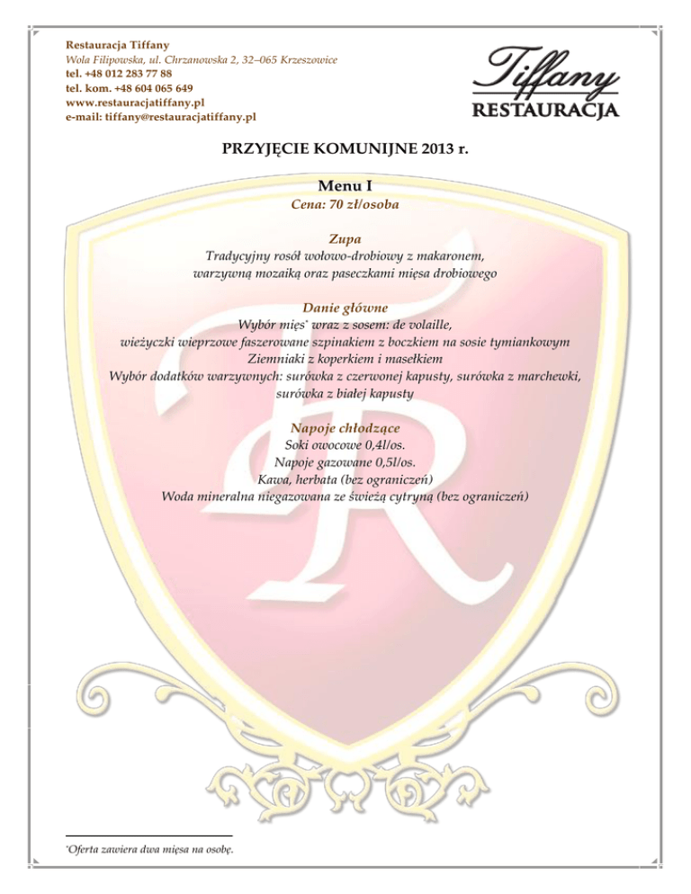 Restauracja Tiffany Wola Filipowska, ul. Chrzanowska 2, 32–065 Krzeszowice tel. +48 012 283 77 88 tel. kom. +48 604 065 649 www.restauracjatiffany.pl e-mail: [email protected] PRZYJĘCIE KOMUNIJNE 2013 r. Menu I Cena: 70 zł/osoba Zupa Tradycyjny rosół wołowo-drobiowy z makaronem, warzywną mozaiką oraz paseczkami mięsa drobiowego Danie główne Wybór mięs* wraz z sosem: de volaille, wieżyczki wieprzowe faszerowane szpinakiem z boczkiem na sosie tymiankowym Ziemniaki z koperkiem i masełkiem Wybór dodatków warzywnych: surówka z czerwonej kapusty, surówka z marchewki, surówka z białej kapusty Napoje chłodzące Soki owocowe 0,4l/os. Napoje gazowane 0,5l/os. Kawa, herbata (bez ograniczeń) Woda mineralna niegazowana ze świeżą cytryną (bez ograniczeń) Oferta zawiera dwa mięsa na osobę. * Restauracja Tiffany Wola Filipowska, ul. Chrzanowska 2, 32–065 Krzeszowice tel. +48 012 283 77 88 tel. kom. +48 604 065 649 www.restauracjatiffany.pl e-mail: [email protected] PRZYJĘCIE KOMUNIJNE 2013 r. Menu II Cena: 110 zł/osoba Zupa Tradycyjny rosół wołowo-drobiowy z makaronem, warzywną mozaiką oraz paseczkami mięsa drobiowego Danie główne Wybór mięs wraz z sosem: de volaille, kotlet po parysku, wieżyczki wieprzowe faszerowane szpinakiem z boczkiem na sosie tymiankowym Ziemniaki z koperkiem i masełkiem Wybór dodatków warzywnych: surówka z czerwonej kapusty, surówka z marchewki, surówka z białej kapusty *† Wybór zimnych przekąsek Plater mięs pieczystych oraz wędlin Duet koreczków śledziowych w oleju, rolmops Sałatka caprese zroszona pesto Sałatka pieczarkowa z jajkiem Sałatka jarzynowa Tymbaliki drobiowe Jajka faszerowane Ryba po grecku Masło Wybór pieczywa Napoje chłodzące Soki owocowe 0,4l/os. Napoje gazowane 0,5l/os. Kawa, herbata (bez ograniczeń) Woda mineralna niegazowana ze świeżą cytryną (bez ograniczeń) * Oferta zawiera trzy mięsa na osobę. Restauracja Tiffany Wola Filipowska, ul. Chrzanowska 2, 32–065 Krzeszowice tel. +48 012 283 77 88 tel. kom. +48 604 065 649 www.restauracjatiffany.pl e-mail: [email protected] PRZYJĘCIE KOMUNIJNE 2013 r. Menu III Cena: 125 zł/osoba Zupa Tradycyjny rosół wołowo-drobiowy z makaronem, warzywną mozaiką oraz paseczkami mięsa drobiowego Danie główne Wybór mięs wraz z sosem: de volaille, kotlet po parysku, wieżyczki wieprzowe faszerowane szpinakiem z boczkiem z sosem tymiankowym Ziemniaki z koperkiem i masełkiem Wybór dodatków warzywnych: surówka z czerwonej kapusty, surówka z marchewki, surówka z białej kapusty *‡ Wybór zimnych przekąsek Plater mięs pieczystych oraz wędlin Duet koreczków śledziowych w oleju, rolmops Sałatka caprese zroszona pesto Sałatka pieczarkowa z jajkiem Sałatka jarzynowa Tymbaliki drobiowe Jajka faszerowane Ryba po grecku Masło Wybór pieczywa Gorąca kolacja Gulasz po cygańsku z kluseczką śląską Napoje chłodzące Soki owocowe 0,4l/os. Napoje gazowane 0,5l/os. Kawa, herbata (bez ograniczeń) Woda mineralna niegazowana ze świeżą cytryną (bez ograniczeń) * Oferta zawiera trzy mięsa na osobę. Restauracja Tiffany Wola Filipowska, ul. Chrzanowska 2, 32–065 Krzeszowice tel. +48 012 283 77 88 tel. kom. +48 604 065 649 www.restauracjatiffany.pl e-mail: [email protected] Dodatkowe pakiety 2013 r. Przystawka Bruschette z mozzarellą, szynką parmeńską oraz pomidorami cena: 12 zł/osoba Galantyna z kurczęcia z musem chrzanowym cena: 10 zł/osoba Schab z warzywami w galarecie z sosem tatarskim cena: 12 zł/osoba Roladki z łososiem wędzonym w cieście naleśnikowym na sosie kaparowym cena: 15 zł/osoba Deser Puchar lodowy z musem malinowym oraz bitą śmietaną cena: 10 zł/osoba Porcjowane owoce sezonowe (eksponowane na paterach) cena: 6 zł/osoba Pakiet deserowy Ciasteczka koktajlowe 80g/os. Tort komunijny (standard) 100g/os. Wybór ciast: 4 smaki do wyboru 150g/os. cena: 23 zł/osoba Dopuszczamy opcje wniesienia własnego ciasta oraz tortu z udokumentowanego, pewnego źródła (należy przedstawić kopię dowodu zakupu lub podpisać stosowne oświadczenie). W pakiecie wliczony jest wystrój stołów udekorowanych m.in. naturalnymi kwiatami, serwetami w dowolnej kompozycji (dekoracja standard). W przypadku posiłku dla dzieci: do 3 lat – GRATIS! od 4–12 lat – zniżka 50% powyżej 13 lat – 100% (pełnopłatny) Z poważaniem, Agnieszka Sobczyńska Manager
