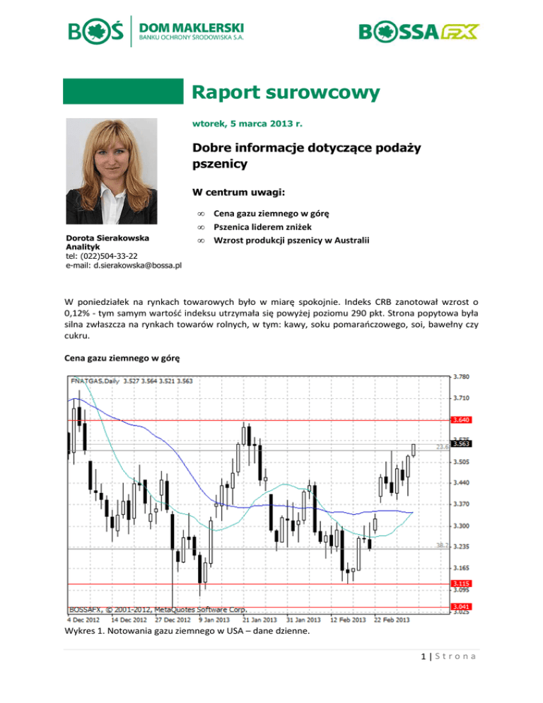 Raport surowcowy wtorek, 5 marca 2013 r. Dobre informacje dotyczące podaży pszenicy W centrum uwagi: Dorota Sierakowska Analityk tel: (022)504-33-22 e-mail: [email protected] • • • Cena gazu ziemnego w górę Pszenica liderem zniżek Wzrost produkcji pszenicy w Australii W poniedziałek na rynkach towarowych było w miarę spokojnie. Indeks CRB zanotował wzrost o 0,12% - tym samym wartość indeksu utrzymała się powyżej poziomu 290 pkt. Strona popytowa była silna zwłaszcza na rynkach towarów rolnych, w tym: kawy, soku pomarańczowego, soi, bawełny czy cukru. Cena gazu ziemnego w górę Wykres 1. Notowania gazu ziemnego w USA – dane dzienne. 1|Strona Wczoraj sporo podrożał także gaz ziemny – jego cena w USA wzrosła o ponad 2%, wybijając się ponad 3,50 USD za mln BTU. Stronie popytowej na tym rynku sprzyjają ostatnio prognozy niższych niż zazwyczaj temperatur we wschodniej części Stanów Zjednoczonych, które mają wzmagać popyt na gaz ziemny w celach grzewczych. Dzisiaj rano notowania gazu ziemnego nadal kierują się na północ. Cena surowca jest obecnie najwyższa od drugiej połowy stycznia br. Najbliższym istotnym poziomem oporu jest okolica 3,64 USD za mln BTU, wyznaczona przez lokalny szczyt z 21-22 stycznia br. Pszenica liderem zniżek Chociaż nastroje na rynkach towarów rolnych były raczej optymistyczne, nie dotyczyło to wszystkich towarów. Podaż przeważała na rynku pszenicy – wczoraj notowania tego zboża spadły o 2,5%, co było najgorszym wynikiem wśród wszystkich towarów. Spadek cen pszenicy to efekt m.in. poprawiających się warunków pogodowych w USA. Na wielu terenach uprawy pszenicy ozimej spadły spore opady śniegu – obecnie topniejący śnieg nawilża glebę, co jest korzystne dla upraw pszenicy, wcześniej dotkniętych suszami. Wczoraj amerykański Departament Rolnictwa (USDA) opublikował cotygodniowe dane dotyczące kondycji zbóż, które były optymistyczne. W stanie Kansas – w którym produkuje się najwięcej pszenicy ozimej – o 1% wzrósł odsetek upraw o kondycji dobrej lub bardzo dobrej (z 23% do 24%). Natomiast w stanie Oklahoma udział ten wzrósł aż o 7%, do 16% z wcześniejszych 9%. Wzrost produkcji pszenicy w Australii Tymczasem dzisiaj notowania pszenicy rozpoczęły dzień na stabilnym poziomie, tuż powyżej 700 USD za 100 buszli. Próbę odbicia w górę utrudniają informacje z Australii, które pojawiły się dzisiaj w nocy. Australijska instytucja ABARES (Australian Bureau of Agriculture and Resource Economics and Sciences) poinformowała, że produkcja pszenicy w tym kraju w sezonie 2013/2014 ma być o 13% większa niż we wcześniejszym sezonie i znaleźć się na poziomie 24,9 mln ton. Australia jest jednym z najważniejszych eksporterów pszenicy na świecie, razem ze Stanami Zjednoczonymi, Kanadą i Unią Europejską. Dobre zbiory w nadchodzącym sezonie mają być rezultatem zwiększonego areału upraw oraz lepszej jakości zboża. Jeśli nie pojawią się jakieś dodatkowe komunikaty dotyczące prognoz produkcji pszenicy, to dzisiejsza sesja na tym rynku może być spokojna. Dla dalszego kształtowania się cen pszenicy ważne mogą być dopiero kolejne raporty amerykańskiego Departamentu Rolnictwa, które pojawią się w drugiej części tygodnia: w czwartek opublikowane zostaną cotygodniowe dane dotyczące eksportu zbóż z USA, natomiast w piątek pojawi się comiesięczny raport USDA, dotyczący produkcji i zapasów zbóż w USA i na świecie. Do tego czasu na rynku możemy obserwować konsolidację cen pszenicy. 2|Strona Wykres 2. Notowania pszenicy – dane dzienne. ---Prezentowany raport został przygotowany w Wydziale Doradztwa i Analiz Rynkowych Domu Maklerskiego Banku Ochrony Środowiska S.A. z siedzibą w Warszawie tylko i wyłącznie w celach informacyjnych i nie stanowi analizy inwestycyjnej, ani analizy finansowej ani rekomendacji w rozumieniu przepisów Rozporządzenia Ministra Finansów z dnia 19 października 2005r. (Dz.U. 2005, poz. 206 nr 1715) oraz Ustawy z dnia 29 lipca 2005r. (Dz.U. 2005, Nr 183, poz. 1538 z późn. zm.). Przedstawiony raport jest wyłącznie wyrazem wiedzy i poglądów autora według stanu na dzień sporządzenia i w żadnym wypadku nie może być podstawą działań inwestycyjnych Klienta. Przy sporządzaniu raportu DM BOŚ SA działał z należytą starannością oraz rzetelnością. DM BOŚ SA i jego pracownicy nie ponoszą jednak odpowiedzialności za działania lub zaniechania Klienta podjęte na podstawie niniejszego raportu ani za szkody poniesione w wyniku tych decyzji inwestycyjnych. Niniejszy raport adresowany jest do nieograniczonego kręgu odbiorców. Został sporządzony na potrzeby klientów DM BOŚ S.A. oraz innych osób zainteresowanych. Nadzór nad DM BOŚ SA sprawuje Komisja Nadzoru Finansowego. Regulaminy doradztwa inwestycyjnego i sporządzania analiz inwestycyjnych, analiz finansowych oraz innych rekomendacji o charakterze ogólnym dotyczących transakcji w zakresie instrumentów finansowych oraz instrumentów bazowych instrumentów pochodnych znajdują się na stronie internetowej bossa.pl w dziale Dokumenty. 3|Strona