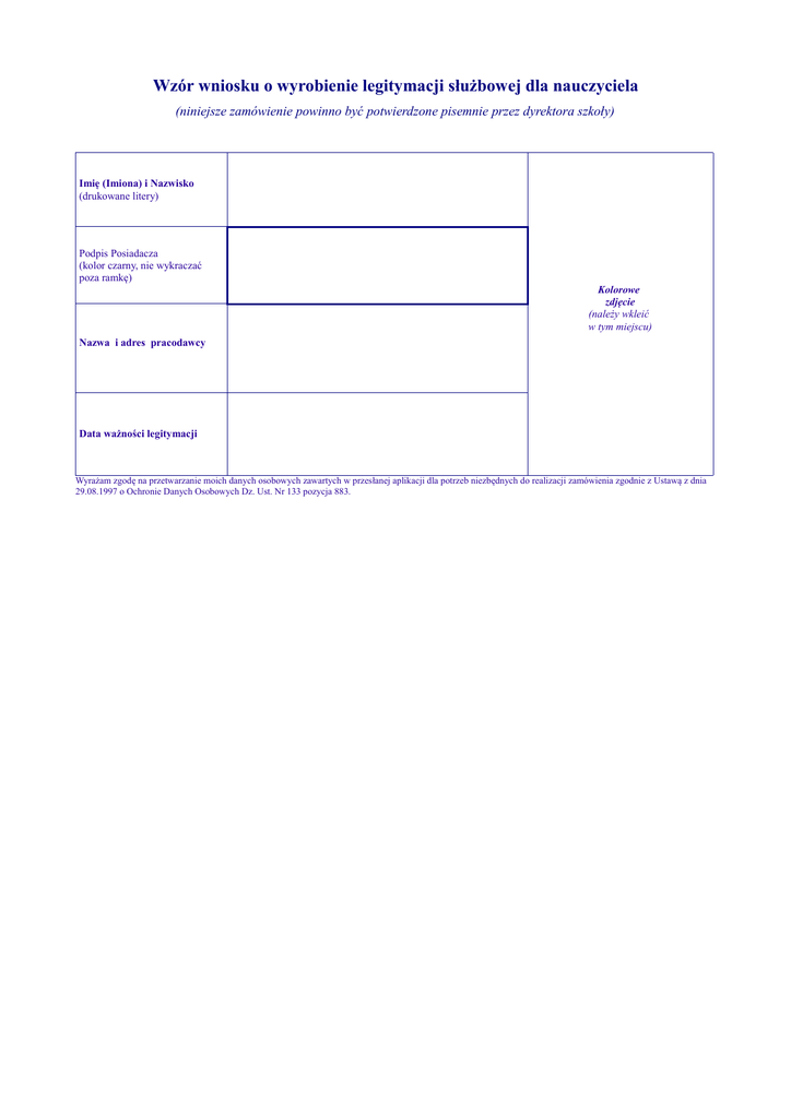 Wzór wniosku o wyrobienie legitymacji służbowej dla nauczyciela (niniejsze zamówienie powinno być potwierdzone pisemnie przez dyrektora szkoły) Imię (Imiona) i Nazwisko (drukowane litery) Podpis Posiadacza (kolor czarny, nie wykraczać poza ramkę) Kolorowe zdjęcie (należy wkleić w tym miejscu) Nazwa i adres pracodawcy Data ważności legitymacji Wyrażam zgodę na przetwarzanie moich danych osobowych zawartych w przesłanej aplikacji dla potrzeb niezbędnych do realizacji zamówienia zgodnie z Ustawą z dnia 29.08.1997 o Ochronie Danych Osobowych Dz. Ust. Nr 133 pozycja 883.
