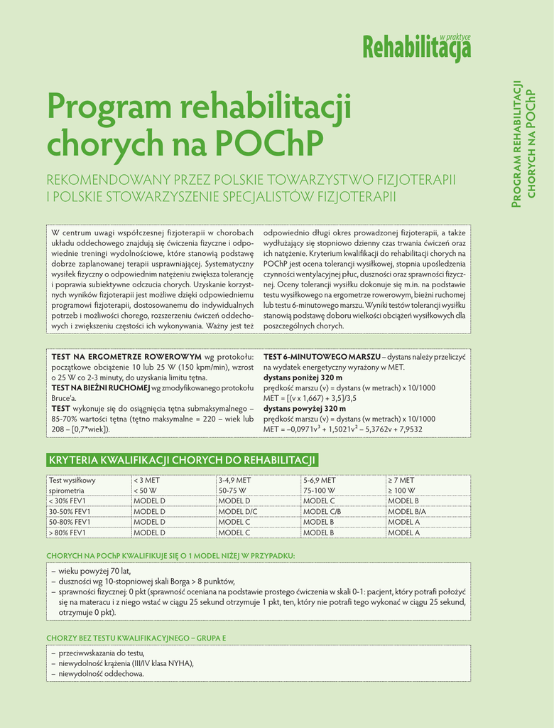 Program rehabilitacji chorych na POChP REKOMENDOWANY PRZEZ POLSKIE TOWARZYSTWO FIZJOTERAPII I POLSKIE STOWARZYSZENIE SPECJALISTÓW FIZJOTERAPII W centrum uwagi współczesnej fizjoterapii w chorobach układu oddechowego znajdują się ćwiczenia fizyczne i odpowiednie treningi wydolnościowe, które stanowią podstawę dobrze zaplanowanej terapii usprawniającej. Systematyczny wysiłek fizyczny o odpowiednim natężeniu zwiększa tolerancję i poprawia subiektywne odczucia chorych. Uzyskanie korzystnych wyników fizjoterapii jest możliwe dzięki odpowiedniemu programowi fizjoterapii, dostosowanemu do indywidualnych potrzeb i możliwości chorego, rozszerzeniu ćwiczeń oddechowych i zwiększeniu częstości ich wykonywania. Ważny jest też odpowiednio długi okres prowadzonej fizjoterapii, a także wydłużający się stopniowo dzienny czas trwania ćwiczeń oraz ich natężenie. Kryterium kwalifikacji do rehabilitacji chorych na POChP jest ocena tolerancji wysiłkowej, stopnia upośledzenia czynności wentylacyjnej płuc, duszności oraz sprawności fizycznej. Oceny tolerancji wysiłku dokonuje się m.in. na podstawie testu wysiłkowego na ergometrze rowerowym, bieżni ruchomej lub testu 6-minutowego marszu. Wyniki testów tolerancji wysiłku stanowią podstawę doboru wielkości obciążeń wysiłkowych dla poszczególnych chorych. TEST NA ERGOMETRZE ROWEROWYM wg protokołu: początkowe obciążenie 10 lub 25 W (150 kpm/min), wzrost o 25 W co 2-3 minuty, do uzyskania limitu tętna. TEST NA BIEŻNI RUCHOMEJ wg zmodyfikowanego protokołu Bruce’a. TEST wykonuje się do osiągnięcia tętna submaksymalnego – 85-70% wartości tętna (tętno maksymalne = 220 – wiek lub 208 – [0,7*wiek]). TEST 6-MINUTOWEGO MARSZU – dystans należy przeliczyć na wydatek energetyczny wyrażony w MET. dystans poniżej 320 m prędkość marszu (v) = dystans (w metrach) x 10/1000 MET = [(v x 1,667) + 3,5]/3,5 dystans powyżej 320 m prędkość marszu (v) = dystans (w metrach) x 10/1000 MET = –0,0971v³ + 1,5021v² – 5,3762v + 7,9532 KRYTERIA KWALIFIKACJI CHORYCH DO REHABILITACJI Test wysiłkowy spirometria < 30% FEV1 30-50% FEV1 50-80% FEV1 > 80% FEV1 < 3 MET < 50 W MODEL D MODEL D MODEL D MODEL D 3-4,9 MET 50-75 W MODEL D MODEL D/C MODEL C MODEL C 5-6,9 MET 75-100 W MODEL C MODEL C/B MODEL B MODEL B ≥ 7 MET ≥ 100 W MODEL B MODEL B/A MODEL A MODEL A CHORYCH NA POChP KWALIFIKUJE SIĘ O 1 MODEL NIŻEJ W PRZYPADKU: – wieku powyżej 70 lat, – duszności wg 10-stopniowej skali Borga > 8 punktów, – sprawności fizycznej: 0 pkt (sprawność oceniana na podstawie prostego ćwiczenia w skali 0-1: pacjent, który potrafi położyć się na materacu i z niego wstać w ciągu 25 sekund otrzymuje 1 pkt, ten, który nie potrafi tego wykonać w ciągu 25 sekund, otrzymuje 0 pkt). CHORZY BEZ TESTU KWALIFIKACYJNEGO – GRUPA E – przeciwwskazania do testu, – niewydolność krążenia (III/IV klasa NYHA), – niewydolność oddechowa. Program rehabilitacji chorych na POChP w praktyce