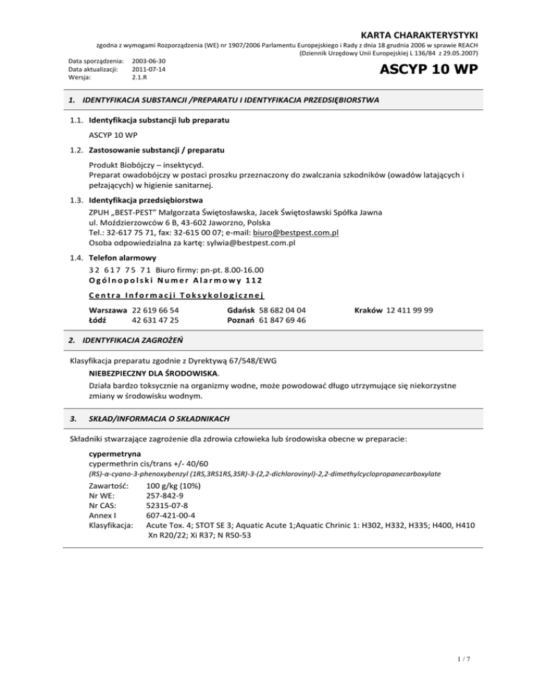 KARTA CHARAKTERYSTYKI zgodna z wymogami Rozporządzenia (WE) nr 1907/2006 Parlamentu Europejskiego i Rady z dnia 18 grudnia 2006 w sprawie REACH (Dziennik Urzędowy Unii Europejskiej L 136/84 z 29.05.2007) Data sporządzenia: 2003-06-30 Data aktualizacji: 2011-07-14 Wersja: 2.1.R ASCYP 10 WP 1. IDENTYFIKACJA SUBSTANCJI /PREPARATU I IDENTYFIKACJA PRZEDSIĘBIORSTWA 1.1. Identyfikacja substancji lub preparatu ASCYP 10 WP 1.2. Zastosowanie substancji / preparatu Produkt Biobójczy – insektycyd. Preparat owadobójczy w postaci proszku przeznaczony do zwalczania szkodników (owadów latających i pełzających) w higienie sanitarnej. 1.3. Identyfikacja przedsiębiorstwa ZPUH „BEST-PEST” Małgorzata Świętosławska, Jacek Świętosławski Spółka Jawna ul. Moździerzowców 6 B, 43-602 Jaworzno, Polska Tel.: 32-617 75 71, fax: 32-615 00 07; e-mail: [email protected] Osoba odpowiedzialna za kartę: [email protected] 1.4. Telefon alarmowy 3 2 6 1 7 7 5 7 1 Biuro firmy: pn-pt. 8.00-16.00 Ogólnopolski Numer Alarmowy 112 Centra Informacji Toksykologicznej Warszawa 22 619 66 54 Łódź 42 631 47 25 Gdaosk 58 682 04 04 Poznao 61 847 69 46 Kraków 12 411 99 99 2. IDENTYFIKACJA ZAGROŻEO Klasyfikacja preparatu zgodnie z Dyrektywą 67/548/EWG NIEBEZPIECZNY DLA ŚRODOWISKA. Działa bardzo toksycznie na organizmy wodne, może powodowad długo utrzymujące się niekorzystne zmiany w środowisku wodnym. 3. SKŁAD/INFORMACJA O SKŁADNIKACH Składniki stwarzające zagrożenie dla zdrowia człowieka lub środowiska obecne w preparacie: cypermetryna cypermethrin cis/trans +/- 40/60 (RS)-α-cyano-3-phenoxybenzyl (1RS,3RS1RS,3SR)-3-(2,2-dichlorovinyl)-2,2-dimethylcyclopropanecarboxylate Zawartośd: Nr WE: Nr CAS: Annex I Klasyfikacja: 100 g/kg (10%) 257-842-9 52315-07-8 607-421-00-4 Acute Tox. 4; STOT SE 3; Aquatic Acute 1;Aquatic Chrinic 1: H302, H332, H335; H400, H410 Xn R20/22; Xi R37; N R50-53 1/7 KARTA CHARAKTERYSTYKI zgodna z wymogami Rozporządzenia (WE) nr 1907/2006 Parlamentu Europejskiego i Rady z dnia 18 grudnia 2006 w sprawie REACH (Dziennik Urzędowy Unii Europejskiej L 136/84 z 29.05.2007) Data sporządzenia: 2003-06-30 Data aktualizacji: 2011-07-14 Wersja: 2.1.R ASCYP 10 WP 4. PIERWSZA POMOC Opis środków pierwszej pomocy Narażenie inhalacyjne Usunąd poszkodowanego z zasięgu narażenia, zapewnid mu dostęp świeżego powietrza i spoczynek. Jeśli oddychanie jest utrudnione podad tlen i wezwad lekarza. Skażenie skóry Zdjąd całą skażoną odzież. Obmyd skórę wodą, a następnie wodą i mydłem. Skażoną odzież należy uprad przed ponownym założeniem. Skażenie oka Przemywad odpowiednim płynem do przemywania oczu lub czystą wodą, utrzymując powieki otwarte, przez co najmniej 10 minut. Następnie udad się do lekarza. Po spożyciu Dokładnie wypłukad usta wodą (nie podawad do picia mleka, oleju ani alkoholu). Skontaktowad się z lekarzem, pokazad etykietę preparatu. Najważniejsze ostre i opóźnione objawy oraz skutki narażenia Bóle lub zawroty głowy, nudności, wymioty, podrażnienie, zaczerwienienie skóry, odczyny uczuleniowe, katar, objawy astmatyczne. Informacja dotycząca pierwszej pomocy dla lekarzy Cypermetryna należy do toksyn kanałów sodowych, powoduje obniżenie progu pobudzenia nerwów czuciowych i przedłużone pobudzenie neuronalne. Antidotum - brak. Stosowad leczenie objawowe. Ośrodki Toksykologiczne w Polsce: patrz punkt 16 karty 5. POSTĘPOWANIE W PRZYPADKU POŻARU Zalecenia ogólne Usunąd z zagrożonego obszaru osoby niepowołane, niebiorące udziału w likwidowaniu pożaru. Usunąd źródła zapłonu, nie palid. W razie potrzeby wezwad Straż Pożarną tel. 998. Nie dopuszczad do przedostania się substancji do kanalizacji, zbiorników i cieków wodnych. Środki gaśnicze Właściwe środki gaśnicze Gaśnice pianowe, śniegowe (CO2), proszkowe lub mgła wodna Niewłaściwe środki gaśnicze Nie stosowad wody w formie silnego strumienia wodnego. Spływającą wodę ograniczad, np. tymczasową barierą ziemną. Szczególe zagrożenia związane z preparatem W wyniku pożaru mogą powstawad toksyczne gazy i opary Informacje dla straży pożarnej Stosowad odzież ochronną oraz niezależny aparat do oddychania. 2/7 KARTA CHARAKTERYSTYKI zgodna z wymogami Rozporządzenia (WE) nr 1907/2006 Parlamentu Europejskiego i Rady z dnia 18 grudnia 2006 w sprawie REACH (Dziennik Urzędowy Unii Europejskiej L 136/84 z 29.05.2007) Data sporządzenia: 2003-06-30 Data aktualizacji: 2011-07-14 Wersja: 2.1.R ASCYP 10 WP 6. POSTĘPOWANIE W PRZYPADKU NIEZAMIERZONEGO UWOLNIENIA DO ŚRODOWISKA Indywidualne środki ostrożności Unikad kontaktu ze skórą i oczami. Stosowad odzież ochronną (roboczą, chroniąca przed zabrudzeniem), rękawice (gumowe lub tworzywowe), ochronę twarzy (maska przeciwpyłowa). Środki ostrożności w zakresie ochrony środowiska Nie wprowadzad do kanalizacji. Unikad zanieczyszczenia wód powierzchniowych i gruntowych. W przypadku skażenia rzek lub jezior powiadomid odpowiednie służby ratownicze. Metody oczyszczania Zlokalizowad i zabezpieczyd wysyp. Zabezpieczyd teren i przystąpid do usuwania awarii. Zmieśd, a najlepiej zebrad odkurzaczem produkt, wykorzystując sprzęt wyposażony w filtr przeciwpyłowy. Przenieśd zebrany materiał do odpowiedniego plastikowego pojemnika, oznakowad i przechowywad bezpiecznie do czasu usunięcia. Wywietrzyd teren i zmyd miejsce awarii po zupełnym zebraniu materiału. Usuwad zgodnie z p. 13 karty charakterystyki. 7. POSTĘPOWANIE Z SUBSTANCJĄ/PREPARATEM I JEJ/JEGO MAGAZYNOWANIE 7.1. Postępowanie z substancją/preparatem Brak szczególnych zaleceo. Przestrzegad zasad i przepisów BHP dotyczących pracy z chemikaliami. Unikad zanieczyszczenia skóry i oczu, nie wdychad pyłu. Nie jeśd, nie pid i nie palid tytoniu podczas stosowania produktu. Środki ochrony indywidualnej – patrz pkt 8. 7.2. Magazynowanie Przechowywad w oryginalnym, szczelnie zamkniętym opakowaniu w wentylowanym i suchym pomieszczen