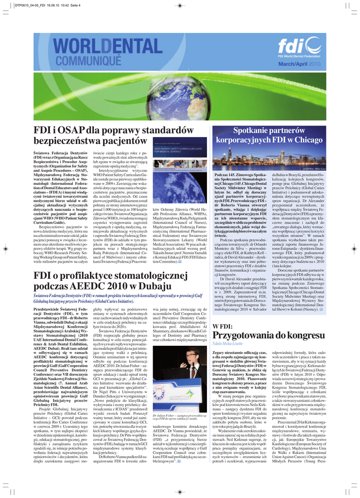 DTP0610_04-05_FDI 16.06.10 10:42 Seite 4 FDI i OSAP dla poprawy standardów bezpieczeństwa pacjentów Światowa Federacja Dentystów (FDI) wraz z Organizacją na Rzecz Bezpieczeństwa i Procedur Aseptycznych (Organization for Safety and Asepsis Procedures – OSAP), Międzynarodową Federacją Stowarzyszeń Edukacyjnych w Stomatologii (International Federation of Dental Educators and Associations – IFDEA) i innymi wiodącymi światowymi towarzystwami medycznymi bierze udział w oficjalnej aktualizacji wytycznych dotyczących nauczania o bezpieczeństwie pacjentów pod auspicjami WHO (WHO Patient Safety Curriculum Guide). Bezpieczeństwo pacjentów to nowa dziedzina medycyny, która ma na celu minimalizowanie szkód, jakie pacjenci ponoszą w związku z leczeniem oraz określenie możliwości poprawy efektów terapii. Wg grupy roboczej WHO Research Priority Setting Working Group on Patient Safety, wiele milionów pacjentów na całym świecie cierpi każdego roku z powodu poważnych strat zdrowotnych lub zgonu w związku ze stwarzającą zagrożenie opieką medyczną”. Interdyscyplinarne wytyczne WHO Patient Safety Curriculum Guide zostały po raz pierwszy opublikowane w 2009 r. Zawierają one wskazówki dotyczące nauczania o bezpieczeństwie pacjentów, przeznaczone dla uczelni medycznych. Od czasu pierwszej publikacji dokument został pobrany ze strony internetowej przez ponad 1.000 instytucji ze 100 krajów całego świata. Światowa Organizacja Zdrowia (WHO), świadoma rosnącej częstości występowania zagrożeń związanych z opieką medyczną, zainicjowała aktualizację wytycznych i zaprosiła Światową Federację Dentystów (FDI) do udziału w tym projekcie na prawach strategicznego partnera wraz z Międzynarodową Radą Położnych (International Council of Midwives) i innymi członkami Światowej Federacji Pracowni- (DTI/Fot.: Mike Liu) ków Ochrony Zdrowia (World Health Professions Alliance, WHPA), Międzynarodową Radą Pielęgniarek (International Council of Nurses), Międzynarodową Federacją Farmaceutyczną (International Pharmaceutical Federation) oraz Światowym Stowarzyszeniem Lekarzy (World Medical Association). W pracach aktualizacyjnych udział wezmą prof. Takashi Inoue i prof. Nermin Yamalik z Komisji Edukacji FDI (FDI Education Committee). FDI FDI o profilaktyce stomatologicznej podczas AEEDC 2010 w Dubaju Światowa Federacja Dentystów (FDI) w ramach projektu światowych konsultacji wprowadza w prowincji Gulf Globalną Inicjatywę przeciw Próchnicy (Global Caries Initiative). Przedstawiciele Światowej Federacji Dentystów (FDI), w tym przewodniczący FDI – dr Roberto Vianna, odwiedzili Dubaj z okazji Międzynarodowej Konferencji Stomatologicznej i Arabskiej Wystawy Stomatologicznej (2010 UAE International Dental Conference & Arab Dental Exhibition, AEEDC Dubai). Brali tam udział w odbywającej się w ramach AEEDC konferencji dotyczącej profilaktyki stomatologicznej w prowincji Gulf (Gulf Cooperation Council Preventive Dentistry Conference) oraz VII dorocznym Zjeździe Naukowej Federacji Stomatologicznej (7. Annual Arab Asian Scientific Dental Alliance), przedstawiając najważniejszym opiniotwórcom prowincji Gulf Globalną Inicjatywę przeciw Próchnicy FDI. Projekt Globalnej Inicjatywy przeciw Próchnicy (Global Caries Initiative – GCI) powstał podczas konferencji Rio Caries Conference w czerwcu 2009 r. Uczestnicy tego spotkania, w tym najlepsi eksperci w dziedzinie epidemiologii, kariologii, edukacji stomatologicznej, profilaktyki i zarządzania ryzykiem zgodzili się, że istnieje potrzeba powołania federacji najważniejszych opiniotwórców i decydentów, która dzięki szerokiemu zasięgowi mo- głaby wpływać na podstawowe zmiany w systemach zdrowotnych oraz zachowaniach indywidualnych w celu eradykacji próchnicy na całym świecie do 2020 r. Światowa Federacja Dentystów (FDI) rozpoczęła globalny proces konsultacji w celu oceny potencjalnych wyzwań i wpływu wprowadzenia modelu profilaktyki na już istniejące systemy walki z próchnicą. Ostatnie seminarium w tej sprawie odbyło się podczas konferencji AEEDC 2010. Dr Julian Fisher – zastępca przewodniczącego FDI do spraw edukacji i nauki opisał istotę GCI w prezentacji pt.: „Global Caries Initiative: wezwanie do działania pod kierunkiem specjalistów”. Dr Nigel Pitts z Uniwersytetu w Dundee (Szkocja) w wystąpieniu pt.: „Nowe podejście do klasyfikacji, wykrywania i oceny próchnicy: doświadczenia z ICDAS” przedstawił wyniki swoich badań. Poruszył ważny temat, który został już zainicjowany w czasie konsultacji GCI, tzn. potrzebę stworzenia dla wszystkich lekarzy wspólnego języka dyskusji o próchnicy. Dr Pitts współpracował ze Światową Federacją Dentystów (FDI), badając w ramach GCI międzynarodowe systemy klasyfikacji próchnicy. Dr Roberto Vianna podkreślił zaangażowanie FDI w kwestie zdro- Spotkanie partnerów korporacyjnych FDI w Chicago wia jamy ustnej, zwracając się do uczestników Gulf Cooperation Council Preventive Dentistry Conference i składając szczególnie podziękowania prof. Abdullahowi Al Shammery, dziekanowi Riyadh Colleges of Dentistry and Pharmacy oraz członkowi międzynarodowego Dr Julian Fisher – zastępca przewodniczącego FDI do spraw edukacji i nauki. naukowego komitetu doradczego AEEDC. Dr Vianna powiedział, że Światowa Federacja Dentystów (FDI) „z przyjemnością bierze udział w tej konferencji i z niecierpliwością oczekuje współpracy z Gulf Cooperation Council oraz członkami FDI nad profilaktyką na szczeblu krajowym”. FDI Podczas 145. Zimowego Spotkania Społeczności Stomatologicznej Chicago (145. Chicago Dental Society Midwinter Meeting) w lutym br. odbył się doroczny zjazd partnerów korporacyjnych FDI. Przewodniczący FDI – dr Roberto Vianna otworzył spotkanie, witając i dziękując partnerom korporacyjnym FDI za ich nieustanne wsparcie, szczególnie w obliczu problemów ekonomicznych,
