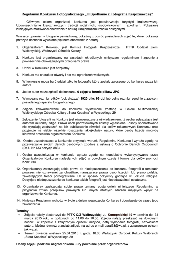 Regulamin Konkursu Fotograficznego „III Spotkanie z Fotografią Krajoznawczą” Głównym celem organizacji konkursu jest popularyzacja turystyki krajoznawczej. Upowszechnianie krajoznawczych tradycji rodzinnych, środowiskowych i szkolnych. Pokazanie istniejących możliwości obcowania z naturą i krajobrazami rzadko dostępnymi. Wszyscy uprawiamy fotografię pamiątkową, pokażmy z pośród posiadanych zdjęć te, które pokazują przeżyte doznania wywołane pięknem obcowania z naturą. PTTK Oddział Ziemi 1. Organizatorem Konkursu jest Komisja Fotografii Krajoznawczej Wałbrzyskiej, Wałbrzyski Ośrodek Kultury 2. Konkurs jest organizowany na zasadach określonych niniejszym regulaminem i zgodnie z powszechnie obowiązującymi przepisami prawa. 3. Udział w Konkursie jest bezpłatny. 4. Konkurs ma charakter otwarty i nie ma ograniczeń wiekowych. 5. W konkursie mogą barć udział tylko te fotografie które zostały zgłoszone do konkursu przez ich autora 6. Jeden autor może zgłosić do konkursu 6 zdjęć w formie plików JPG 7. Wymagany rozmiar plików (bok dłuższy) 1920 piks 96 dpi lub pełny rozmiar zgodnie z zapisem posiadanego aparatu fotograficznego 8. Zdjęcia zakwalifikowane do konkursu wystawione zostaną Wałbrzyskiego Ośrodka Kultury „Stara Kopalnia” ul Wysockiego 29 9. Zgłoszenie fotografii na Konkurs jest równoznaczne z oświadczeniem, iż osoba zgłaszająca jest autorem /autorką/ zdjęć. Prawa osób portretowanych zostały wyjaśnione i osoby sportretowane nie wyrażają zastrzeżeń na ich publikowanie również dla celów reklamowych Konkursu oraz przyjmuje na siebie wszelkie roszczenia jakiejkolwiek natury, które osoby trzecie mogłyby kierować przeciwko organizatorom Konkursu w Galerii Multimedialnej 10. Osoba uczestnicząca w konkursie przyjmuje warunki Regulaminu Konkursu i wyraża zgodę na przetwarzanie swoich danych osobowych zgodnie z ustawą o Ochronie Danych Osobowych (Dz.U.Nr.133 pozycja 883) 11. Osoba uczestnicząca w konkursie wyraża zgodę na nieodpłatne wykorzystywanie przez Organizatorów Konkursu nadesłanych zdjęć w dowolnym czasie i formie dla celów promocji Konkursu. 12. Organizatorzy zastrzegają sobie prawo do niedopuszczenia do konkursu fotografii o tematach powszechnie uznawanej za obraźliwe, naruszające prawa osób trzecich lub prawo polskie, zawierających treści pornograficzne lub w sposób oczywisty godzące w uczucia religijne. Decyzja o niedopuszczeniu do konkursu takich fotografii jest niepodważalna i ostateczna. 13. Organizatorzy zastrzegają sobie prawo zmiany postanowień niniejszego Regulaminu w przypadku zmian przepisów prawnych lub innych istotnych zdarzeń mających wpływ na organizowanie Konkursu. 14. Niniejszy Regulamin wchodzi w życie z dniem rozpoczęcia Konkursu i obowiązuje do czasu jego zakończenia. Terminy: Zdjęcia należy dostarczyć do PTTK O/Z Wałbrzyskiej ul. Konopnickiej 19 w terminie do 31 marca 2015 roku w godzinach od 11.00 do 16.00. Zdjęcia należy przekazać na dowolnym nośniku w kopercie z załączonym opisem: miejsca, datą wykonania fotografii, nazwiskiem autora. Można również przesłać zdjęcia na adres e-mail [email protected]. z załączonym opisem jak wyżej. Termin otwarcia wystawy 25.04.2015 r. godz. 18.00 Wałbrzyski Ośrodek Kultury Wałbrzych „Stara Kopalnia” ul Wysockiego 29 Oceny zdjęć i podziału nagród dokona Jury powołane przez organizatorów