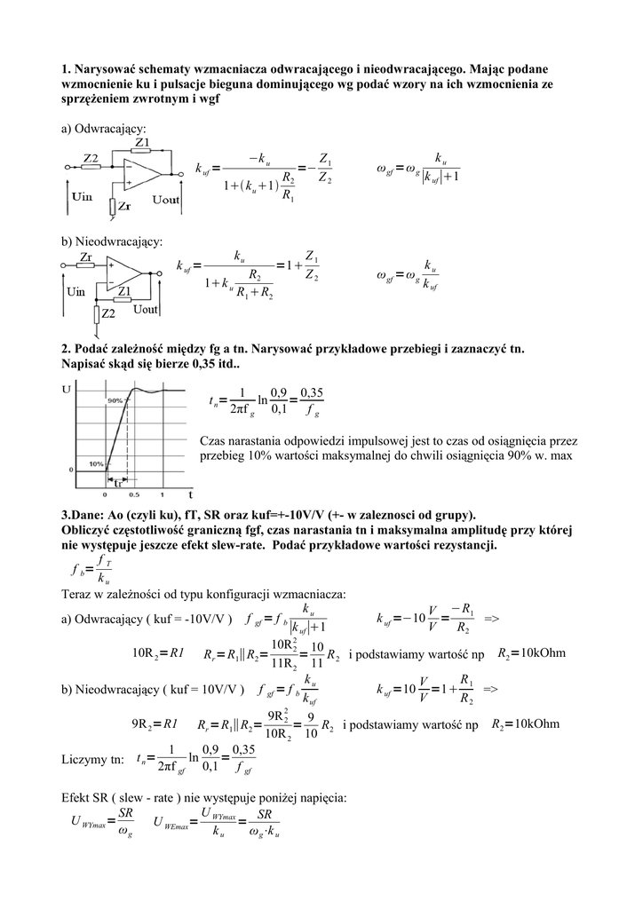 1. Narysować schematy wzmacniacza odwracającego i nieodwracającego. Mając podane wzmocnienie ku i pulsacje bieguna dominującego wg podać wzory na ich wzmocnienia ze sprzężeniem zwrotnym i wgf a) Odwracający: −k u k uf = 1 k u 1 b) Nieodwracający: k uf = ku R2 1k u R1 R2 R2 R1 =− =1 Z1 Z2 Z1 Z2 ω gf =ω g ku ∣k uf∣1 ω gf =ω g ku k uf 2. Podać zależność między fg a tn. Narysować przykładowe przebiegi i zaznaczyć tn. Napisać skąd się bierze 0,35 itd.. t n= 1 0,9 0,35 ln = 2πf g 0,1 fg Czas narastania odpowiedzi impulsowej jest to czas od osiągnięcia przez przebieg 10% wartości maksymalnej do chwili osiągnięcia 90% w. max 3.Dane: Ao (czyli ku), fT, SR oraz kuf=+-10V/V (+- w zaleznosci od grupy). Obliczyć częstotliwość graniczną fgf, czas narastania tn i maksymalna amplitudę przy której nie występuje jeszcze efekt slew-rate. Podać przykładowe wartości rezystancji. f f b= T ku Teraz w zależności od typu konfiguracji wzmacniacza: ku V −R1 k uf =−10 = a) Odwracający ( kuf = -10V/V ) f gf = f b => V R2 ∣k uf∣1 10R 22 10 10R 2=R1 Rr =R1∥R2= = R i podstawiamy wartość np R2=10kOhm 11R 2 11 2 ku R V k uf =10 =1 1 => b) Nieodwracający ( kuf = 10V/V ) f gf = f b k uf V R2 2 9R 2 9 9R 2=R1 Rr =R1∥R2= = R i podstawiamy wartość np R2=10kOhm 10R 2 10 2 1 0,9 0,35 ln = Liczymy tn: t n= 2πf gf 0,1 f gf Efekt SR ( slew - rate ) nie występuje poniżej napięcia: U SR SR U WYmax = U WEmax= WYmax = ωg ku ω g⋅k u