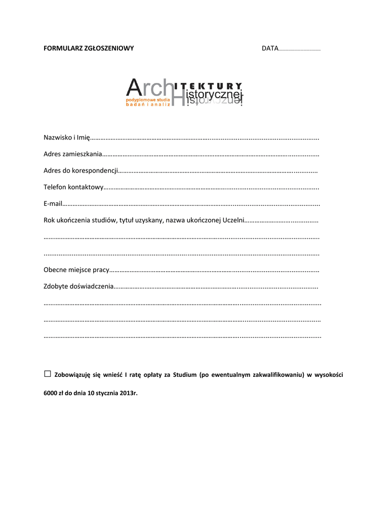 FORMULARZ ZGŁOSZENIOWY DATA.................................. Nazwisko i Imię……………………………………………………………............................................................ Adres zamieszkania……………………………………………………………………………………………….................. Adres do korespondencji………………………………………………………………………………………….............. Telefon kontaktowy……………………………………………………………….................................................. E-mail………………………………………………………………………………………................................................ Rok ukooczenia studiów, tytuł uzyskany, nazwa ukooczonej Uczelni………………………............... …………………………………………………………………………………………....................................................... .................................................................................................................................................... Obecne miejsce pracy………………………………………………………………............................................... Zdobyte doświadczenia………………………………………………………………............................................ ……………………………………………………………………………………………………............................................. ……………………………………………………………………………………………………….......................................... ……………………………………………………………………………………………………............................................. □ Zobowiązuję się wnieśd I ratę opłaty za Studium (po ewentualnym zakwalifikowaniu) w wysokości 6000 zł do dnia 10 stycznia 2013r. Rata II w wysokości 6000 zł powinna byd wpłacona do dnia 15 grudnia 2013 roku. Sekretarz Studiów: mgr Katarzyna Limanówka- Doktor, e-mail: [email protected] Zgodnie z ustawą o ochronie danych osobowych z dnia 29 lipca 1997r [Dz.U. Nr133, poz.883 z późniejszymi zmianami] wyrażam zgodę na przetwarzanie moich danych osobowych zawartych na karcie zgłoszenia w celach związanych ze Studiami. Upoważniam Instytut Historii Architektury i Konserwacji Zabytków Politechniki Krakowskiej do wystawienia faktury VAT bez podpisu odbiorcy. Dane do wystawienia faktury: (Faktura zostanie wystawiona na osobę lub instytucję dokonującą wpłaty) Nazwa płatnika Adres płatnika NIP płatnika ____________________1 Data, podpis Warunkiem uczestnictwa w Studiów jest przesłanie zgłoszenia na adres mailowy: [email protected] lub ewentualnie złożenie osobiste w Sekretariacie IHAiKZ przy ul. Kanoniczej 1 w Krakowie. 1 W przypadku składania Formularza „on Line” podpis niekonieczny