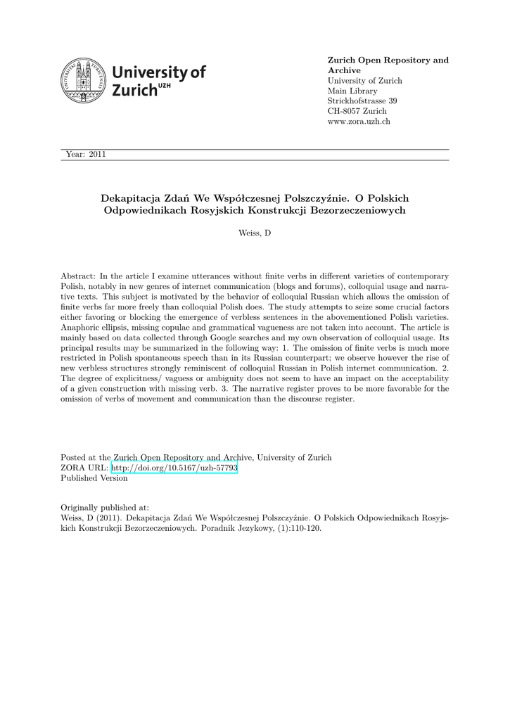 Zurich Open Repository and Archive University of Zurich Main Library Strickhofstrasse 39 CH-8057 Zurich www.zora.uzh.ch Year: 2011 Dekapitacja Zdań We Współczesnej Polszczyźnie. O Polskich Odpowiednikach Rosyjskich Konstrukcji Bezorzeczeniowych Weiss, D Abstract: In the article I examine utterances without finite verbs in different varieties of contemporary Polish, notably in new genres of internet communication (blogs and forums), colloquial usage and narrative texts. This subject is motivated by the behavior of colloquial Russian which allows the omission of finite verbs far more freely than colloquial Polish does. The study attempts to seize some crucial factors either favoring or blocking the emergence of verbless sentences in the abovementioned Polish varieties. Anaphoric ellipsis, missing copulae and grammatical vagueness are not taken into account. The article is mainly based on data collected through Google searches and my own observation of colloquial usage. Its principal results may be summarized in the following way: 1. The omission of finite verbs is much more restricted in Polish spontaneous speech than in its Russian counterpart; we observe however the rise of new verbless structures strongly reminiscent of colloquial Russian in Polish internet communication. 2. The degree of explicitness/ vaguess or ambiguity does not seem to have an impact on the acceptability of a given construction with missing verb. 3. The narrative register proves to be more favorable for the omission of verbs of movement and communication than the discourse register. Posted at the Zurich Open Repository and Archive, University of Zurich ZORA URL: http://doi.org/10.5167/uzh-57793 Published Version Originally published at: Weiss, D (2011). Dekapitacja Zdań We Współczesnej Polszczyźnie. O Polskich Odpowiednikach Rosyjskich Konstrukcji Bezorzeczeniowych. Poradnik Jezykowy, (1):110-120. Daniel Weiss (Uniwersytet w Zurychu, Szwajcaria) DEKAPITACJA ZDAŃ WE WSPÓŁCZESNEJ POLSZCZYŹNIE. O POLSKICH ODPOWIEDNIKACH ROSYJSKICH KONSTRUKCJI BEZORZECZENIOWYCH Niniejszy szkic stanowi kontynuację dwóch tekstów, również pisanych z myślą o przyjaciołach językoznawcach. W pierwszym (Weiss 2010) omawiam wypowiedzi bezorzeczeniowe, charakterystyczne dla języka rosyjskiego w jego odmianie potocznej. Drugi (Weiss 2011) traktuje o podobnym zjawisku zaobserwowanym w „internetowej” polszczyźnie, czyli w blogach i na forach dyskusyjnych. Bodźcem do porównania obu języków było stwierdzenie, iż rosyjskich konstrukcji bezorzeczeniowych na ogół nie da się przetłumaczyć na potoczną polszczyznę dosłownie, tzn. z pominięciem formy czasownikowej w funkcji orzeczenia. Rosyjskiej konstrukcji: Как тебе Путин (нравится)? nie przetłumaczymy przecież na polski jako *Jak ci Putin? Skrótowe wypowiedzi typu Ty to sama? (w przeciwieństwie do ros. Ты это сама?) nie są używane w sytuacjach, w których zaimek to miałby odsyłać do treści typu ‛upiekłaś ten tort’ / ‛namalowałaś ten obrazek’ / ‛uszyłaś ten płaszcz’ itp. Czasami polska kalka rosyjskiej konstrukcji przypomina mowę dzieci, np. Ale ja niespecjalnie/niechcący! (por. ros. Но я ненарочно/нечаянно/неумышленно). W jeszcze innych wypadkach można podejrzewać użytkowników języka polskiego o pozostawanie pod wpływem języka rosyjskiego1. Dopiero systematyczne poszukiwanie takich „dewiacyjnych” struktur w Internecie pokazało, że w nowych typach komunikacji internetowej – zwłaszcza w blogach i na forach dyskusyjnych – funkcjonują konstrukcje pozwalające na podobną swobodę, jaka panuje w potocznej odmianie języka rosyjskiego. Dla przykładu przytoczę fragment z polskiego blogu: 1 W Weiss 2011 cytuję wypowiedź Ty znowu za swoje?, pochodzącą z powieści Pawła Huelle Weiser Dawidek. Ten niezmiernie rzadki zwrot (5 trafień w wyszukiwarce Google) żywo przypomina rosyjskie wyrażenie Ты опять за свое? Ze względu na lwowski rodowód pisarza przypuszczenie, że jest to kresowizm, nie jest chyba bezpodstawne. DEKAPITACJA ZDAŃ WE WSPÓŁCZESNEJ POLSZCZYŹNIE... 111 (1) Jeżeli tak się stało to ja niechcący... zagalopowałem się. – ja tam w Twoim opisie zespołu OSCAR nie widziałem nic z kryptoreklam2 (www.forum.gorlice24.pl/viewtopic.php?p=33981; dostęp: 12.08.2010) Nie oznacza to jednak, że wszystkie przykłady zaświadczone w potocznym języku rosyjskim znajdują swoje odpowiedniki w polskim Internecie. Jak dalej pokazuję, przykładów takich nie ma zbyt dużo. Podejmując problem rosyjskich konstrukcji bezczasownikowych w Weiss 2010, wracam do dyskusji prowadzonej przed laty z Igorem Mielczukiem. Dotyczy ona statusu teoretycznego przysługującego tego typu wyrażeniom. Mielczuk w swojej typologii niezrealizowanych pozycji syntaktycznych przewiduje tylko dwie możliwości interpretacyjne: elipsę albo leksem zerowy3. W artykule Weiss 1993 wysunąłem tezę, że w wypadku wyrażeń z niezrealizowanym orzeczeniem czasownikowym zwykle nie chodzi ani o jedno, ani o drugie. Jest to zjawisko sui generis: u podstaw takich niepełnych struktur leży pewien abstrakcyjny zespół cech semantycznych, który na powierzchni zdania nie tylko nie zostaje zrealizowany, ale często nie może być zrealizowany, gdyż język nie dysponuje jednostką leksykalną, która byłaby nośnikiem tak abstrakcyjnego znaczenia4. W pracy Weiss 2010 za mit uznaję postulowane w rosyjskiej literaturze przedmiotu istnienie tak zwanych „czasowników zerowych”. Tym samym odrzucam opozycję, w której jednostkom typu ‛abstrakcyjny czasownik ruchu’, ‛czasownik komunikacji’ czy ‛przemocy fizycznej’, traktowanym jako element systemu językowego (langue), przeciwstawiane są okazjonalne, sytuacyjnie uwarunkowane opuszczenia, należące rzekomo do parole. Zamiast tego proponuję jednolitą interpretację wszystkich niesfrazeologizowanych „opuszczeń