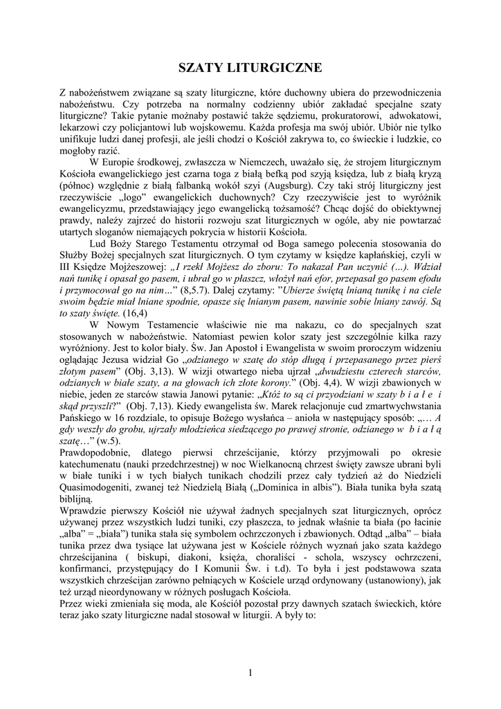 SZATY LITURGICZNE Z nabożeństwem związane są szaty liturgiczne, które duchowny ubiera do przewodniczenia nabożeństwu. Czy potrzeba na normalny codzienny ubiór zakładać specjalne szaty liturgiczne? Takie pytanie możnaby postawić także sędziemu, prokuratorowi, adwokatowi, lekarzowi czy policjantowi lub wojskowemu. Każda profesja ma swój ubiór. Ubiór nie tylko unifikuje ludzi danej profesji, ale jeśli chodzi o Kościół zakrywa to, co świeckie i ludzkie, co mogłoby razić. W Europie środkowej, zwłaszcza w Niemczech, uważało się, że strojem liturgicznym Kościoła ewangelickiego jest czarna toga z białą befką pod szyją księdza, lub z białą kryzą (północ) względnie z białą falbanką wokół szyi (Augsburg). Czy taki strój liturgiczny jest rzeczywiście „logo” ewangelickich duchownych? Czy rzeczywiście jest to wyróżnik ewangelicyzmu, przedstawiający jego ewangelicką tożsamość? Chcąc dojść do obiektywnej prawdy, należy zajrzeć do historii rozwoju szat liturgicznych w ogóle, aby nie powtarzać utartych sloganów niemających pokrycia w historii Kościoła. Lud Boży Starego Testamentu otrzymał od Boga samego polecenia stosowania do Służby Bożej specjalnych szat liturgicznych. O tym czytamy w księdze kapłańskiej, czyli w III Księdze Mojżeszowej: „I rzekł Mojżesz do zboru: To nakazał Pan uczynić (…). Wdział nań tunikę i opasał go pasem, i ubrał go w płaszcz, włożył nań efor, przepasał go pasem efodu i przymocował go na nim…” (8,5.7). Dalej czytamy: ”Ubierze świętą lnianą tunikę i na ciele swoim będzie miał lniane spodnie, opasze się lnianym pasem, nawinie sobie lniany zawój. Są to szaty święte. (16,4) W Nowym Testamencie właściwie nie ma nakazu, co do specjalnych szat stosowanych w nabożeństwie. Natomiast pewien kolor szaty jest szczególnie kilka razy wyróżniony. Jest to kolor biały. Św. Jan Apostoł i Ewangelista w swoim proroczym widzeniu oglądając Jezusa widział Go „odzianego w szatę do stóp długą i przepasanego przez pierś złotym pasem” (Obj. 3,13). W wizji otwartego nieba ujrzał „dwudziestu czterech starców, odzianych w białe szaty, a na głowach ich złote korony.” (Obj. 4,4). W wizji zbawionych w niebie, jeden ze starców stawia Janowi pytanie: „Któż to są ci przyodziani w szaty b i a ł e i skąd przyszli?” (Obj. 7,13). Kiedy ewangelista św. Marek relacjonuje cud zmartwychwstania Pańskiego w 16 rozdziale, to opisuje Bożego wysłańca – anioła w następujący sposób: „… A gdy weszły do grobu, ujrzały młodzieńca siedzącego po prawej stronie, odzianego w b i a ł ą szatę…” (w.5). Prawdopodobnie, dlatego pierwsi chrześcijanie, którzy przyjmowali po okresie katechumenatu (nauki przedchrzestnej) w noc Wielkanocną chrzest święty zawsze ubrani byli w białe tuniki i w tych białych tunikach chodzili przez cały tydzień aż do Niedzieli Quasimodogeniti, zwanej też Niedzielą Białą („Dominica in albis”). Biała tunika była szatą biblijną. Wprawdzie pierwszy Kościół nie używał żadnych specjalnych szat liturgicznych, oprócz używanej przez wszystkich ludzi tuniki, czy płaszcza, to jednak właśnie ta biała (po łacinie „alba” = „biała”) tunika stała się symbolem ochrzczonych i zbawionych. Odtąd „alba” – biała tunika przez dwa tysiące lat używana jest w Kościele różnych wyznań jako szata każdego chrześcijanina ( biskupi, diakoni, księża, choraliści - schola, wszyscy ochrzczeni, konfirmanci, przystępujący do I Komunii Św. i t.d). To była i jest podstawowa szata wszystkich chrześcijan zarówno pełniących w Kościele urząd ordynowany (ustanowiony), jak też urząd nieordynowany w różnych posługach Kościoła. Przez wieki zmieniała się moda, ale Kościół pozostał przy dawnych szatach świeckich, które teraz jako szaty liturgiczne nadal stosował w liturgii. A były to: 1 • Alba (długa do kostek sięgająca biała tunika, pierwotnie lniana), która może w pasie być przewiązana sznurem tzw. „cingulum” dł. 2,50 – 3.50 m. Od VI wieku nosili ją tylko duchowni jako odzież, od X wieku tylko w kościele • Komża (skrócona do kolan alba, pierwotnie lniana) z rękawami lub bez rękawów. • Stuła – długi kolorowy szal - wstęga zakładana na szyję 10 cm szeroki i 2.5 m. długi. Wskazuje ona na trójstopniowy urząd Kościoła. Biskupi zakładali ją na szyję nosili zwisającą na piersi, prezbiterzy (księża) krzyżowali ją na piesi, a diakoni zakładają stułę na lewe ramię, prowadzą ukośnie przez piersi do prawego boku i tam ją spinają. • Ornat – w kolorze liturgicznym nakrycie na albę (pierwotnie płaszcz, dziś wierzchnie okrycie Indian Ameryki Środkowej i Południowej, owalny kawałek sukna z wyciętym otworem na głowę tzw. „ponczo”, hiszp. „poncho”, używane nieraz u nas przez kobiety). Ornat używany jest tylko do sprawowania Wieczerzy Pańskiej (Eucharystii). • Kapa (łac.„Pluviale”) nieraz z kapucą, okrycie używane do uroczystych nabożeństw nie eucharystycznych (np. ordynacja lub konsekracja). • Mitra: liturgiczne nakrycie głowy biskupa podczas wielkich uroczystości liturgicznych. • Pastorał: laska biskupia, symbol władzy pasterskiej – por. Psalm 23, 4: „Twoja laska i kij pasterski są mi pocieszeniem.” • Sutanna (czarna dla księży i diakonów, fioletowa dla biskupów) – strój służbowy, nie liturgiczny dla duchownych Kościołów: Rzymskokatolickiego, Greckokatolickiego, Starokatolickiego, Prawosławnego i Anglikańskiego, oraz w niektórych także Kościołach luterańskich (wyjątki!). Skrócona nieco poniżej do kolan czarna sutanna zwana „surdutem luterańskim” („lutherock”) używana jest jako strój urzędowy księży luterańskich, zwłaszcza w krajach skandynawskich i w Polsce, a kiedyś także w Niemczech. Są to stroje pochodzenia starokościelnego używane jeszcze dziś takż