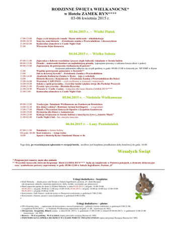 _ RODZINNE ŚWIĘTA WIELKANOCNE* w Hotelu ZAMEK RYN**** 03-06 kwietnia 2015 r. 03.04.2015 r. – Wielki Piątek 17.00-23.00 20.00-20.50 21.00-02.00 21.00 Zupa z ryb tutejszych i smaki Mazur niebywałe – obiadokolacja Snuj się, snuj historio –Zwiedzanie zamku z Przewodnikiem i dreszczykiem Kameralna atmosfera w Castle Night Club Wieczorne Kino Konesera 04.04.2015 r. – Wielka Sobota 07.00-11.00 09.00-12.00 09.00-13.00 12.00 13.00 13.00-14.00 14.00 15.00-16.00 16.00-18.00 18.00-21.00 21.00-24.00 21.00-2.00 Jajecznica z dobrem wszelakim i jeszcze ciepłe bułeczki -śniadanie w formie bufetu Pisanki – malowanki-konkurs na najładniejszą pisankę (uprzejmie prosimy o zabranie koszyczków z pokoi) Zapraszamy do poświęcenia wielkanocnych potraw* święcenie pokarmów odbywa się co pół godziny w godz. 09.00-13.00 w kościele pw. NP NMP w Rynie Wspólne poświęcenie pokarmów w Kościele** Jak to drzewiej bywało? - Zwiedzanie Zamku z Przewodnikiem Akademia Kulinarna Zamku w Rynie – jaja z czekolady Historie Rycerzy i Księżniczek - Zwiedzanie Zamku z Przewodnikiem dla Dzieci Warsztaty CARVINGU – czyli rzeźbienie w owocach i warzywach Suknie z epoki przecudne, rycerskie tuniki i piękne stroje dla Pacholąt Waszych Pysznie i po rycersku - Biesiada Rycerska Wieczór w Castle Casino - wyłącznie dla Gości Hotelu ZAMEK RYN**** Kameralna atmosfera w Castle Night Club 05.04.2015 r. – Niedziela Wielkanocna 09.00-12.00 14.00-16.30 15.00-17.00 18.00-19.00 18.00-23.00 21.00-02.00 Tradycyjne Śniadanie Wielkanocne na Zamkowym Dziedzińcu Kto dalej i celniej?- Rodzinny turniej bowlingowy - z nagrodami Piknik z Pieczeniem Smoczych Ogonów i Zespołem Szantowym Dyskoteka dla Dzieci z Animatorem Kolacja świąteczna (w formie bufetu) z muzyką na żywo („Annette Music” Castle Night Club - bar, muzyka taneczna 06.04.2015 r. – Lany Poniedziałek 07.00-11.00 Śniadanie w formie bufetu Od godz. 08.00 Kort tenisowy – wstęp wolny 10.00 Spacer z historią Rynu i Smakami Mazur w tle Tego dnia, po wcześniejszym zgłoszeniu w recepcji hotelu, możliwe jest bezpłatne przedłużenie doby hotelowej do godz. 16.00. Wesołych Świąt * Program jest ramowy może ulec zmianie ** Wszystkie koszyczki, którymi dysponuje Hotel ZAMEK RYN**** będą się znajdowały w Państwa pokojach, a elementy dekoracyjne oraz symboliczne potrawy zapewniamy w godz. 09.00-12.00 w Salach Jagiellonów, Poziom „0” Usługi dodatkowe - bezpłatne • Klub Malucha - działa przez całe Święta w Salach Jagiellonów, poziom „0”, obok Recepcji (do dyspozycji zabawki, materiały papiernicze, farby, kredki, wycinanki, gry planszowe) • Hotel zapewnia opiekę do dzieci w Klubie Malucha w dniu 03.04.2015 r. od godz. 14.00-19.00, 04.04.2015 r. od godz. 09.00 do 13.00 oraz 14.00-18.00, 05.04.2015 r. od godz. 10.00 do 14.00 oraz 15.00-19.00 06.04.2015 r. od godz.10.00 do 14.00 • Korzystanie z Sali Fitness i stołu do tenisa w Zbrojowni (codziennie w godzinach 7.00-23.00) • Korzystanie z basenu, jacuzzi i saun (codziennie w godzinach 8.00-22.00) • Usługi dodatkowe – płatne • SPA Księżnej Anny - zapraszamy do korzystania z naszych propozycji – gabinety czynne codziennie w godzinach 9.00-21.00, z wyjątkiem 05.04.2015 r. – w Niedzielę Wielkanocną zapraszamy od godz. 11.00, rezerwacja tel. 862) • Zbrojownia: Kręgielnia, Bilard czynna: w dniu 03.04. 2015 r. w godzinach 17.00-23.00 i w dniach 05-06.04.2015 r. w godzinach 12.00-23.00 (rezerwacja – tel. 803) • Rowery – 10 zł za godzinę, 50 zł za dzień (zapisy prowadzi recepcja Basenu tel. 805) • INDYWIDUALNA OPIEKA DO DZIECI W CZASIE POBYTU ŚWIĄTECZNEGO zapisy przyjmuje Recepcja Basenu (tel. 805)