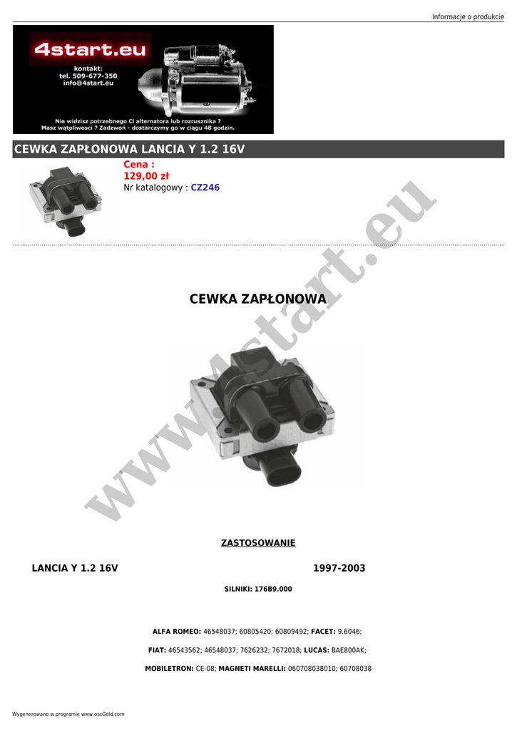Informacje o produkcie CEWKA ZAPŁONOWA LANCIA Y 1.2 16V Cena : 129,00 zł ar t. eu Nr katalogowy : CZ246 w w w .4 st CEWKA ZAPŁONOWA ZASTOSOWANIE LANCIA Y 1.2 16V 1997-2003 SILNIKI: 176B9.000 ALFA ROMEO: 46548037; 60805420; 60809492; FACET: 9.6046; FIAT: 46543562; 46548037; 7626232; 7672018; LUCAS: BAE800AK; MOBILETRON: CE-08; MAGNETI MARELLI: 060708038010; 60708038 Wygenerowano w programie www.oscGold.com eu Liczba przewodów zapłonowych odpowiada liczbie świec zapłonowych. w w w .4 st ar t. Cewka zapłonowa blokowa z dwoma wyjściami wysokiego napięcia. Zasila ona wysokim napięciem jednocześnie dwie świece zapłonowe (cewka w technologii iskier podwójnych).