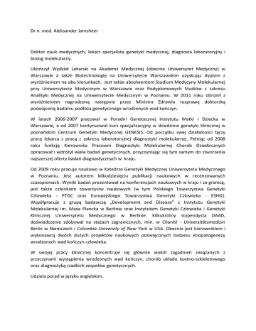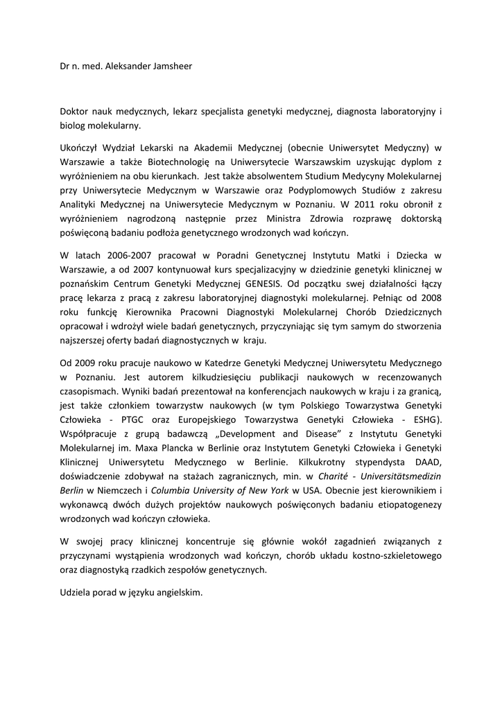 Dr n. med. Aleksander Jamsheer Doktor nauk medycznych, lekarz specjalista genetyki medycznej, diagnosta laboratoryjny i biolog molekularny. Ukończył Wydział Lekarski na Akademii Medycznej (obecnie Uniwersytet Medyczny) w Warszawie a także Biotechnologię na Uniwersytecie Warszawskim uzyskując dyplom z wyróżnieniem na obu kierunkach. Jest także absolwentem Studium Medycyny Molekularnej przy Uniwersytecie Medycznym w Warszawie oraz Podyplomowych Studiów z zakresu Analityki Medycznej na Uniwersytecie Medycznym w Poznaniu. W 2011 roku obronił z wyróżnieniem nagrodzoną następnie przez Ministra Zdrowia rozprawę doktorską poświęconą badaniu podłoża genetycznego wrodzonych wad kończyn. W latach 2006-2007 pracował w Poradni Genetycznej Instytutu Matki i Dziecka w Warszawie, a od 2007 kontynuował kurs specjalizacyjny w dziedzinie genetyki klinicznej w poznańskim Centrum Genetyki Medycznej GENESIS. Od początku swej działalności łączy pracę lekarza z pracą z zakresu laboratoryjnej diagnostyki molekularnej. Pełniąc od 2008 roku funkcję Kierownika Pracowni Diagnostyki Molekularnej Chorób Dziedzicznych opracował i wdrożył wiele badań genetycznych, przyczyniając się tym samym do stworzenia najszerszej oferty badań diagnostycznych w kraju. Od 2009 roku pracuje naukowo w Katedrze Genetyki Medycznej Uniwersytetu Medycznego w Poznaniu. Jest autorem kilkudziesięciu publikacji naukowych w recenzowanych czasopismach. Wyniki badań prezentował na konferencjach naukowych w kraju i za granicą, jest także członkiem towarzystw naukowych (w tym Polskiego Towarzystwa Genetyki Człowieka - PTGC oraz Europejskiego Towarzystwa Genetyki Człowieka - ESHG). Współpracuje z grupą badawczą „Development and Disease” z Instytutu Genetyki Molekularnej im. Maxa Plancka w Berlinie oraz Instytutem Genetyki Człowieka i Genetyki Klinicznej Uniwersytetu Medycznego w Berlinie. Kilkukrotny stypendysta DAAD, doświadczenie zdobywał na stażach zagranicznych, min. w Charité - Universitätsmedizin Berlin w Niemczech i Columbia University of New York w USA. Obecnie jest kierownikiem i wykonawcą dwóch dużych projektów naukowych poświęconych badaniu etiopatogenezy wrodzonych wad kończyn człowieka. W swojej pracy klinicznej koncentruje się głównie wokół zagadnień związanych z przyczynami wystąpienia wrodzonych wad kończyn, chorób układu kostno-szkieletowego oraz diagnostyką rzadkich zespołów genetycznych. Udziela porad w języku angielskim.