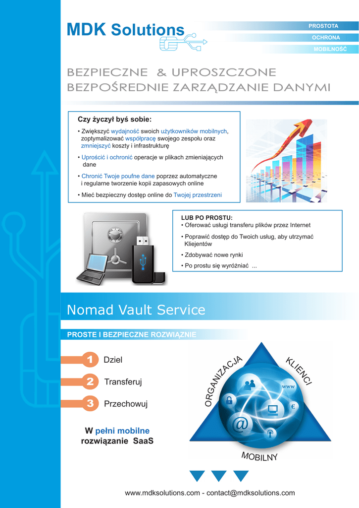 MDK Solutions PROSTOTA OCHRONA MOBILNOŚĆ BEZPIECZNE & UPROSZCZONE BEZPOŚREDNIE ZARZĄDZANIE DANYMI Czy życzył byś sobie: • Zwiększyć wydajność swoich użytkowników mobilnych, zoptymalizować współpracę swojego zespołu oraz zmniejszyć koszty i infrastrukturę • Uprościć i ochronić operacje w plikach zmieniających dane • Chronić Twoje poufne dane poprzez automatyczne i regularne tworzenie kopii zapasowych online • Mieć bezpieczny dostęp online do Twojej przestrzeni LUB PO PROSTU: • Oferować usługi transferu plików przez Internet • Poprawić dostęp do Twoich usług, aby utrzymać Kliejentów • Zdobywać nowe rynki • Po prostu się wyróżniać ... Nomad Vault Service PROSTE I BEZPIECZNE ROZWIĄZNIE A KL I OR G A CI Przechowuj J AC EN Transferuj NI Z Dziel W pełni mobilne rozwiązanie SaaS MOBILNY MDK Solutions 9 rue Benoît Malon 92156 SURESNES www.mdksolutions.com - [email protected] MDK Solutions PROSTOTA OCHRONA MOBILNOŚĆ MDK Solutions wprowadza innowacje, zabezpiecza, upraszcza • Użytkownicy mobilni mają regularny dostęp do ważnych plików ... • Prawidłowo zabezpieczony transfer danych w internecie jest złożony i wymaga kosztownej infrastruktury. • W przypadku utraty sprzętu, kradzieży, awarii lub innych zdarzeń losowych, firma i jej reputacja może ucierpieć. Nomad Vault Service Offer ZWIELOKROTNIONE KORZYŚCI Infrastruktura MDK Solutions • Bezpieczne udostępnianie folderów • Prosty i bezpieczny transfer plików Chmura MDK • Automatyczna kopia zapasowa online • Łatwa dostępność danych • Rozwiązanie «Made in Europe» MDK Serwer autoryzujący Internet MDK Klucz UrządzenieKlucz MDK wirtualne MDK Twój Serwer Laptop PC oferta firmy Serwer klienta 1- Żądanie autoryzacji 2- Tolkien autoryzacji 3- Uwierzytelnianie informacji 4- Transfer i kopie zapasowe • Dedykowana przestrzeń użytkownika Zaplecze Serwer MDK • Obszar zapisu danych • Wysokie bezpieczeństwo: 256-bitowe szyfrowanie AES • Inteligentny USB klucz • Opłacalne: od 15 € / za miesiąc (bez VAT) SPRÓBUJ ABY SIĘ PRZEKONAĆ Skontaktuj się z nami MDK Solutions 9 rue Benoît Malon 92156 SURESNES www.mdksolutions.com - [email protected]