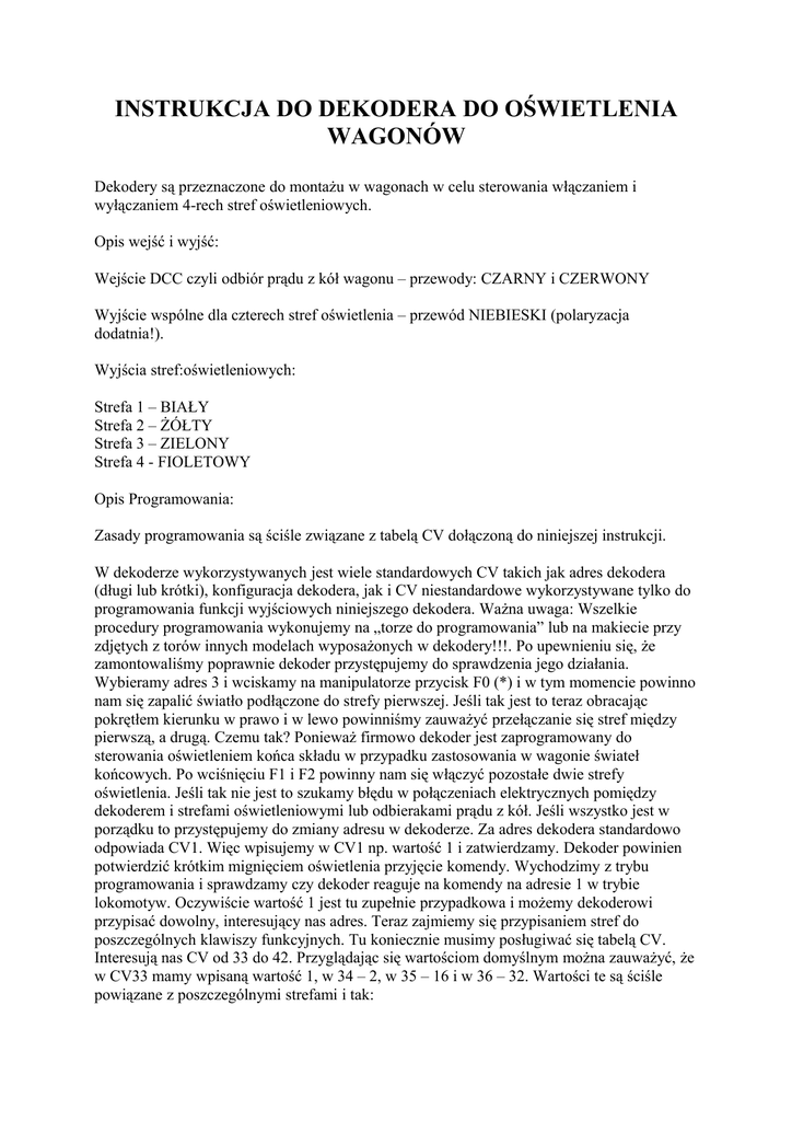 INSTRUKCJA DO DEKODERA DO OŚWIETLENIA WAGONÓW Dekodery są przeznaczone do montażu w wagonach w celu sterowania włączaniem i wyłączaniem 4-rech stref oświetleniowych. Opis wejść i wyjść: Wejście DCC czyli odbiór prądu z kół wagonu – przewody: CZARNY i CZERWONY Wyjście wspólne dla czterech stref oświetlenia – przewód NIEBIESKI (polaryzacja dodatnia!). Wyjścia stref:oświetleniowych: Strefa 1 – BIAŁY Strefa 2 – ŻÓŁTY Strefa 3 – ZIELONY Strefa 4 - FIOLETOWY Opis Programowania: Zasady programowania są ściśle związane z tabelą CV dołączoną do niniejszej instrukcji. W dekoderze wykorzystywanych jest wiele standardowych CV takich jak adres dekodera (długi lub krótki), konfiguracja dekodera, jak i CV niestandardowe wykorzystywane tylko do programowania funkcji wyjściowych niniejszego dekodera. Ważna uwaga: Wszelkie procedury programowania wykonujemy na „torze do programowania” lub na makiecie przy zdjętych z torów innych modelach wyposażonych w dekodery!!!. Po upewnieniu się, że zamontowaliśmy poprawnie dekoder przystępujemy do sprawdzenia jego działania. Wybieramy adres 3 i wciskamy na manipulatorze przycisk F0 (*) i w tym momencie powinno nam się zapalić światło podłączone do strefy pierwszej. Jeśli tak jest to teraz obracając pokrętłem kierunku w prawo i w lewo powinniśmy zauważyć przełączanie się stref między pierwszą, a drugą. Czemu tak? Ponieważ firmowo dekoder jest zaprogramowany do sterowania oświetleniem końca składu w przypadku zastosowania w wagonie świateł końcowych. Po wciśnięciu F1 i F2 powinny nam się włączyć pozostałe dwie strefy oświetlenia. Jeśli tak nie jest to szukamy błędu w połączeniach elektrycznych pomiędzy dekoderem i strefami oświetleniowymi lub odbierakami prądu z kół. Jeśli wszystko jest w porządku to przystępujemy do zmiany adresu w dekoderze. Za adres dekodera standardowo odpowiada CV1. Więc wpisujemy w CV1 np. wartość 1 i zatwierdzamy. Dekoder powinien potwierdzić krótkim mignięciem oświetlenia przyjęcie komendy. Wychodzimy z trybu programowania i sprawdzamy czy dekoder reaguje na komendy na adresie 1 w trybie lokomotyw. Oczywiście wartość 1 jest tu zupełnie przypadkowa i możemy dekoderowi przypisać dowolny, interesujący nas adres. Teraz zajmiemy się przypisaniem stref do poszczególnych klawiszy funkcyjnych. Tu koniecznie musimy posługiwać się tabelą CV. Interesują nas CV od 33 do 42. Przyglądając się wartościom domyślnym można zauważyć, że w CV33 mamy wpisaną wartość 1, w 34 – 2, w 35 – 16 i w 36 – 32. Wartości te są ściśle powiązane z poszczególnymi strefami i tak: strefie pierwszej odpowiada wartość 1, drugiej 2 , trzeciej 16 i czwartej 32. Teraz standardowy przykład programowania: Powiedzmy, że w strefę pierwszą chcemy mieć pod klawiszem F1, drugą F2, trzecią F3 i czwartą F4. Programujemy – do CV33 - 0 (wyłączamy strefę 1 dla kierunku w lewo), do CV34 – 0 (wyłączamy strefę 2 dla kierunku w prawo), do CV35 – 1 (strefa 1 aktywna dla F1), , do CV36 – 2 (strefa 2 aktywna dla F2), do CV37 – 16 (strefa 3 aktywna dla F3), do CV38 – 32 (strefa 4 aktywna dla F4). Mamy też możliwość załączania jednym klawiszem funkcyjnym kilku stref naraz. Np. chcemy aby klawisz F5 załączał nam strefę 1 i 4 więc sumujemy 1 (strefa 1) i 32 (strefa 4) i otrzymujemy wynik 33. Teraz wystarczy do CV39 wpisać wartość 33 i już gotowe. Możemy także załączać wszystkie strefy naraz: sumujemy 1+2+16+32=51. Teraz przykładowo do CV41 wpisujemy wyliczoną wartość (51) i mamy pod F7 załączanie wszystkich stref. Oczywiście po wciśnięciu innej funkcji dekoder załączy strefy przypisane do tej ostatnio wciśniętej. Dekoder posiada jeszcze funkcje dodatkowe. Jedną z nich jest funkcja „multiplex” Używanie tej funkcji zalecane jest przy składach wielowagonowych. Powoduje ona dużo niższy pobór prądu z torów ponieważ przy załączeniu wszystkich stref tak naprawdę w danej chwili świeci się tylko jedna strefa przez ułamki sekund potem druga itd.Ze względu na bezwładność oka ludzkiego szybkie przełączanie stref jest niezauważalne. Aby uruchomić tę funkcję należy do CV50 wpisać wartość 2. Jest też funkcja „tryb jarzeniówek”, w przypadku której światła w wagonie zapalają się chaotycznie po wciśnięciu F0 (*). W tym trybie niemożliwe jest jednak sterowanie poszczególnymi strefami osobno. Funkcję tę uruchamiamy wpisując do CV50 wartość 1. Możliwe jest też równoczesne uruchomienie „multiplex-u” i „jarzeniówek” po wpisaniu do CV50 wartości 3. Aby powrócić do normalnej pracy dekodera należy wpisać 0 do CV50. . Dziękujemy za zakup naszego urządzenia i życzymy przyjemnej zabawy. W razie pytań i wątpliwości prosimy o kontakt na [email protected]