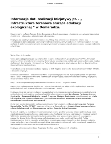GMINA DOMARADZ Informacja dot. realizacji Inicjatywy pt. . „ Infrastruktura terenowa służąca edukacji ekologicznej ” w Domaradzu. Stowarzyszenie na Rzecz Rozwoju Gminy Domaradz serdecznie zaprasza do odwiedzenia nowo utworzonego miejsca dydaktyczno – edukacyjno – ekologicznego w Domaradzu. Inicjatywa jest wspólnym pomysłem mieszkańców, którzy chcą zainteresować środowisko lokalne oraz odwiedzających Domaradz gości walorami przyrodniczymi okolicy, cennymi gatunkami roślin i zwierząt jak również zachęcić do podejmowania i wspierania ekologicznych inicjatyw mających na celu poprawę stanu naszego środowiska naturalnego. Warto dołączyć do nas bo: Gmina Domaradz położona jest w podkarpackim obszarze funkcjonalnym „Zielone Karpaty” (WPOŚ). W ramach systemu ochrony przyrody na terenie gminy Domaradz, na wysuniętym na zachód cyplu sołectwa Domaradz, znajduje się fragment Czarnorzecko – Strzyżowskiego Parku Krajobrazowego oraz przylegającego do niego Czarnorzeckiego Obszaru Chronionego Krajobrazu. Tereny te stanowią równocześnie obszar węzłowy nr 32-K (Pogórze Strzyżowsko- Dynowskie) Sieci ECONET – POLSKA o znaczeniu krajowym. Roślinność Czarnorzecko - Strzyżowskiego Parku Krajobrazowego jest bogata. Występuje tu ponad 700 gatunków roślin, z czego 43 to gatunki chronione. Nad brzegiem przepływającej przez Domaradz rzeki Stobnicy znajduje się obszar chroniony Natura 2000. Przy 3 km drodze prowadzącej z centrum wioski Domaradz do lasu – przysiółku Podlas utworzyliśmy ogólnodostępne dydaktyczno – edukacyjno – ekologiczne miejsce, które będzie służyć rozwojowi edukacji ekologicznej, aktywnych form turystyki rowerowej i pieszej. Inicjatywę, która jest pierwszym etapem koncepcji utworzenia miejsca rekreacji pełniącego jednocześnie funkcję edukacji ekologicznej mogliśmy zrealizować dzięki środkom otrzymanym od Narodowego Funduszu Ochrony Środowiska i Gospodarki Wodnej w ramach Programu Edukacja Ekologiczna - przedsięwzięcie pn. „Mała infrastruktura turystyczno-edukacyjna i przyrodnicza sposobem na poprawę stanu środowiska naturalnego i ograniczenia antropopresji”. Zaufał nam również bezpośredni realizator projektu w/w Programu jakim jest Fundacja Europejski Fundusz Rozwoju Wsi Polskiej (EFRWP) a autorem inicjatywy w Domaradzu pt. „ Infrastruktura terenowa służąca edukacji ekologicznej jest Stowarzyszenie na Recz Rozwoju Gminy Domaradz. W ramach projektu na zaniedbanym i zachwaszczonym terenie geodeta wyznaczył miejsce pod inicjatywę, które nieodpłatnie zostało uporządkowane przez mieszkańców. Realizację Inicjatywy organizacyjnie i rzeczowo wspierał Wójt Gminy poprzez m.in. fachowe konsultacje pracowników oraz wykonanie prac ziemnych koparką przez pracownika Urzędu Gminy. Merytoryczną, profesjonalną pomocą służył nam Zespół Karpackich Parków Krajobrazowych w Krośnie z siedzibą w Dukli. Panie przygotowały propozycję grafiki na dwie dwustronne tablice (mapę parku, florę, faunę i zabytki), podpowiedziały, które gatunki miejscowych roślin zagrożonych wyginięciem warto nasadzić w tworzonym kąciku dydaktyczno-edukacyjnym. Inicjatywą zainteresowaliśmy także Regionalną Dyrekcję Lasów Państwowych w Krośnie. 1