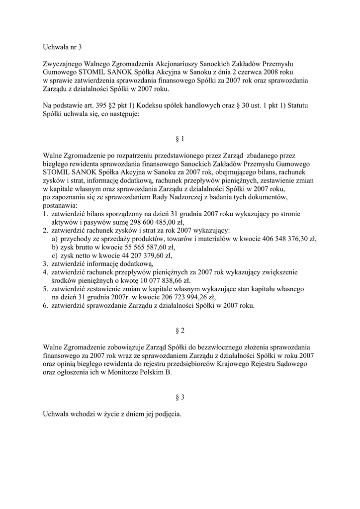 Uchwała nr 3 Zwyczajnego Walnego Zgromadzenia Akcjonariuszy Sanockich Zakładów Przemysłu Gumowego STOMIL SANOK Spółka Akcyjna w Sanoku z dnia 2 czerwca 2008 roku w sprawie zatwierdzenia sprawozdania finansowego Spółki za 2007 rok oraz sprawozdania Zarządu z działalności Spółki w 2007 roku. Na podstawie art. 395 §2 pkt 1) Kodeksu spółek handlowych oraz § 30 ust. 1 pkt 1) Statutu Spółki uchwala się, co następuje: §1 Walne Zgromadzenie po rozpatrzeniu przedstawionego przez Zarząd zbadanego przez biegłego rewidenta sprawozdania finansowego Sanockich Zakładów Przemysłu Gumowego STOMIL SANOK Spółka Akcyjna w Sanoku za 2007 rok, obejmującego bilans, rachunek zysków i strat, informację dodatkową, rachunek przepływów pieniężnych, zestawienie zmian w kapitale własnym oraz sprawozdania Zarządu z działalności Spółki w 2007 roku, po zapoznaniu się ze sprawozdaniem Rady Nadzorczej z badania tych dokumentów, postanawia: 1. zatwierdzić bilans sporządzony na dzień 31 grudnia 2007 roku wykazujący po stronie aktywów i pasywów sumę 298 600 485,00 zł, 2. zatwierdzić rachunek zysków i strat za rok 2007 wykazujący: a) przychody ze sprzedaży produktów, towarów i materiałów w kwocie 406 548 376,30 zł, b) zysk brutto w kwocie 55 565 587,60 zł, c) zysk netto w kwocie 44 207 379,60 zł, 3. zatwierdzić informację dodatkową, 4. zatwierdzić rachunek przepływów pieniężnych za 2007 rok wykazujący zwiększenie środków pieniężnych o kwotę 10 077 838,66 zł. 5. zatwierdzić zestawienie zmian w kapitale własnym wykazujące stan kapitału własnego na dzień 31 grudnia 2007r. w kwocie 206 723 994,26 zł, 6. zatwierdzić sprawozdanie Zarządu z działalności Spółki w 2007 roku. §2 Walne Zgromadzenie zobowiązuje Zarząd Spółki do bezzwłocznego złożenia sprawozdania finansowego za 2007 rok wraz ze sprawozdaniem Zarządu z działalności Spółki w roku 2007 oraz opinią biegłego rewidenta do rejestru przedsiębiorców Krajowego Rejestru Sądowego oraz ogłoszenia ich w Monitorze Polskim B. §3 Uchwała wchodzi w życie z dniem jej podjęcia. Uchwała nr 4 Zwyczajnego Walnego Zgromadzenia Akcjonariuszy Sanockich Zakładów Przemysłu Gumowego STOMIL SANOK Spółka Akcyjna w Sanoku z dnia 2 czerwca 2008 roku w sprawie zatwierdzenia skonsolidowanego sprawozdania finansowego grupy kapitałowej STOMIL SANOK SA za 2007 rok oraz sprawozdania z działalności grupy kapitałowej w 2007 roku Na podstawie art. 63c ust. 4 ustawy z dnia 29 września 1994 roku o rachunkowości (Dz.U. z 2002r. Nr 76, poz. 694 z późn. zm.), uchwala się, co następuje: §1 Walne Zgromadzenie po rozpatrzeniu przedstawionego przez Zarząd zbadanego przez biegłego rewidenta skonsolidowanego sprawozdania finansowego grupy kapitałowej STOMIL SANOK S.A. obejmującego bilans, rachunek zysków i strat, informację dodatkową, rachunek przepływów pieniężnych, zestawienie zmian w kapitale własnym oraz sprawozdania Zarządu jednostki dominującej z działalności grupy kapitałowej w 2007 roku, składającej się ze STOMIL SANOK S.A. jako podmiotu dominującego oraz niżej wymienionych jednostek zależnych objętych sprawozdaniem skonsolidowanym: a) STOMIL SANOK DYSTRYBUCJA Spółka z ograniczoną odpowiedzialnością z siedzibą w Bielsku Białej, b) STOMIL SANOK DYSTRYBUCJA Spółka z ograniczoną odpowiedzialnością z siedzibą w Bydgoszczy, c) STOMIL SANOK DYSTRYBUCJA Spółka z ograniczoną odpowiedzialnością z siedzibą w Dębicy, d) STOMIL SANOK DYSTRYBUCJA Spółka z ograniczoną odpowiedzialnością z siedzibą w Kielcach, e) STOMIL SANOK DYSTRYBUCJA Spółka z ograniczoną odpowiedzialnością z siedzibą w Olsztynku, f) STOMIL SANOK DYSTRYBUCJA Spółka z ograniczoną odpowiedzialnością z siedzibą w Bogucinie, g) Przedsiębiorstwo Handlowo-Usługowe STOMIL EAST Spółka z ograniczoną odpowiedzialnością z siedzibą w Sanoku, h) STOMET Spółka z ograniczoną odpowiedzialnością z siedzibą w Sanoku, i) FIBRAX STOMIL Spółka z ograniczoną odpowiedzialnością z siedzibą w Sanoku, j) Przedsiębiorstwo Sanatoryjno Turystyczne STOMIL Spółka z ograniczoną odpowiedzialnością z siedzibą w Rymanowie Zdroju, postanawia: 1. zatwierdzić skonsolidowany bilans sporządzony na dzień 31 grudnia 2007 roku wykazujący po stronie aktywów i pasywów sumę 329 258 tys. złotych, 2. zatwierdzić skonsolidowany rachunek zysków i strat za rok 2007 wykazujący: a) przychody ze sprzedaży produktów, towarów i materiałów w kwocie 434 464 tys. złotych, b) zysk brutto w kwocie 58 728 tys. złotych, c) zysk netto w kwocie 45 861 tys. złotych. 3. zatwierdzić informację dodatkową, 4. zatwierdzić skonsolidowany rachunek przepływów pieniężnych za 2007 rok wykazujący zwiększenie środków pieniężnych o kwotę 6 883 tys. złotych, 5. zatwierdzić skonsolidowane zestawienie zmian w kapitale własnym wykazujące stan kapitału własnego na dzień 31 grudnia 2007r. w kwocie 222 384 tys. złotych, 6. zatwierdzić sprawozdanie Zarządu z działalności grupy kapitałowej w 2007 roku. §2 Walne Zgromadzenie zobowiązuje Zarząd Spółki do bezzwłocznego złożenia skonsolidowanego sprawozdania finansowego za rok 2007 wraz ze sprawozdaniem z działalności grupy kapitałowej w 2007 roku oraz opinią biegłego rewidenta do rejestru przedsiębiorców Krajowego Rejestru Sądowego oraz ogłoszenia ich w Monitorze Polskim B. §3 Uchwała wchodzi w życie z dniem jej podjęcia. Uchwała nr 5 Zwyczajnego Walnego Zgromadzenia Akcjonariuszy Sanockich Zakładów Przemysłu Gumowego STOMIL SANOK Spółka Akcyjna w Sanoku z dnia 2 czerwca 2008 roku w sprawie udzielenia absolutorium członkom Zarządu Spółki z wykonania obowiązków w 2007 roku Na podstawie art. 395 §2 pkt 3) Kodeksu spółek handlowych oraz § 30 ust. 1 pkt 3) Statutu Spółki, uchwala się, co następuje: §1 Walne Zgromadzenie udziela członkom Zarządu Spółki w składzie: - Marek Łęcki – Prezes Zar