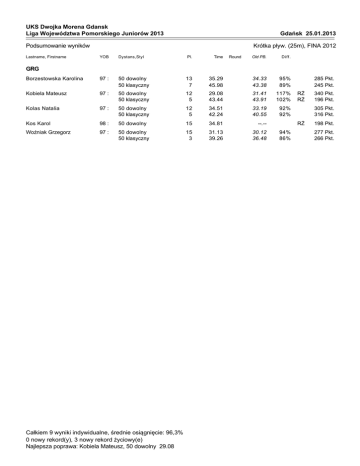 UKS Dwojka Morena Gdansk Liga Województwa Pomorskiego Juniorów 2013 Gdańsk 25.01.2013 Krótka pływ. (25m), FINA 2012 Podsumowanie wyników Lastname, Firstname YOB Dystans,Styl Pl. Time Borzestowska Karolina 97 : 50 dowolny 50 klasyczny 13 7 Kobiela Mateusz 97 : 50 dowolny 50 klasyczny Kolas Natalia 97 : Kos Karol Woźniak Grzegorz Round Old PB. Diff. 35.29 45.98 34.33 43.38 95% 89% 12 5 29.08 43.44 31.41 43.91 117% 102% 50 dowolny 50 klasyczny 12 5 34.51 42.24 33.19 40.55 92% 92% 98 : 50 dowolny 15 34.81 --.-- 97 : 50 dowolny 50 klasyczny 15 3 31.13 39.26 30.12 36.48 GRG Całkiem 9 wyniki indywidualne, średnie osiągnięcie: 96,3% 0 nowy rekord(y), 3 nowy rekord życiowy(e) Najlepsza poprawa: Kobiela Mateusz, 50 dowolny 29.08 285 Pkt. 245 Pkt. RŻ RŻ 305 Pkt. 316 Pkt. RŻ 94% 86% 340 Pkt. 196 Pkt. 198 Pkt. 277 Pkt. 266 Pkt. UKS Dwojka Morena Gdansk Liga Województwa Pomorskiego Juniorów 2013 Gdańsk 25.01.2013 Krótka pływ. (25m), FINA 2012 Podsumowanie wyników Lastname, Firstname YOB Dystans,Styl Pl. Time Augustyniak Kevin 96 : 50 dowolny 200 dowolny 2 3 Brzeziński Wojciech 96 : 50 dowolny 100 motylkowy Lejman Kacper 94 : Morawski Jakub Round Old PB. Diff. 24.65 2:00.43 24.27 1:56.28 97% 93% 5 7 25.73 1:03.73 26.14 1:08.42 103% 115% 50 klasyczny 3 32.84 30.81 88% 454 Pkt. 96 : 200 grzbietowy 100 motylkowy 2 2 2:10.83 58.58 2:05.31 58.52 92% 100% 533 Pkt. 566 Pkt. Olender Karol 96 : 200 dowolny 100 motylkowy 2 5 1:58.78 1:02.48 2:01.83 1:04.08 105% 105% RŻ RŻ 585 Pkt. 467 Pkt. Stiller Piotr 96 : 50 dowolny 200 dowolny 6 4 26.60 2:04.26 26.57 2:07.22 100% 105% RŻ 444 Pkt. 511 Pkt. 200 grzbietowy 50 klasyczny 5 2 2:23.39 32.26 --.-32.68 103% RŻ RŻ 405 Pkt. 479 Pkt. ABS Szczepankiewicz Mateusz 96 : Całkiem 13 wyniki indywidualne, średnie osiągnięcie: 100,5% 0 nowy rekord(y), 7 nowy rekord życiowy(e) Najlepsza poprawa: Brzeziński Wojciech, 100 motylkowy 1:03.73 558 Pkt. 561 Pkt. RŻ RŻ 491 Pkt. 440 Pkt. UKS Dwojka Morena Gdansk Liga Województwa Pomorskiego Juniorów 2013 Gdańsk 25.01.2013 Krótka pływ. (25m), FINA 2012 Podsumowanie wyników Lastname, Firstname YOB Dystans,Styl Pl. Time Bazylewicz Jan 99 : 50 dowolny 200 grzbietowy 16 6 Bruździak Maciej 98 : 200 dowolny 50 klasyczny Buczma Klaudia 99 : Round Old PB. Diff. 32.07 2:48.64 32.92 2:46.82 105% 98% RŻ 253 Pkt. 249 Pkt. 6 3 2:14.78 34.47 2:18.81 34.89 106% 102% RŻ RŻ 400 Pkt. 393 Pkt. 50 dowolny 200 dowolny 11 8 32.55 2:29.20 32.30 2:30.47 98% 102% RŻ 364 Pkt. 413 Pkt. GJCH Gutkowska Zuzanna 97 : 50 dowolny 50 klasyczny 7 2 31.10 40.64 31.15 43.46 100% 114% RŻ RŻ 417 Pkt. 355 Pkt. Kiryluk Damian 98 : 200 dowolny 100 motylkowy 5 4 2:14.10 1:10.13 2:18.89 1:09.11 107% 97% RŻ 406 Pkt. 330 Pkt. Kotlewski Michał 98 : 50 klasyczny 100 motylkowy 4 8 34.94 1:15.66 34.26 1:33.86 96% 154% RŻ 377 Pkt. 263 Pkt. 50 dowolny 200 grzbietowy 2 2 25.54 2:20.69 25.32 2:27.79 98% 110% RŻ 502 Pkt. 429 Pkt. Małecki Mateusz 98 : Molga Mateusz 99 : 50 dowolny 200 grzbietowy 11 4 30.86 2:30.96 31.86 2:39.03 107% 111% RŻ RŻ 284 Pkt. 347 Pkt. Paluszkiewicz Dawid 97 : 50 dowolny 200 grzbietowy 2 1 25.82 2:11.97 26.02 2:13.84 102% 103% RŻ RŻ 485 Pkt. 519 Pkt. Paluszkiewicz Rafał 99 : 50 dowolny 50 klasyczny 12 9 31.08 41.75 36.21 41.11 136% 97% RŻ 278 Pkt. 221 Pkt. Rubach Kamil 97 : 100 dowolny 200 dowolny 100 motylkowy ZSZ 5 2 59.24 2:11.09 1:01.94 59.51 2:13.13 1:02.00 101% 103% 100% RŻ RŻ RŻ 436 Pkt. 435 Pkt. 479 Pkt. Smoluchowska Magdalena 98 : 50 dowolny 200 dowolny 3 3 30.06 2:20.33 29.68 2:19.09 97% 98% 4 x 100 dowolny Mężczyzn Rubach Kamil Paluszkiewicz Dawid : 59.24 59.19 Całkiem 25 wyniki indywidualne, średnie osiągnięcie: 105,7% 0 nowy rekord(y), 17 nowy rekord życiowy(e) Najlepsza poprawa: Kotlewski Michał, 100 motylkowy 1:15.66 Kotlewski Michał Małecki Mateusz 1:01.12 57.95 2 462 Pkt. 497 Pkt. 3:57.50 UKS Dwojka Morena Gdansk Liga Województwa Pomorskiego Juniorów 2013 Gdańsk 25.01.2013 Krótka pływ. (25m), FINA 2012 Podsumowanie wyników Lastname, Firstname YOB Dystans,Styl Pl. Time Cygert Olaf 97 : 50 dowolny 200 dowolny 10 15 Giza Michał 97 : 50 dowolny 200 dowolny Round Old PB. Diff. 28.36 2:34.55 29.03 2:32.52 105% 97% 8 10 27.78 2:14.41 27.66 2:14.43 99% 100% 2 2 29.70 2:32.50 29.27 2:31.95 97% 99% 479 Pkt. 487 Pkt. 363 Pkt. 302 Pkt. G5 RŻ RŻ 366 Pkt. 265 Pkt. 390 Pkt. 404 Pkt. Juchnowicz Natalia 98 : 50 dowolny 200 grzbietowy Kamela Daniel 97 : 50 dowolny 200 dowolny 11 14 28.45 2:27.96 28.44 2:26.16 100% 98% Kędziora Magdalena 97 : 50 dowolny 200 dowolny 9 7 31.79 2:31.32 32.13 2:27.82 102% 95% Klonowska Magda 99 : 50 dowolny 50 klasyczny 6 9 31.44 43.30 31.27 43.00 99% 99% 404 Pkt. 294 Pkt. Klonowska Marta 98 : 50 dowolny 50 klasyczny 10 5 33.64 45.02 33.41 43.91 99% 95% 330 Pkt. 261 Pkt. Kołodziejska Weronika 97 : 50 dowolny 200 dowolny 8 5 31.25 2:26.71 31.24 2:25.98 100% 99% 411 Pkt. 435 Pkt. Liszewska Agata 98 : 50 dowolny 200 dowolny 11 10 34.06 2:45.05 33.76 2:40.74 98% 95% 318 Pkt. 305 Pkt. Modrzyński Kuba 99 : 50 dowolny 200 dowolny 10 21 30.78 2:54.78 31.47 2:52.54 105% 97% Skowyrska Agnieszka 98 : 50 dowolny 200 dowolny 7 8 32.52 2:33.11 32.41 2:30.44 99% 97% Świderska Oliwia 98 : 50 dowolny 200 dowolny 6 9 32.11 2:41.38 32.34 2:32.75 101% 90% RŻ 379 Pkt. 326 Pkt. Tomczyk Piotr 99 : 50 dowolny 200 dowolny 23 20 34.07 2:47.67 34.50 2:45.12 103% 97% RŻ 211 Pkt. 208 Pkt. Całkiem 26 wyniki indywidualne, średnie osiągnięcie: 98,7% 0 nowy rekord(y), 6 nowy rekord życiowy(e) Najlepsza poprawa: Cygert Olaf, 50 dowolny 28.36 RŻ RŻ 391 Pkt. 396 Pkt. 286 Pkt. 183 Pkt. 365 Pkt. 382 Pkt. UKS Dwojka Morena Gdansk Liga Województwa Pomorskiego Juniorów 2013 Gdańsk 25.01.2013 Krótka pływ. (25m), FINA 2012 Podsumowanie wyników Lastname, Firstname YOB Dystans,Styl Pl. Time Bartoszewski Jan 99 : 50 dowolny 22 Burzyńska Magdalena 99 : 50 dowolny 50 klasyczny Jankowski Kamil 99 : Jędrzejewska Marta Round Old PB. Diff. 33.86 34.80 106% RŻ 215 Pkt. 19 14 45.42 54.89 48.62