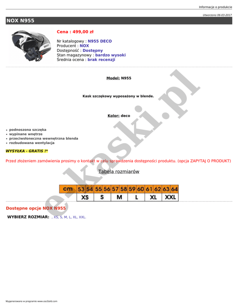 Informacje o produkcie Utworzono 06-03-2017 NOX N955 Cena : 499,00 zł Nr katalogowy : N955 DECO Producent : NOX Dostępność : Dostępny Stan magazynowy : bardzo wysoki Średnia ocena : brak recenzji l Model: N955 i.p Kask szczękowy wyposażony w blende. ● ● ● ● podnoszona szczęka wypinane wnętrze przeciwsłoneczna wewnętrzna blenda rozbudowana wentylacja WYSYŁKA - GRATIS !* sk Kolor: deco ka Przed złożeniem zamówienia prosimy o kontakt w celu sprawdzenia dostępności produktu. (opcja ZAPYTAJ O PRODUKT) e- Tabela rozmiarów Dostępne opcje NOX N955 WYBIERZ ROZMIAR: , XS, S, M, L, XL, XXL. Wygenerowano w programie www.oscGold.com