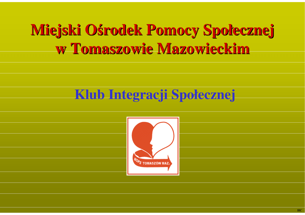 Miejski Ośrodek Pomocy Społecznej w Tomaszowie Mazowieckim Klub Integracji Społecznej HC Klub Integracji Społecznej Funkcjonuje od 2009r. w ramach wewnętrznej struktury Miejskiego Ośrodka Pomocy Społecznej w Tomaszowie Mazowieckim Celem Klubu jest reintegracja społeczna i zawodowa osób długotrwale bezrobotnych i klientów pomocy społecznej, osób dotkniętych dysfunkcjami oraz zagrożonych wykluczeniem społecznym poprzez edukację personalną, zawodową i społeczną w celu późniejszego osiągnięcia własnym staraniem klienta samodzielności ekonomicznej. Klub Integracji Społecznej Powołany zarządzeniem nr 25/2009 Prezydenta Miasta Tomaszowa Mazowieckiego z dn. 30.01.2009 w sprawie zatwierdzenia regulaminu organizacyjnego Miejskiego Ośrodka Pomocy Społecznej w Tomaszowie Mazowieckim. Działania – rok 2010 • Projekt „Mój dom w moich rękach” • Prace Społecznie Użyteczne • Grupa wsparcia dla osób współuzależnionych i dotkniętych przemocą domową • Indywidualne konsultacje psychologiczne • Porady prawne Rok 2010 – Mój dom w moich rękach Cel: poprawa sytuacji mieszkaniowej w sferze budownictwa socjalnego na terenie Gminy Miasto Tomaszów Maz. oraz zwiększenie aktywności zawodowej i społecznej osób uczestniczących w projekcie • Szkolenie dla 10 osób bezrobotnych • Remont 10 mieszkań socjalnych, w tym 1 chronione, 1 na cele eksmisji i 8 zamieszkiwanych przez rodziny w trudnej sytuacji ekonomicznej i społecznej Rok 2010 – Prace Społecznie Użyteczne • 55 osób bezrobotnych bez prawa do zasiłku • 9 000 wypracowanych godzin • 62 931 zł wydatkowane • Porządkowanie terenów zielonych, prace porządkowe, ograniczanie negatywnych skutków zimy, proste prace wykończeniowo-remontowe Rok 2010 – Grupa wsparcia • Grupa docelowa: osoby współuzależnione i dotknięte przemocą domową • Dominujące problemy: wychowawcze, emocjonalne, w relacjach, podtrzymywanie niewłaściwych, nieadekwatnych postaw • 5 osób ukończyło cykl spotkań Rok 2010 – Indywidualne konsultacje psychologiczne • 212 konsultacji • 96 osób • Konsultacje w gabinecie, w środowisku, praca w ramach Zespołów Interdyscyplinarnych • Dominujące problemy: przemoc w rodzinie, współuzależnienie, problemy wychowawcze, problemy emocjonalno-motywacyjne Rok 2010 – Porady prawne • 248 osób objętych poradami • 616 konsultacji • Dominujące problemy: sprawy lokalowe, rodzinne, spadkowe, ZUS, zadłużenia, eksmisje, przemoc • pomoc w przygotowywaniu apelacji, zażaleń, odwołań, pism procesowych • Współpraca z Zespołami Interdyscyplinarnymi Działania – rok 2011 • Prace Społecznie Użyteczne • Grupy wsparcia dla osób wspóluzależnionych, dotkniętych przemocą domową oraz bezdomnych • Indywidualne poradnictwo psychologiczne • Porady prawne • Projekt „Z uśmiechem w rodzinie” • Pogadanka-wykład skierowany do rodzin, beneficjentów MOPS, nawiązująca do ogólnopolskiej kampanii Postaw na Rodzinę Rok 2011 – Prace Społecznie Użyteczne • 70 osób bezrobotnych bez prawa do zasiłku • 10 000 wypracowanych godzin • 72 612 zł wydatkowane • Prace realizowano w Ośrodku Sportu i Rekreacji, Miejskim Ośrodku Pomocy Społecznej, lokalnych szkołach podstawowych, gimnazjach i przedszkolach. • Porządkowanie terenów zielonych, prace porządkowe, ograniczanie negatywnych skutków zimy. Rok 2011 – Grupy wsparcia • Grupa docelowa: osoby współuzależnione i dotknięte przemocą domową oraz osoby bezdomne • Dominujące problemy: wychowawcze, emocjonalne, w relacjach, podtrzymywanie niewłaściwych, nieadekwatnych postaw, uwikłanie w cykl przemocy, zaburzenia adaptacyjne, bezrobocie, bezdomność, poczucie bezradności i przeciążenia • 12 uczestników Rok 2011 – Indywidualne konsultacje psychologiczne • 226 konsultacji • 91 osób • Konsultacje w gabinecie, w środowisku, współpraca z Zespołem Interdyscyplinarnym • Dominujące problemy: przemoc w rodzinie, współuzależnienie, problemy wychowawcze, problemy emocjonalno-motywacyjne, bezrobocie, problemy mieszkaniowe, bezradność, bezdomność. Rok 2011 – Porady prawne • 213 osób objętych poradami • 521 konsultacji • Dominujące problemy: sprawy lokalowe, rodzinne, spadkowe, ZUS, zadłużenia, eksmisje, przemoc • Pomoc w przygotowywaniu apelacji, zażaleń, odwołań, pism procesowych • Praca w Zespole Interdyscyplinarnym Projekt „Z uśmiechem w rodzinie” • Realizowany w przerwie świątecznej (27-30 grudzień 2011r.) • Cele główne: zorganizowanie czasu wolnego dla dzieci, integracja rodzin, diagnoza występujących problemów, zachęcenie do pracy i wprowadzania zmian • Uczestnicy: 9 rodzin korzystających z pomocy społecznej, 10 rodziców i 22 dzieci • Porady prawne i psychologiczne • Zabawy, rekreacja, wyjście na kręgielnię, zajęcia taneczne z instruktorem • Działania wspierał Wydział Polityki Społecznej Urzędu Miasta oraz pracownicy socjalni MOPS Zestawienie Porady prawne Konsultacje psychologiczne Prace Społecznie Użyteczne Rok 2010 248 96 55 Rok 2011 213 91 70 Plan działania 2012 • Realizacja Prac Społecznie Użytecznych (15 000 godz.) • Porady prawne • Konsultacje psychologiczne • Konferencje tematyczne z zakresu przeciwdziałania wykluczeniu społecznemu • Szkolenia wewnętrzne dla pracowników MOPS wspierające kompetencje do pracy z klientami wykluczonymi i zagrożonymi wykluczeniem • Organizacja spotkań dla beneficjentów MOPS z przedstawicielami Centrum Nauki i Biznesu Żak, motywowanie do podjęcia bezpłatnej nauki • Działania nawiązujące do ogólnopolskiej kampanii Postaw na Rodzinę • Współpraca z instytucjami • Zajęcia dla uczniów szkół podstawowych i gimnazjów z zakresu przeciwdziałania wykluczeniu społecznemu, wskazywania możliwości uzyskania pomocy oraz uwrażliwiania na drugiego człowieka Współpraca i kontakt Miejska Komisja Rozwiązywa