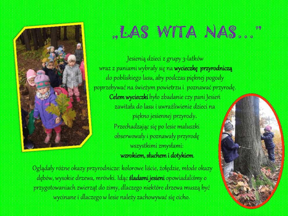 „LAS WITA NAS…” Jesienią dzieci z grupy 3-latków wraz z paniami wybrały się na wycieczkę przyrodniczą do pobliskiego lasu, aby podczas pięknej pogody poprzebywać na świeżym powietrzu i poznawać przyrodę. Celem wycieczki było zbadanie czy pani Jesień zawitała do lasu i uwrażliwienie dzieci na piękno jesiennej przyrody. Przechadzając się po lesie maluszki obserwowały i poznawały przyrodę wszystkimi zmysłami: wzrokiem, słuchem i dotykiem. Oglądały różne okazy przyrodnicze: kolorowe liście, żołędzie, młode okazy dębów, wysokie drzewa, mrówki. Idąc śladami jesieni opowiadaliśmy o przygotowaniach zwierząt do zimy, dlaczego niektóre drzewa muszą być wycinane i dlaczego w lesie należy zachowywać się cicho. Dzieci z zainteresowaniem obserwowały otaczająca przyrodę leśną i słuchając odgłosów lasu zbierały skarby Pani Jesieni do jesiennego zakątka: żołędzie, szyszki, liście, suche igły drzew… Szczególnie zachwyciła nas różnorodna kolorystyka opadających liści: czerwienie, pomarańcze, żółcie i brązy rozbudzały wyobraźnię. Zajęcia przyrodnicze w terenie to ciekawy sposób na aktywne zdobywanie wiedzy. Jednak czas płynie szybko i musieliśmy pożegnać przyrodę. Pełni wrażeń z uśmiechem na twarzy wróciliśmy do przedszkola, gdyż czekał tam na dzieci ciepły obiadek. Mamy nadzieję, że na leśne ścieżki wrócimy jeszcze nie raz. Wycieczka do jesiennego lasu tak zainspirowała naszych wychowanków, że na zajęciach plastycznych wykonaliśmy przestrzenne wiewiórki, muchomorki, sylwety z suszonych liści i ślimaczki z kasztanów. Nauczyliśmy się także tańca z kasztankami. Dopełnienie jesiennych inspiracji stanowiły eksperymenty z barwieniem wody w kolorach jesieni i mieszanie barw podstawowych tworząc barwy pochodne. Ten rodzaj aktywności bardzo spodobał się naszym maluszkom. Opracowały: Dorota Kupka, Sabina Laszczak „W lesie są drzewa, w lesie są grzyby. W lesie ja jestem, bardzo szczęśliwy. W lesie są ptaki, są i zające. Świeże powietrze, ładnie pachnące. Łukasz Baran
