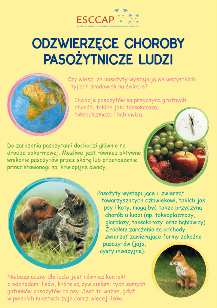 ODZWIERZĘCE CHOROBY PASOŻYTNICZE LUDZI Czy wiesz, że pasożyty występują we wszystkich typach środowisk na świecie? Inwazje pasożytów są przyczyną groźnych chorób, takich jak: toksokaroza, toksoplazmoza i bąblowica. Do zarażenia pasożytami dochodzi głównie na drodze pokarmowej. Możliwe jest również aktywne wnikanie pasożytów przez skórę lub przenoszenie przez stawonogi np. krwiopijne owady. Pasożyty występujące u zwierząt towarzyszących człowiekowi, takich jak psy i koty, mogą być także przyczyną chorób u ludzi (np. toksoplazmozy, giardiozy, toksokarozy oraz bąblowicy). Źródłem zarażenia są odchody zwierząt zawierające formy zakaźne pasożytów (jaja, cysty inwazyjne). Niebezpieczny dla ludzi jest również kontakt z odchodami lisów, które są żywicielami tych samych gatunków pasożytów co psy. Jest to ważne, gdyż w polskich miastach żyje coraz więcej lisów. Co zrobić, aby zapobiec pasożytniczym chorobom odzwierzęcym? Myj ręce po zabawie ze zwierzętami, grach i zabawach na świeżym powietrzu, a szczególnie przed posiłkami! Unikaj kontaktu z nieznanymi zwierzętami! Dbaj o czystość w swoim domu! Nie spożywaj posiłków w trakcie zabaw! Sprzątaj odchody po swoich zwierzętach! Regularnie odwiedzaj ze swoim pupilem lekarza weterynarii! Systematycznie odrobaczaj zwierzęta! Kontakt: Pracownia Parazytoz Zwierząt Domowych Instytutu Parazytologii PAN, ul. Twarda 51/55, 00-818 Warszawa, tel. 22 697 89 68 Konsultacja merytoryczna: Oddział Oświaty Zdrowotnej i Promocji Zdrowia WSSE w Warszawie oraz Klinika Chorób Zakaźnych Wieku Dziecięcego Warszawskiego Uniwersytetu Medycznego Wydawca: Polska Rada Konsultacyjna do Spraw Parazytoz Zwierząt Towarzyszących, członek ESCCAP, przy pomocy sponsorów: www.esccap.pl