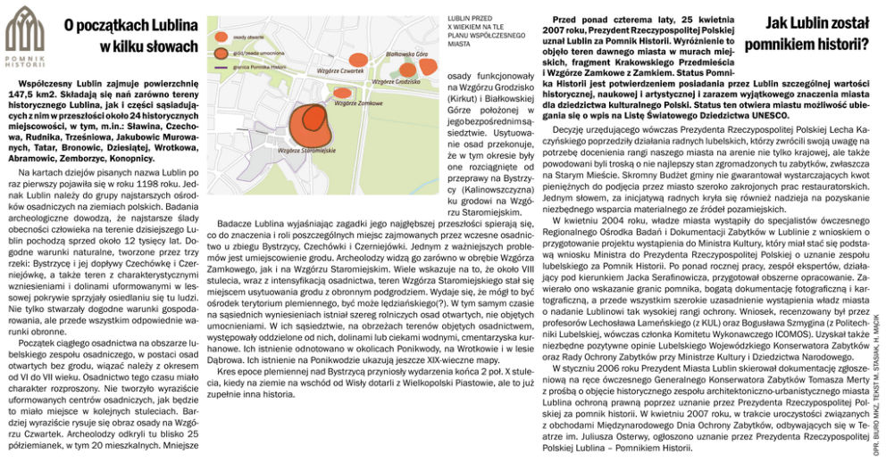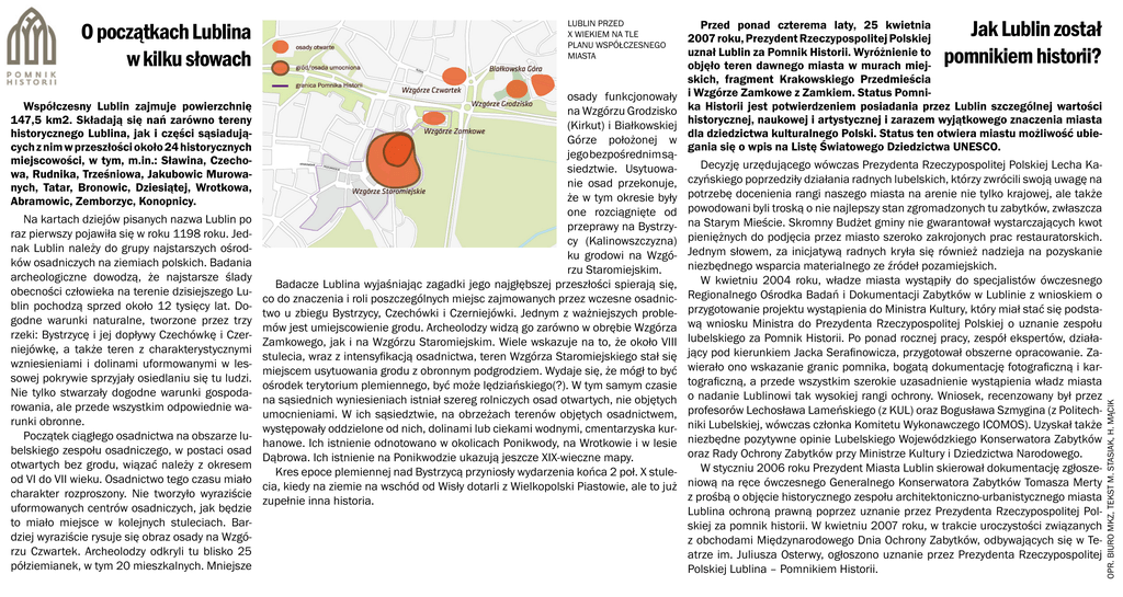 Współczesny Lublin zajmuje powierzchnię 147,5 km2. Składają się nań zarówno tereny historycznego Lublina, jak i części sąsiadujących z nim w przeszłości około 24 historycznych miejscowości, w tym, m.in.: Sławina, Czechowa, Rudnika, Trześniowa, Jakubowic Murowanych, Tatar, Bronowic, Dziesiątej, Wrotkowa, Abramowic, Zemborzyc, Konopnicy. Na kartach dziejów pisanych nazwa Lublin po raz pierwszy pojawiła się w roku 1198 roku. Jednak Lublin należy do grupy najstarszych ośrodków osadniczych na ziemiach polskich. Badania archeologiczne dowodzą, że najstarsze ślady obecności człowieka na terenie dzisiejszego Lublin pochodzą sprzed około 12 tysięcy lat. Dogodne warunki naturalne, tworzone przez trzy rzeki: Bystrzycę i jej dopływy Czechówkę i Czerniejówkę, a także teren z charakterystycznymi wzniesieniami i dolinami uformowanymi w lessowej pokrywie sprzyjały osiedlaniu się tu ludzi. Nie tylko stwarzały dogodne warunki gospodarowania, ale przede wszystkim odpowiednie warunki obronne. Początek ciągłego osadnictwa na obszarze lubelskiego zespołu osadniczego, w postaci osad otwartych bez grodu, wiązać należy z okresem od VI do VII wieku. Osadnictwo tego czasu miało charakter rozproszony. Nie tworzyło wyraziście uformowanych centrów osadniczych, jak będzie to miało miejsce w kolejnych stuleciach. Bardziej wyraziście rysuje się obraz osady na Wzgórzu Czwartek. Archeolodzy odkryli tu blisko 25 półziemianek, w tym 20 mieszkalnych. Mniejsze osady funkcjonowały na Wzgórzu Grodzisko (Kirkut) i Białkowskiej Górze położonej w jego bezpośrednim sąsiedztwie. Usytuowanie osad przekonuje, że w tym okresie były one rozciągnięte od przeprawy na Bystrzycy (Kalinowszczyzna) ku grodowi na Wzgórzu Staromiejskim. Badacze Lublina wyjaśniając zagadki jego najgłębszej przeszłości spierają się, co do znaczenia i roli poszczególnych miejsc zajmowanych przez wczesne osadnictwo u zbiegu Bystrzycy, Czechówki i Czerniejówki. Jednym z ważniejszych problemów jest umiejscowienie grodu. Archeolodzy widzą go zarówno w obrębie Wzgórza Zamkowego, jak i na Wzgórzu Staromiejskim. Wiele wskazuje na to, że około VIII stulecia, wraz z intensyfikacją osadnictwa, teren Wzgórza Staromiejskiego stał się miejscem usytuowania grodu z obronnym podgrodziem. Wydaje się, że mógł to być ośrodek terytorium plemiennego, być może lędziańskiego(?). W tym samym czasie na sąsiednich wyniesieniach istniał szereg rolniczych osad otwartych, nie objętych umocnieniami. W ich sąsiedztwie, na obrzeżach terenów objętych osadnictwem, występowały oddzielone od nich, dolinami lub ciekami wodnymi, cmentarzyska kurhanowe. Ich istnienie odnotowano w okolicach Ponikwody, na Wrotkowie i w lesie Dąbrowa. Ich istnienie na Ponikwodzie ukazują jeszcze XIX-wieczne mapy. Kres epoce plemiennej nad Bystrzycą przyniosły wydarzenia końca 2 poł. X stulecia, kiedy na ziemie na wschód od Wisły dotarli z Wielkopolski Piastowie, ale to już zupełnie inna historia. Jak Lublin został pomnikiem historii? Przed ponad czterema laty, 25 kwietnia 2007 roku, Prezydent Rzeczypospolitej Polskiej uznał Lublin za Pomnik Historii. Wyróżnienie to objęło teren dawnego miasta w murach miejskich, fragment Krakowskiego Przedmieścia i Wzgórze Zamkowe z Zamkiem. Status Pomnika Historii jest potwierdzeniem posiadania przez Lublin szczególnej wartości historycznej, naukowej i artystycznej i zarazem wyjątkowego znaczenia miasta dla dziedzictwa kulturalnego Polski. Status ten otwiera miastu możliwość ubiegania się o wpis na Listę Światowego Dziedzictwa UNESCO. Decyzję urzędującego wówczas Prezydenta Rzeczypospolitej Polskiej Lecha Kaczyńskiego poprzedziły działania radnych lubelskich, którzy zwrócili swoją uwagę na potrzebę docenienia rangi naszego miasta na arenie nie tylko krajowej, ale także powodowani byli troską o nie najlepszy stan zgromadzonych tu zabytków, zwłaszcza na Starym Mieście. Skromny Budżet gminy nie gwarantował wystarczających kwot pieniężnych do podjęcia przez miasto szeroko zakrojonych prac restauratorskich. Jednym słowem, za inicjatywą radnych kryła się również nadzieja na pozyskanie niezbędnego wsparcia materialnego ze źródeł pozamiejskich. W kwietniu 2004 roku, władze miasta wystąpiły do specjalistów ówczesnego Regionalnego Ośrodka Badań i Dokumentacji Zabytków w Lublinie z wnioskiem o przygotowanie projektu wystąpienia do Ministra Kultury, który miał stać się podstawą wniosku Ministra do Prezydenta Rzeczypospolitej Polskiej o uznanie zespołu lubelskiego za Pomnik Historii. Po ponad rocznej pracy, zespół ekspertów, działający pod kierunkiem Jacka Serafinowicza, przygotował obszerne opracowanie. Zawierało ono wskazanie granic pomnika, bogatą dokumentację fotograficzną i kartograficzną, a przede wszystkim szerokie uzasadnienie wystąpienia władz miasta o nadanie Lublinowi tak wysokiej rangi ochrony. Wniosek, recenzowany był przez profesorów Lechosława Lameńskiego (z KUL) oraz Bogusława Szmygina (z Politechniki Lubelskiej, wówczas członka Komitetu Wykonawczego ICOMOS). Uzyskał także niezbędne pozytywne opinie Lubelskiego Wojewódzkiego Konserwatora Zabytków oraz Rady Ochrony Zabytków przy Ministrze Kultury i Dziedzictwa Narodowego. W styczniu 2006 roku Prezydent Miasta Lublin skierował dokumentację zgłoszeniową na ręce ówczesnego Generalnego Konserwatora Zabytków Tomasza Merty z prośbą o objęcie historycznego zespołu architektoniczno-urbanistycznego miasta Lublina ochroną prawną poprzez uznanie przez Prezydenta Rzeczypospolitej Polskiej za pomnik historii. W kwietniu 2007 roku, w trakcie uroczystości związanych z obchodami Międzynarodowego Dnia Ochrony Zabytków, odbywających się w Teatrze im. Juliusza Osterwy, ogłoszono uznanie przez Prezydenta Rzeczypospolitej Polskiej Lublina – Pomnikiem Historii. OPR. BIURO MKZ, tekst M. Stasiak, H. Mącik O początkach Lub