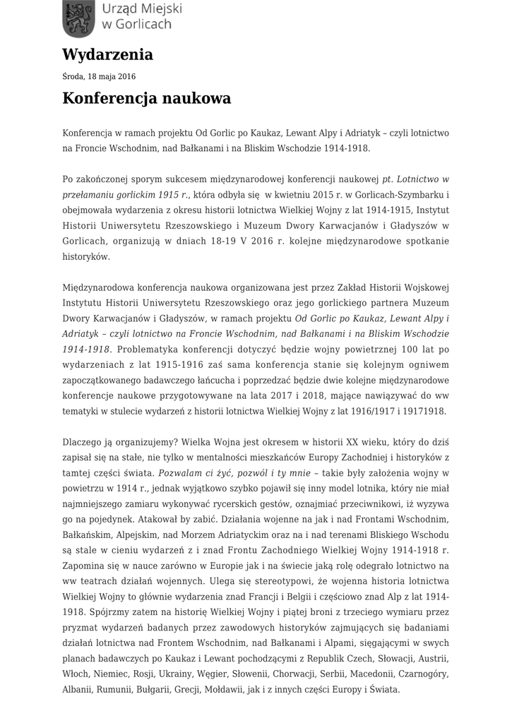 Wydarzenia Środa, 18 maja 2016 Konferencja naukowa Konferencja w ramach projektu Od Gorlic po Kaukaz, Lewant Alpy i Adriatyk – czyli lotnictwo na Froncie Wschodnim, nad Bałkanami i na Bliskim Wschodzie 1914-1918. Po zakończonej sporym sukcesem międzynarodowej konferencji naukowej pt. Lotnictwo w przełamaniu gorlickim 1915 r., która odbyła się w kwietniu 2015 r. w Gorlicach-Szymbarku i obejmowała wydarzenia z okresu historii lotnictwa Wielkiej Wojny z lat 1914-1915, Instytut Historii Uniwersytetu Rzeszowskiego i Muzeum Dwory Karwacjanów i Gładyszów w Gorlicach, organizują w dniach 18-19 V 2016 r. kolejne międzynarodowe spotkanie historyków. Międzynarodowa konferencja naukowa organizowana jest przez Zakład Historii Wojskowej Instytutu Historii Uniwersytetu Rzeszowskiego oraz jego gorlickiego partnera Muzeum Dwory Karwacjanów i Gładyszów, w ramach projektu Od Gorlic po Kaukaz, Lewant Alpy i Adriatyk – czyli lotnictwo na Froncie Wschodnim, nad Bałkanami i na Bliskim Wschodzie 1914-1918. Problematyka konferencji dotyczyć będzie wojny powietrznej 100 lat po wydarzeniach z lat 1915-1916 zaś sama konferencja stanie się kolejnym ogniwem zapoczątkowanego badawczego łańcucha i poprzedzać będzie dwie kolejne międzynarodowe konferencje naukowe przygotowywane na lata 2017 i 2018, mające nawiązywać do ww tematyki w stulecie wydarzeń z historii lotnictwa Wielkiej Wojny z lat 1916/1917 i 19171918. Dlaczego ją organizujemy? Wielka Wojna jest okresem w historii XX wieku, który do dziś zapisał się na stałe, nie tylko w mentalności mieszkańców Europy Zachodniej i historyków z tamtej części świata. Pozwalam ci żyć, pozwól i ty mnie – takie były założenia wojny w powietrzu w 1914 r., jednak wyjątkowo szybko pojawił się inny model lotnika, który nie miał najmniejszego zamiaru wykonywać rycerskich gestów, oznajmiać przeciwnikowi, iż wyzywa go na pojedynek. Atakował by zabić. Działania wojenne na jak i nad Frontami Wschodnim, Bałkańskim, Alpejskim, nad Morzem Adriatyckim oraz na i nad terenami Bliskiego Wschodu są stale w cieniu wydarzeń z i znad Frontu Zachodniego Wielkiej Wojny 1914-1918 r. Zapomina się w nauce zarówno w Europie jak i na świecie jaką rolę odegrało lotnictwo na ww teatrach działań wojennych. Ulega się stereotypowi, że wojenna historia lotnictwa Wielkiej Wojny to głównie wydarzenia znad Francji i Belgii i częściowo znad Alp z lat 19141918. Spójrzmy zatem na historię Wielkiej Wojny i piątej broni z trzeciego wymiaru przez pryzmat wydarzeń badanych przez zawodowych historyków zajmujących się badaniami działań lotnictwa nad Frontem Wschodnim, nad Bałkanami i Alpami, sięgającymi w swych planach badawczych po Kaukaz i Lewant pochodzącymi z Republik Czech, Słowacji, Austrii, Włoch, Niemiec, Rosji, Ukrainy, Węgier, Słowenii, Chorwacji, Serbii, Macedonii, Czarnogóry, Albanii, Rumunii, Bułgarii, Grecji, Mołdawii, jak i z innych części Europy i Świata. Termin konferencji: 18-19 V 2016 r. Miejsce konferencji: Ośrodek Konferencyjno-Wystawienniczy "Kasztel w Szymbarku" Język konferencji: polski, niemiecki i angielski (ewentualnie słowiański – narodowy dla przedstawicieli z Europy Wschodniej i Południowej) Czas prezentacji: 20 minut Referat do druku: 25 stron Data zgłoszeń udziału w konferencji: do 1 III 2016 r. na kontakt: dr Paweł Korzeniowski - [email protected] dr Krzysztof Mroczkowski - [email protected] Organizatorzy konferencji zapewniają nocleg, wyżywienie i zwrot kosztów podróży. Międzynarodowa konferencja zakończona będzie recenzowanym, opracowaniem drukowanym, pierwszym tego typu na świecie. Opieka merytoryczna: dr hab. Andrzej Olejko prof. UR Kierownik Zakładu Historii Wojskowej Instytutu Historii Uniwersytetu rzeszowskiego