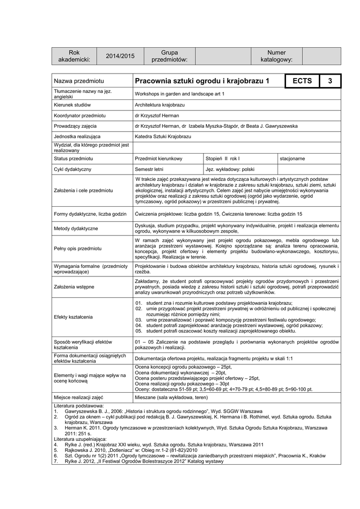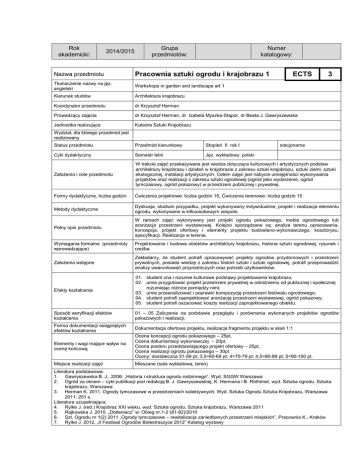 Rok akademicki: 2014/2015 Grupa przedmiotów: Numer katalogowy: Nazwa przedmiotu Pracownia sztuki ogrodu i krajobrazu 1 ECTS Tłumaczenie nazwy na jęz. angielski Workshops in garden and landscape art 1 Kierunek studiów Architektura krajobrazu Koordynator przedmiotu dr Krzysztof Herman Prowadzący zajęcia dr Krzysztof Herman, dr Izabela Myszka-Stąpór, dr Beata J. Gawryszewska Jednostka realizująca Katedra Sztuki Krajobrazu 3 Wydział, dla którego przedmiot jest realizowany Status przedmiotu Przedmiot kierunkowy Stopień II rok I Cykl dydaktyczny Semestr letni Jęz. wykładowy: polski Założenia i cele przedmiotu W trakcie zajęć przekazywana jest wiedza dotycząca kulturowych i artystycznych podstaw architektury krajobrazu i działań w krajobrazie z zakresu sztuki krajobrazu, sztuki ziemi, sztuki ekologicznej, instalacji artystycznych. Celem zajęć jest nabycie umiejętności wykonywania projektów oraz realizacji z zakresu sztuki ogrodowej (ogród jako wydarzenie, ogród tymczasowy, ogród pokazowy) w przestrzeni publicznej i prywatnej. Formy dydaktyczne, liczba godzin Ćwiczenia projektowe: liczba godzin 15, Ćwiczenia terenowe: liczba godzin 15 Metody dydaktyczne Dyskusja, studium przypadku, projekt wykonywany indywidualnie, projekt i realizacja elementu ogrodu, wykonywane w kilkuosobowym zespole, Pełny opis przedmiotu W ramach zajęć wykonywany jest projekt ogrodu pokazowego, mebla ogrodowego lub aranżacja przestrzeni wystawowej. Kolejno sporządzane są: analiza terenu opracowania, koncepcja, projekt ofertowy i elementy projektu budowlano-wykonawczego, kosztorysu, specyfikacji. Realizacja w terenie. Wymagania formalne (przedmioty wprowadzające) Projektowanie i budowa obiektów architektury krajobrazu, historia sztuki ogrodowej, rysunek i rzeźba. Założenia wstępne Zakładamy, że student potrafi opracowywać projekty ogrodów przydomowych i przestrzeni prywatnych, posiada wiedzę z zakresu historii sztuki i sztuki ogrodowej, potrafi przeprowadzić analizy uwarunkowań przyrodniczych oraz potrzeb użytkowników. Efekty kształcenia 01. student zna i rozumie kulturowe podstawy projektowania krajobrazu; 02. umie przygotować projekt przestrzeni prywatnej w odróżnieniu od publicznej i społecznej rozumiejąc różnice pomiędzy nimi; 03. umie przeanalizować i poprawić kompozycję przestrzeni festiwalu ogrodowego; 04. student potrafi zaprojektować aranżację przestrzeni wystawowej, ogród pokazowy; 05. student potrafi oszacować koszty realizacji zaprojektowanego obiektu. Sposób weryfikacji efektów kształcenia 01 – 05 Zaliczenie na podstawie przeglądu i porównania wykonanych projektów ogrodów pokazowych i realizacji. Forma dokumentacji osiągniętych efektów kształcenia Dokumentacja ofertowa projektu, realizacja fragmentu projektu w skali 1:1 Elementy i wagi mające wpływ na ocenę końcową Ocena koncepcji ogrodu pokazowego – 25pt, Ocena dokumentacji wykonawczej – 20pt, Ocena posteru przedstawiającego projekt ofertowy – 25pt, Ocena realizacji ogrodu pokazowego – 30pt Oceny: dostateczna 51-59 pt; 3,5=60-69 pt; 4=70-79 pt; 4,5=80-89 pt; 5=90-100 pt. Miejsce realizacji zajęć Mieszane (sala wykładowa, teren) stacjonarne Literatura podstawowa: 1. Gawryszewska B. J., 2006: „Historia i struktura ogrodu rodzinnego”, Wyd. SGGW Warszawa 2. Ogród za oknem – cykl publikacji pod redakcją B. J. Gawryszewskiej, K. Hermana i B. Rothimel, wyd. Sztuka ogrodu. Sztuka krajobrazu, Warszawa 3. Herman K. 2011. Ogrody tymczasowe w przestrzeniach kolektywnych, Wyd. Sztuka Ogrodu Sztuka Krajobrazu, Warszawa 2011: 251 s. Literatura uzupełniająca: 4. Rylke J. (red.) Krajobraz XXI wieku, wyd. Sztuka ogrodu. Sztuka krajobrazu, Warszawa 2011 5. Rajkowska J. 2010, „Dotleniacz” w: Obieg nr.1-2 (81-82)/2010 6. Szt. Ogrodu nr 1(2) 2011 „Ogrody tymczasowe – rewitalizacja zaniedbanych przestrzeni miejskich”, Pracownia K., Kraków 7. Rylke J. 2012, „II Festiwal Ogrodów Bolestraszyce 2012” Katalog wystawy UWAGI: Do uzyskania oceny pozytywnej niezbędne jest wykonanie każdej opisanych prac cząstkowych. Wskaźniki ilościowe charakteryzujące moduł/przedmiot Szacunkowa sumaryczna liczba godzin pracy studenta (kontaktowych i pracy własnej) niezbędna dla osiągnięcia zakładanych efektów kształcenia - na tej podstawie należy wypełnić pole ECTS Łączna liczba punktów ECTS, którą student uzyskuje na zajęciach wymagających bezpośredniego udziału nauczycieli akademickich: Łączna liczba punktów ECTS, którą student uzyskuje w ramach zajęć o charakterze praktycznym, takich jak zajęcia laboratoryjne, projektowe, itp.: 75 h 1,2 ECTS 2 ECTS Tabela zgodności kierunkowych efektów kształcenia efektami przedmiotu Nr /symbol efektu Wymienione w wierszu efekty kształcenia 01 student zna i rozumie kulturowe podstawy projektowania krajobrazu; umie przygotować projekt przestrzeni prywatnej w odróżnieniu od publicznej i społecznej rozumiejąc różnice pomiędzy nimi; umie przeanalizować i poprawić kompozycję przestrzeni festiwalu ogrodowego; student potrafi zaprojektować i wykonać aranżację przestrzeni wystawowej, ogród pokazowy; student potrafi oszacować koszty realizacji zaprojektowanego obiektu. 02 03 04 05 Odniesienie do efektów dla programu kształcenia na kierunku AK2_W05 AK2_U02 AK2_K04 AK2_U08 AK2_U02