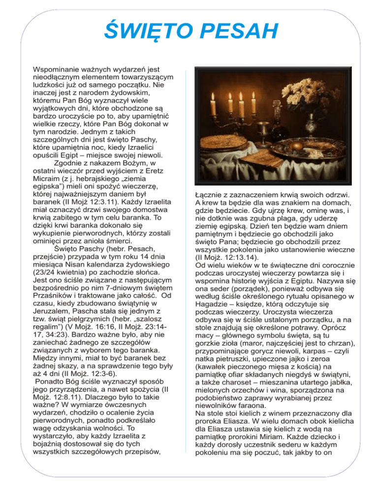 ŚWIĘTO PESAH Wspominanie ważnych wydarzeń jest nieodłącznym elementem towarzyszącym ludzkości już od samego początku. Nie inaczej jest z narodem żydowskim, któremu Pan Bóg wyznaczył wiele wyjątkowych dni, które obchodzone są bardzo uroczyście po to, aby upamiętnić wielkie rzeczy, które Pan Bóg dokonał w tym narodzie. Jednym z takich szczególnych dni jest święto Paschy, które upamiętnia noc, kiedy Izraelici opuścili Egipt – miejsce swojej niewoli. Zgodnie z nakazem Bożym, w ostatni wieczór przed wyjściem z Eretz Micraim (z j. hebrajskiego „ziemia egipska”) mieli oni spożyć wieczerzę, której najważniejszym daniem był baranek (II Mojż 12:3.11). Każdy Izraelita miał oznaczyć drzwi swojego domostwa krwią zabitego w tym celu baranka. To dzięki krwi baranka dokonało się wykupienie pierworodnych, którzy zostali ominięci przez anioła śmierci. Święto Paschy (hebr. Pesach, przejście) przypada w tym roku 14 dnia miesiąca Nisan kalendarza żydowskiego (23/24 kwietnia) po zachodzie słońca. Jest ono ściśle związane z następującym bezpośrednio po nim 7-dniowym świętem Przaśników i traktowane jako całość. Od czasu, kiedy zbudowano świątynię w Jeruzalem, Pascha stała się jednym z tzw. świąt pielgrzymich (hebr. „szalosz regalim”) (V Mojż. 16:16, II Mojż. 23:1417, 34:23). Bardzo ważne było, aby nie zaniechać żadnego ze szczegółów związanych z wyborem tego baranka. Między innymi, miał to być baranek bez żadnej skazy, a na sprawdzenie tego były aż 4 dni (II Mojż. 12:3-6). Ponadto Bóg ściśle wyznaczył sposób jego przyrządzenia, a nawet spożycia (II Mojż. 12:8.11). Dlaczego było to takie ważne? W wymiarze ówczesnych wydarzeń, chodziło o ocalenie życia pierworodnych, ponadto podkreślało wagę odzyskania wolności. To wystarczyło, aby każdy Izraelita z bojaźnią dostosował się do tych wszystkich szczegółowych przepisów, Łącznie z zaznaczeniem krwią swoich odrzwi. A krew ta będzie dla was znakiem na domach, gdzie będziecie. Gdy ujrzę krew, ominę was, i nie dotknie was zgubna plaga, gdy uderzę ziemię egipską. Dzień ten będzie wam dniem pamiętnym i będziecie go obchodzili jako święto Pana; będziecie go obchodzili przez wszystkie pokolenia jako ustanowienie wieczne (II Mojż. 12:13.14). Od wielu wieków w te świąteczne dni corocznie podczas uroczystej wieczerzy powtarza się i wspomina historię wyjścia z Egiptu. Nazywa się ona seder (porządek), ponieważ odbywa się według ściśle określonego rytuału opisanego w Hagadzie – księdze, którą odczytuje się podczas wieczerzy. Uroczysta wieczerza odbywa się w ściśle ustalonym porządku, a na stole znajdują się określone potrawy. Oprócz macy – głównego symbolu święta, są tu gorzkie zioła (maror, najczęściej jest to chrzan), przypominające gorycz niewoli, karpas – czyli natka pietruszki, upieczone jajko i zeroa (kawałek pieczonego mięsa z kością) na pamiątkę ofiar składanych niegdyś w świątyni, a także charoset – mieszanina utartego jabłka, mielonych orzechów i wina, sporządzona na podobieństwo zaprawy wyrabianej przez niewolników faraona. Na stole stoi kielich z winem przeznaczony dla proroka Eliasza. W wielu domach obok kielicha dla Eliasza ustawia się kielich z wodą na pamiątkę prorokini Miriam. Każde dziecko i każdy dorosły uczestnik sederu w każdym pokoleniu ma się poczuć, tak jakby to on Osobiście został wyzwolony z niewoli egipskiej, a zarazem ma pamiętać o niewoli egipskiej – tak jakby on był niewolnikiem w Egipcie za czasów faraona. Jest to wielka lekcja empatii, a także solidarności i umacniania więzi międzypokoleniowej. Żydowscy mędrcy piszą, że lud spożywał macę wolności nie dlatego, że został wybawiony z Egiptu, ale raczej dlatego, że został wybawiony w Egipcie. Oznacza to, że celebrowanie sederu nie tyle wyraża rzeczywiste zbawienie, co wiarę w Słowo Boże, wobietnicę daną ludowi przez Wszechmogącego, iż będzie zbawiony (wyjdzie z Egiptu). Dlatego Pesach nie tyle jest świętem zbawienia, co wiary w zbawienie. Zachęca nas to do modlitwy o synów i córki Abrahama, którzy będą uczestniczyć w świątecznych wieczerzach sederowych, aby odmawiając dwunastowieczną modlitwę Majmonidesa, Ani Maamin: „Wierzę pełnią wiary w przyjcie Mesjasza, i nawet jeśli się opóźnia, będę oczekiwać na niego każdego dnia, dopóki nie przyjdzie”, wielu z nich rychło doznało błogosławieństwa rozpoznania Go w osobie Jeszui z Nazaretu. Jeśli więc Syn was wyswobodzi, prawdziwie wolnymi będziecie J 8:36. Dziś wiemy, że każdy szczegół ówczesnej Paschy wybiegał w daleką przyszłość, gdyż baranek paschalny obrazował Zbawiciela – Baranka Bożego (Jana 1:29). Stąd bezwzględne zalecenia: aby baranek był bez skazy (II Mojż. 12:5, porównaj z Hebr. 9:14), aby nie łamano żadnej jego kości (II Mojż. 12:46, porównaj z Jana 19:36) oraz aby jego krwią oznaczyć drzwi swojego domostwa na znak wiary, iż ta krew ocala życie (II Mojż. 12:22.23, porównaj z Rzym. 5:9). Fakt, iż Pan Jezus wjechał do Jerozolimy dokładnie 10 dnia miesiąca Nisan symbolizował, że jest On prawdziwym barankiem paschalnym. I tak jak baranek ofiarowany na ołtarzu w świątyni był sprawdzany przed Paschą, tak i Jezus był poddany sprawdzeniu przez „arcykapłanów i uczonych w Piśmie” w tych dniach (Mat 21:23.27; Mat 23) i nie znaleziono w nim żadnej winy (Jan 19:4; 1 Piotr 1:18.21), co potwierdziło, że był godny, aby zostać ofiarowanym jako zadośćuczynienie za nasze grzechy. Istnieje jeszcze szereg innych proroczych obrazów wskazujących na Zbawiciela. Przed świętem Paschy należało usunąć z domostw wszelki zakwas (w j. hebrajskim „chamec”) (II Mojż.12:15,19 13:7). Rytuał związany ze sprzątaniem domu i usuwaniem chamecu jest przestrzegany przez pobożne rodziny żydowskie do dnia dzisiejszego i w języku hebr