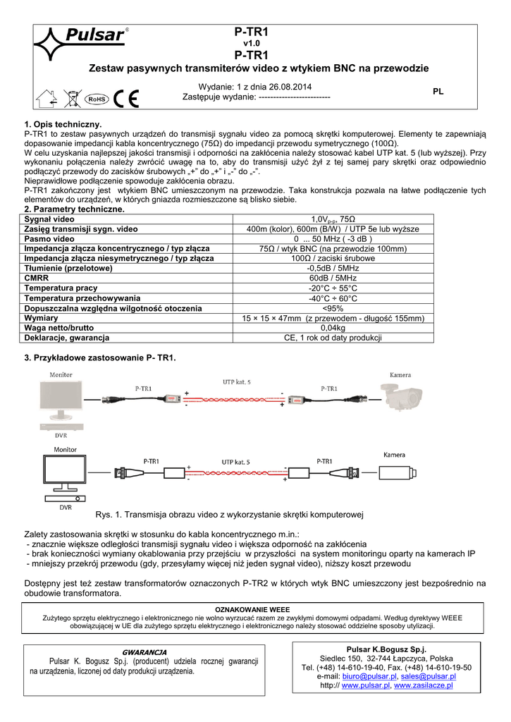 P-TR1 v1.0 P-TR1 Zestaw pasywnych transmiterów video z wtykiem BNC na przewodzie Wydanie: 1 z dnia 26.08.2014 Zastępuje wydanie: ------------------------- PL 1. Opis techniczny. P-TR1 to zestaw pasywnych urządzeń do transmisji sygnału video za pomocą skrętki komputerowej. Elementy te zapewniają dopasowanie impedancji kabla koncentrycznego (75Ω) do impedancji przewodu symetrycznego (100Ω). W celu uzyskania najlepszej jakości transmisji i odporności na zakłócenia należy stosować kabel UTP kat. 5 (lub wyższej). Przy wykonaniu połączenia należy zwrócić uwagę na to, aby do transmisji użyć żył z tej samej pary skrętki oraz odpowiednio podłączyć przewody do zacisków śrubowych „+” do „+” i „-” do „-”. Nieprawidłowe podłączenie spowoduje zakłócenia obrazu. P-TR1 zakończony jest wtykiem BNC umieszczonym na przewodzie. Taka konstrukcja pozwala na łatwe podłączenie tych elementów do urządzeń, w których gniazda rozmieszczone są blisko siebie. 2. Parametry techniczne. Sygnał video 1,0Vp-p, 75Ω Zasięg transmisji sygn. video 400m (kolor), 600m (B/W) / UTP 5e lub wyższe Pasmo video 0 ... 50 MHz ( -3 dB ) Impedancja złącza koncentrycznego / typ złącza 75Ω / wtyk BNC (na przewodzie 100mm) Impedancja złącza niesymetrycznego / typ złącza 100Ω / zaciski śrubowe Tłumienie (przelotowe) -0,5dB / 5MHz CMRR 60dB / 5MHz Temperatura pracy -20°C ÷ 55°C Temperatura przechowywania -40°C ÷ 60°C Dopuszczalna względna wilgotność otoczenia <95% Wymiary 15 × 15 × 47mm (z przewodem - długość 155mm) Waga netto/brutto 0,04kg Deklaracje, gwarancja CE, 1 rok od daty produkcji 3. Przykładowe zastosowanie P- TR1. Rys. 1. Transmisja obrazu video z wykorzystanie skrętki komputerowej Zalety zastosowania skrętki w stosunku do kabla koncentrycznego m.in.: - znacznie większe odległości transmisji sygnału video i większa odporność na zakłócenia - brak konieczności wymiany okablowania przy przejściu w przyszłości na system monitoringu oparty na kamerach IP - mniejszy przekrój przewodu (gdy, przesyłamy więcej niż jeden sygnał video), niższy koszt przewodu Dostępny jest też zestaw transformatorów oznaczonych P-TR2 w których wtyk BNC umieszczony jest bezpośrednio na obudowie transformatora. OZNAKOWANIE WEEE Zużytego sprzętu elektrycznego i elektronicznego nie wolno wyrzucać razem ze zwykłymi domowymi odpadami. Według dyrektywy WEEE obowiązującej w UE dla zużytego sprzętu elektrycznego i elektronicznego należy stosować oddzielne sposoby utylizacji. GWARANCJA Pulsar K. Bogusz Sp.j. (producent) udziela rocznej gwarancji na urządzenia, liczonej od daty produkcji urządzenia. Pulsar K.Bogusz Sp.j. Siedlec 150, 32-744 Łapczyca, Polska Tel. (+48) 14-610-19-40, Fax. (+48) 14-610-19-50 e-mail: [email protected], [email protected] http:// www.pulsar.pl, www.zasilacze.pl