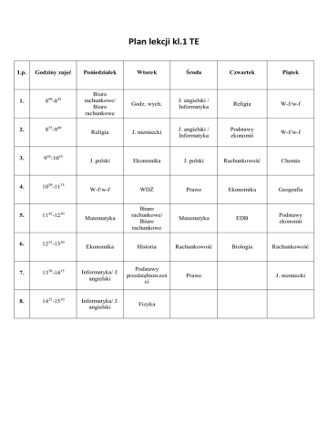 Plan lekcji kl.1 TE Lp. Godziny zajęć Poniedziałek Wtorek Środa Czwartek Piątek 1. 800-845 Biuro rachunkowe/ Biuro rachunkowe Godz. wych. J. angielski / Informatyka Religia W-f/w-f 2. 855-940 Religia J. niemiecki J. angielski / Informatyka Podstawy ekonomii W-f/w-f 3. 950-1035 J. polski Ekonomika J. polski Rachunkowość Chemia 4. 1050-1135 W-f/w-f WDŻ Prawo Ekonomika Geografia 5. 1145-1230 Matematyka Biuro rachunkowe/ Biuro rachunkowe Matematyka EDB Podstawy ekonomii 6. 1235-1320 Ekonomika Historia Rachunkowość Biologia Rachunkowość 7. 1330-1415 Informatyka/ J. angielski Podstawy przedsiębiorczoś ci Prawo 8. 1425-1510 Informatyka/ J. angielski Fizyka J. niemiecki