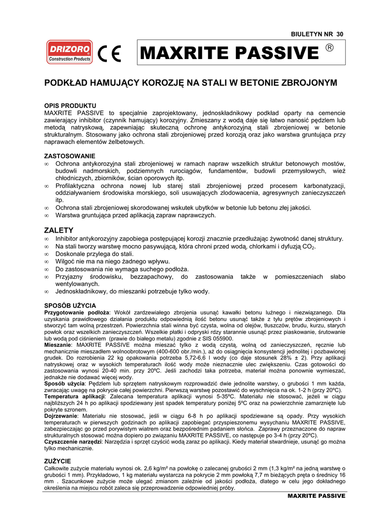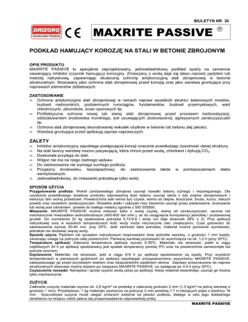 BIULETYN NR 30 MAXRITE PASSIVE PODKŁAD HAMUJĄCY KOROZJĘ NA STALI W BETONIE ZBROJONYM OPIS PRODUKTU MAXRITE PASSIVE to specjalnie zaprojektowany, jednoskładnikowy podkład oparty na cemencie zawierający inhibitor (czynnik hamujący) korozyjny. Zmieszany z wodą daje się łatwo nanosić pędzlem lub metodą natryskową, zapewniając skuteczną ochronę antykorozyjną stali zbrojeniowej w betonie strukturalnym. Stosowany jako ochrona stali zbrojeniowej przed korozją oraz jako warstwa gruntująca przy naprawach elementów Ŝelbetowych. ZASTOSOWANIE • Ochrona antykorozyjna stali zbrojeniowej w ramach napraw wszelkich struktur betonowych mostów, budowli nadmorskich, podziemnych rurociągów, fundamentów, budowli przemysłowych, wieŜ chłodniczych, zbiorników, ścian oporowych itp. • Profilaktyczna ochrona nowej lub starej stali zbrojeniowej przed procesem karbonatyzacji, oddziaływaniem środowiska morskiego, soli usuwających zlodowacenia, agresywnych zanieczyszczeń itp. • Ochrona stali zbrojeniowej skorodowanej wskutek ubytków w betonie lub betonu złej jakości. • Warstwa gruntująca przed aplikacją zapraw naprawczych. ZALETY • • • • • • • Inhibitor antykorozyjny zapobiega postępującej korozji znacznie przedłuŜając Ŝywotność danej struktury. Na stali tworzy warstwę mocno pasywującą, która chroni przed wodą, chlorkami i dyfuzją CO2. Doskonale przylega do stali. Wilgoć nie ma na niego Ŝadnego wpływu. Do zastosowania nie wymaga suchego podłoŜa. Przyjazny środowisku, bezzapachowy, do zastosowania takŜe w pomieszczeniach słabo wentylowanych. Jednoskładnikowy, do mieszanki potrzebuje tylko wody. SPOSÓB UśYCIA Przygotowanie podłoŜa: Wokół zardzewiałego zbrojenia usunąć kawałki betonu luźnego i niezwiązanego. Dla uzyskania prawidłowego działania produktu odpowiednią ilość betonu usunąć takŜe z tyłu prętów zbrojeniowych i stworzyć tam wolną przestrzeń. Powierzchnia stali winna być czysta, wolna od olejów, tłuszczów, brudu, kurzu, starych powłok oraz wszelkich zanieczyszczeń. Wszelkie płatki i odpryski rdzy starannie usunąć przez piaskowanie, śrutowanie lub wodą pod ciśnieniem (prawie do białego metalu) zgodnie z SIS 055900. Mieszanie: MAXRITE PASSIVE moŜna mieszać tylko z wodą czystą, wolną od zanieczyszczeń, ręcznie lub mechanicznie mieszadłem wolnoobrotowym (400-600 obr./min.), aŜ do osiągnięcia konsystencji jednolitej i pozbawionej grudek. Do rozrobienia 22 kg opakowania potrzeba 5,72-6,6 l wody (co daje stosunek 28% ± 2). Przy aplikacji natryskowej oraz w wysokich temperaturach ilość wody moŜe nieznacznie ulec zwiększeniu. Czas gotowości do zastosowania wynosi 20-40 min. przy 20ºC. Jeśli zachodzi taka potrzeba, materiał moŜna ponownie wymieszać, jednakŜe nie dodawać więcej wody. Sposób uŜycia: Pędzlem lub sprzętem natryskowym rozprowadzić dwie jednolite warstwy, o grubości 1 mm kaŜda, zwracając uwagę na pokrycie całej powierzchni. Pierwszą warstwę pozostawić do wyschnięcia na ok. 1-2 h (przy 20ºC). Temperatura aplikacji: Zalecana temperatura aplikacji wynosi 5-35ºC. Materiału nie stosować, jeŜeli w ciągu najbliŜszych 24 h po aplikacji spodziewany jest spadek temperatury poniŜej 5ºC oraz na powierzchnie zamarznięte lub pokryte szronem. Dojrzewanie: Materiału nie stosować, jeśli w ciągu 6-8 h po aplikacji spodziewane są opady. Przy wysokich temperaturach w pierwszych godzinach po aplikacji zapobiegać przyspieszonemu wysychaniu MAXRITE PASSIVE, zabezpieczając go przed porywistym wiatrem oraz bezpośrednim padaniem słońca. Zaprawy przeznaczone do napraw strukturalnych stosować moŜna dopiero po związaniu MAXRITE PASSIVE, co następuje po 3-4 h (przy 20ºC). Czyszczenie narzędzi: Narzędzia i sprzęt czyścić wodą zaraz po aplikacji. Kiedy materiał stwardnieje, usunąć go moŜna tylko mechanicznie. ZUśYCIE Całkowite zuŜycie materiału wynosi ok. 2,6 kg/m² na powłokę o zalecanej grubości 2 mm (1,3 kg/m² na jedną warstwę o grubości 1 mm). Przykładowo, 1 kg materiału wystarcza na pokrycie 2 mm powłoką 7,7 m bieŜących pręta o średnicy 16 mm . Szacunkowe zuŜycie moŜe ulegać zmianom zaleŜnie od jakości podłoŜa, dlatego w celu jego dokładnego określenia na miejscu robót zaleca się przeprowadzenie odpowiedniej próby. MAXRITE PASSIVE DANE TECHNICZNE Wygląd zewnętrzny Woda do mieszania (% w stosunku do wagi produktu) Gęstość względna proszku (g/cm³) Gęstość materiału utwardzonego (g/cm³) Czas gotowości do uŜycia (min. przy 20ºC) Czas wiązania (h przy 20ºC) PrzybliŜone zuŜycie (grubość 2 mm, kg/m²) Przyczepność do stali w 28. dniu, zgodnie z ASTM D-45-41 (MPa) szary proszek 28 ± 2 0,91 ± 0,05 1,80 ± 0,05 20 – 40 3–4 2,6 > 2,50 Maxrite Passive spełnia wymagania odnoszące się do zastosowań w Standardzie Europejskim UNE-EN 1504-3 dla zaprawy ochronnej na powierzchnie betonowe. OPAKOWANIA Worki 22 kg APROBATY I ATESTY Atest Higieniczny Nr 106/779/124/2007 Aprobata Techniczna IBD i M Nr AT/2007-03-1374 Specyfikacja Techniczna PN-EN 1504-3 Europejska Deklaracja Zgodności CE nr 75/2009 PRZECHOWYWANIE 12 miesięcy w oryginalnym zamkniętym opakowaniu, w miejscu suchym i zacienionym; chronić przed mrozem i temperaturą przekraczającą 35ºC. BHP MAXRITE PASSIVE nie jest materiałem toksycznym, jednakŜe tak jak inne produkty oparte na cemencie działa draŜniąco. Podczas wykonywania mieszanki i w trakcie aplikacji nosić rękawice ochronne i okulary. Kiedy dochodzi do kontaktu z oczami, starannie przemyć je czystą wodą, unikając wcierania. W przypadku kontaktu ze skórą przemyć ją bieŜącą wodą i mydłem. Jeśli podraŜnienie występuje nadal, zwrócić się do lekarza. Na Ŝyczenie przekazujemy Kartę bezpieczeństwa tego materiału. Usuwanie produktu i jego pustych opakowań musi być wykonane zgodnie z obowiązującymi przepisami. GWARANCJA Informacje zawarte w tej broszurze baz