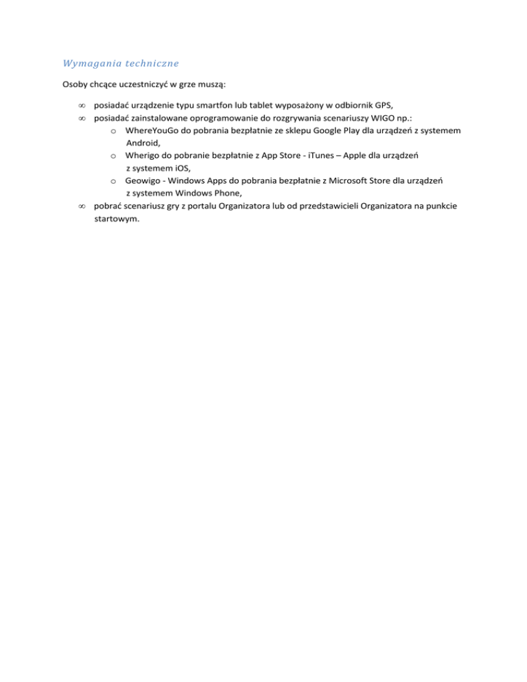 Wymagania techniczne Osoby chcące uczestniczyć w grze muszą: • • • posiadać urządzenie typu smartfon lub tablet wyposażony w odbiornik GPS, posiadać zainstalowane oprogramowanie do rozgrywania scenariuszy WIGO np.: o WhereYouGo do pobrania bezpłatnie ze sklepu Google Play dla urządzeń z systemem Android, o Wherigo do pobranie bezpłatnie z App Store - iTunes – Apple dla urządzeń z systemem iOS, o Geowigo - Windows Apps do pobrania bezpłatnie z Microsoft Store dla urządzeń z systemem Windows Phone, pobrać scenariusz gry z portalu Organizatora lub od przedstawicieli Organizatora na punkcie startowym.