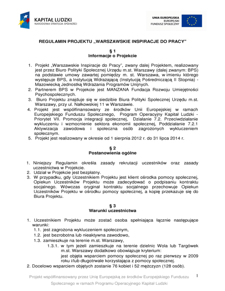REGULAMIN PROJEKTU „WARSZAWSKIE INSPIRACJE DO PRACY” § 1 Informacje o Projekcie 1. Projekt „Warszawskie Inspiracje do Pracy”, zwany dalej Projektem, realizowany jest przez Biuro Polityki Społecznej Urzędu m.st. Warszawy (dalej zwanym: BPS) na podstawie umowy zawartej pomiędzy m. st. Warszawa, w imieniu którego występuje BPS, a Instytucją W drażającą (Instytucją Pośredniczącą II Stopnia) Mazowiecką Jednostką Wdrażania Programów Unijnych. 2. Partnerem BPS w Projekcie jest MANZANA Fundacja Rozwoju Umiejętności Psychospołecznych. 3. Biuro Projektu znajduje się w siedzibie Biura Polityki Społecznej Urzędu m.st. Warszawy, przy ul. Nałkowskiej 11 w Warszawie. 4. Projekt jest współfinansowany ze środków Unii Europejskiej w ramach Europejskiego Funduszu Społecznego, Program Operacyjny Kapitał Ludzki Priorytet VII. Promocja integracji społecznej, Działanie 7.2. Przeciwdziałanie wykluczeniu i wzmocnienie sektora ekonomii społecznej, Poddziałanie 7.2.1 Aktywizacja zawodowa i społeczna osób zagrożonych wykluczeniem społecznym. 5. Projekt jest realizowany w okresie od 1 sierpnia 2012 r. do 31 lipca 2014 r. §2 Postanowienia ogólne 1. Niniejszy Regulamin określa zasady rekrutacji uczestników oraz zasady uczestnictwa w Projekcie. 2. Udział w Projekcie jest bezpłatny. 3. W przypadku, gdy Uczestnikiem Projektu jest klient ośrodka pomocy społecznej, Opiekun Uczestników Projektu może zadecydować o podpisaniu kontraktu socjalnego. Wówczas oryginał kontraktu socjalnego przechowuje Opiekun Uczestników Projektu w ośrodku pomocy społecznej, a kopię przekazuje się do Biura Projektu. §3 Warunki uczestnictwa 1. Uczestnikiem Projektu może zostać osoba spełniająca łącznie następujące warunki: 1.1. jest zagrożona wykluczeniem społecznym, 1.2. jest bezrobotna lub nieaktywna zawodowo, 1.3. zamieszkuje na terenie m.st. Warszawy, 1.3.1. w tym jeżeli zamieszkuje na terenie dzielnic Wola lub Targówek m.st. Warszawy dodatkowo obowiązuje kryterium: jest objęta wsparciem pomocy społecznej po raz pierwszy w 2009 roku i/lub długotrwale korzystająca z pomocy społecznej. 2. Docelowo wsparciem objętych zostanie 76 kobiet i 52 mężczyzn (128 osób). Projekt współfinansowany przez Unię Europejską ze środków Europejskiego Funduszu Społecznego w ramach Programu Operacyjnego Kapitał Ludzki KAPITAŁ LUDZKI NARODOWA STRATEGIA SPÓJNOŚCI §4 Zasady rekrutacji 1. Rekrutacja kandydatów do projektu odbywać się będzie z uwzględnieniem zasady równych szans, w tym zgodnie z zasadą równości płci. Rekrutacja zakłada równy dostęp do projektu zarówno dla kobiet, jak i mężczyzn znajdujących się w grupie potencjalnych Uczestników Projektu. 2. Zostanie powołanych sześć trzyosobowych Zespołów Rekrutacyjnych Projektu. 3. W skład każdego zespołu wejdzie: Opiekun Uczestników Projektu (przedstawiciel jednego z sześciu ośrodków pomocy społecznej - Bemowo, Białołęka, Bielany, Targówek, Wola, Żoliborz), psycholog (przedstawiciel Fundacji MANZANA) oraz Kierownik Projektu. 4. Procedura rekrutacyjna składać się będzie z następujących etapów: 4.1. Etap I - przeprowadzany przez Opiekunów Uczestników Projektu w ośrodkach pomocy społecznej na podstawie kryteriów wymienionych w § 3. Kandydaci wypełnią kwestionariusz ankiety rekrutacyjnej - załącznik nr 1 do niniejszego Regulaminu. 4.2. Etap II - przeprowadzany przez Zespoły Rekrutacyjne w ośrodkach pomocy społecznej. Kandydaci wezm ą udział w rozmowie kwalifikacyjnej z psychologiem. Rozmowy odbędą się w terminach uzgodnionych z Opiekunami Uczestników Projektu w ośrodkach pomocy społecznej. Psycholog podczas rozmowy kwalifikacyjnej wypełni kwestionariusz kwalifikacyjny kandydata - załącznik nr 2. 4.3. Etap III - weryfikacja złożonych dokumentów oraz kwalifikacja do udziału w projekcie dokonywana przez Zespół Rekrutacyjny. O zakwalifikowaniu kandydatów/kandydatek do projektu będą decydowały: 4.3.1. kryteria wymienione w § 3, 4.3.2. kwestionariusz ankiety, o którym mowa w § 4 w ust. 4.1, 4.3.3. rozmowa rekrutacyjna udokumentowana w formie pisemnej poprzez kwestionariusz, o którym mowa w § 4 w ust. 4.2. 5. Kandydatki/kandydaci, którzy zostali zakwalifikowani do uczestnictwa w projekcie będą informowani o wynikach rekrutacji przez Opiekuna Uczestników Projektu. 6. Zakwalifikowani kandydaci będą zobowiązani do: 6.1. zapoznania się z Regulaminem Projektu, 6.2. wypełnienia deklaracji przystąpienia do Projektu - załącznik nr 3, 6.3. złożenie pisemnego oświadczenia o możliwości przetwarzania danych osobowych - załącznik nr 4. 7. Procedura rekrutacji odbędzie się trzy razy w trakcie trwania projektu, zgodnie z cyklami jego realizacji. 8. Złożone przez kandydata dokumenty nie podlegają zwrotowi. 9. Ostateczną decyzję o zakwalifikowaniu kandydata do projektu podejmował będzie Kierownik Projektu. 10. W przypadku przekroczenia limitu miejsc zostanie sporządzona lista rezerwowa. 11. W przypadku nie stawienia się kandydata na rozmowę rekrutacyjną jego kandydatura nie będzie brana pod uwagę. Na jego miejsce zostanie wpisany kandydat z listy rezerwowej. Projekt współfinansowany przez Unię Europejską ze środków Europejskiego Funduszu Społecznego w ramach Programu Operacyjnego Kapitał Ludzki KAPITAŁ LUDZKI NARODOWA STRATEGIA SPÓJNOŚCI 12. W przypadku rezygnacji z udziału w Projekcie uczestnik zostanie wykreślony z Projektu. Na miejsce skreślonego uczestnika zostanie wpisany kandydat z listy rezerwowej. §5 Działania Projektu 1. Działania będą się odbywały w trzech następujących po sobie cyklach projektowych. 2. W pierwszym cyklu wsparciem zostaną objęte 44 osoby, w drugim cyklu 44 osoby, a w trzecim cyklu wsparciem zostanie objętych 40 osób. 3. Realizacja Projektu ma na celu aktywizację społeczną i zawodową 128 osób zagrożonych wykluczeniem społecznym do końca lipca 2014 r. poprzez realizację nas