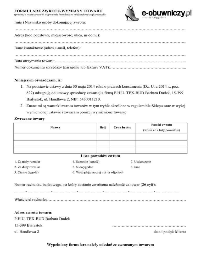 FORMULARZ ZWROTU/WYMIANY TOWARU (prosimy o wydrukowanie i wypełnienie formularza w miejscach wykropkowanych) Imię i Nazwisko osoby dokonującej zwrotu: ……………………………………………………………………………………………………………….. Adres (kod pocztowy, miejscowość, ulica, nr domu): ……………………………………………………………………………………………………………….. Dane kontaktowe (adres e-mail, telefon): ……………………………………………………………………………………………………………….. Data otrzymania towaru:…………………………………………………………………………………….. Numer dokumentu sprzedaży (paragonu lub faktury VAT):………………………………………………... Niniejszym oświadczam, iż: 1. Na podstawie ustawy z dnia 30 maja 2014 roku o prawach konsumenta (Dz. U. z 2014 r., poz. 827) odstępuję od umowy sprzedaży zawartej z firmą P.H.U. TEX-BUD Barbara Dudek, 15-399 Białystok, ul. Handlowa 2, NIP: 5430011210. 2. Znane mi są warunki zwrotu towarów w tym trybie określone w regulaminie Sklepu oraz w wyżej wymienionej ustawie i zwracam poniżej wymienione towary: Zwracane towary Ilość Nazwa Cena brutto Powód zwrotu (wpisz nr z listy powodów) Lista powodów zwrotu 1. Za mały rozmiar 4. Szerokie (tęgość) 7. Uszkodzone 2. Za duży rozmiar 5. Niewygodne 8. Inne 3. Ciasne (tęgość) 6. Wyglądają inaczej niż na zdjęciach Numer rachunku bankowego, na który zostanie zwrócona należność za towar (26 cyfr): __ __ - __ __ __ __ - __ __ __ __ - __ __ __ __ - __ __ __ __ - __ __ __ __ - __ __ __ __ Właściciel rachunku:………………………………………………………………………………………… Adres zwrotu towaru: P.H.U. TEX-BUD Barbara Dudek 15-399 Białystok ul. Handlowa 2 ……….……………………………………… data i podpis klienta Wypełniony formularz należy odesłać ze zwracanym towarem