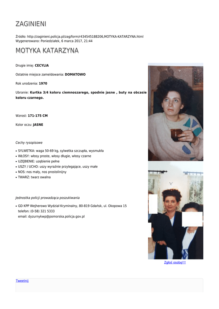 ZAGINIENI Źródło: http://zaginieni.policja.pl/zag/form/r434545188206,MOTYKA-KATARZYNA.html Wygenerowano: Poniedziałek, 6 marca 2017, 21:44 MOTYKA KATARZYNA Drugie imię: CECYLIA Ostatnie miejsce zameldowania: DOMATOWO Rok urodzenia: 1970 Ubranie: Kurtka 3/4 koloru ciemnoszarego, spodnie jasne , buty na obcasie koloru czarnego. Wzrost: 171-175 CM Kolor oczu: JASNE Cechy rysopisowe ● SYLWETKA: waga 50-69 kg, sylwetka szczupła, wysmukła ● WŁOSY: włosy proste, włosy długie, włosy czarne ● UZĘBIENIE: uzębienie pełne ● USZY / UCHO: uszy wyraźnie przylegające, uszy małe ● NOS: nos mały, nos prostolinijny ● TWARZ: twarz owalna Jednostka policji prowadząca poszukiwania ● GD KPP Wejherowo Wydział Kryminalny, 80-819 Gdańsk, ul. Okopowa 15 telefon: (0-58) 321 5333 email: [email protected] Zgłoś osobę!!! Tweetnij