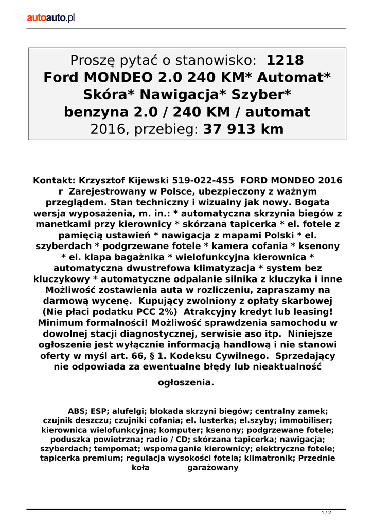 Proszę pytać o stanowisko: 1218 Ford MONDEO 2.0 240 KM* Automat* Skóra* Nawigacja* Szyber* benzyna 2.0 / 240 KM / automat 2016, przebieg: 37 913 km Kontakt: Krzysztof Kijewski 519-022-455 FORD MONDEO 2016 r Zarejestrowany w Polsce, ubezpieczony z ważnym przeglądem. Stan techniczny i wizualny jak nowy. Bogata wersja wyposażenia, m. in.: * automatyczna skrzynia biegów z manetkami przy kierownicy * skórzana tapicerka * el. fotele z pamięcią ustawień * nawigacja z mapami Polski * el. szyberdach * podgrzewane fotele * kamera cofania * ksenony * el. klapa bagażnika * wielofunkcyjna kierownica * automatyczna dwustrefowa klimatyzacja * system bez kluczykowy * automatyczne odpalanie silnika z kluczyka i inne Możliwość zostawienia auta w rozliczeniu, zapraszamy na darmową wycenę. Kupujący zwolniony z opłaty skarbowej (Nie płaci podatku PCC 2%) Atrakcyjny kredyt lub leasing! Minimum formalności! Możliwość sprawdzenia samochodu w dowolnej stacji diagnostycznej, serwisie aso itp. Niniejsze ogłoszenie jest wyłącznie informacją handlową i nie stanowi oferty w myśl art. 66, § 1. Kodeksu Cywilnego. Sprzedający nie odpowiada za ewentualne błędy lub nieaktualność ogłoszenia. ABS; ESP; alufelgi; blokada skrzyni biegów; centralny zamek; czujnik deszczu; czujniki cofania; el. lusterka; el.szyby; immobiliser; kierownica wielofunkcyjna; komputer; ksenony; podgrzewane fotele; poduszka powietrzna; radio / CD; skórzana tapicerka; nawigacja; szyberdach; tempomat; wspomaganie kierownicy; elektryczne fotele; tapicerka premium; regulacja wysokości fotela; klimatronik; Przednie koła garażowany 1/2 Cena: 89 999 PLN brutto Opiekun: Krzysztof Kijewski +48 519 022 455 Al. Krakowska 178, Punkt C 2/2