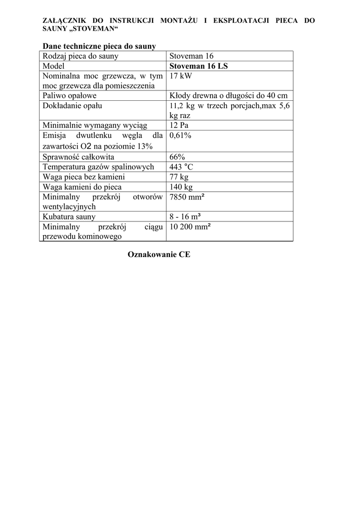 ZAŁĄCZNIK DO INSTRUKCJI MONTAŻU I EKSPLOATACJI PIECA DO SAUNY „STOVEMAN“ Dane techniczne pieca do sauny Rodzaj pieca do sauny Model Nominalna moc grzewcza, w tym moc grzewcza dla pomieszczenia Paliwo opałowe Dokładanie opału Stoveman 16 Stoveman 16 LS 17 kW Kłody drewna o długości do 40 cm 11,2 kg w trzech porcjach,max 5,6 kg raz Minimalnie wymagany wyciąg 12 Pa Emisja dwutlenku węgla dla 0,61% zawartości O2 na poziomie 13% Sprawność całkowita 66% Temperatura gazów spalinowych 443 °C Waga pieca bez kamieni 77 kg Waga kamieni do pieca 140 kg Minimalny przekrój otworów 7850 mm² wentylacyjnych Kubatura sauny 8 - 16 m³ Minimalny przekrój ciągu 10 200 mm² przewodu kominowego Oznakowanie CE INSTRUKCJA MONTAŻU I EKSPLOATACJI PIECA DO SAUNY „STOVEMAN“ Piec do sauny ,,STOVEMAN“ jest przeznaczony do suchej lub mokrej kąpieli parowej w saunie. Nasz asortyment obejmuje różne warianty pieców do sauny Stoveman. Konsument może wybrać pomiędzy piecami o kwadratowym lub okrągłym kształcie zewnętrznym. Piec może być wyposażony w kominowy podgrzewacz wody, przeszklone drzwiczki i przejście ścienne do komory grzewczej. Kopia dokumentu oznakowania CE dotyczącego rodzaju nabywanego pieca do sauny oraz dane modelu przedstawione są w załączniku do niniejszej instrukcji. Przygotowanie do użytkowania Przed rozpoczęciem użytkowania pieca do sauny należy uważnie przeczytać niniejszą instrukcję! Pierwsze rozpalenie w piecu należy przeprowadzić na zewnątrz lub w dobrze wentylowanym pomieszczeniu do kąpieli, ponieważ farba termoodporna obudowy pieców do sauny uzyskuje swoją ostateczną twardość i trwałość dopiero po podgrzaniu i może wydzielać nieprzyjemny zapach. Równocześnie należy unikać zadrapania pieca. Nie zaleca się załadowania pieca do sauny kamieniami przed pierwszym grzaniem. W piecach do saun można stosować granitowe kamienie polne lub specjalne kamienie do pieca do sauny dostępne w handlu. Montaż Przy montażu pieca do sauny należy dotrzymywać wszystkich lokalnych przepisów, a także norm krajowych i unijnych, w tym EN 15821:2010. Piec do sauny musi być zamontowany na podłożu z materiału niepalnego o wymaganej nośności. Przy montażu pieca do sauny należy przestrzegać wymagań dotyczących bezpieczeństwa oraz zaleceń dotyczących bezpiecznych odległości podanych na oznakowaniu CE. Oznakowanie CE umieszczone na piecu do sauny znajduje się po prawej stronie na dolnym kołnierzu siatki, patrząc od strony drzwiczek paleniska. W przypadku, gdy piec jest zainstalowany we wnęce z materiałów niepalnych (kamień, beton), należy pilnować, aby między ścianą a piecem pozostawało co najmniej 100 mm wolnej przestrzeni dla ruchu powietrza. Ze względu na duże wahania temperatury kamienie do pieca do sauny mogą z upływem czasu ulec kruszeniu i tracić swoje niezbędne właściwości. W związku z tym zaleca się raz w roku opróżnić piec do sauny z kamieni i wymienić zużyte kamienie na nowe. Wymagania dotyczące bezpieczeństwa (ogólne wymagania dotyczące bezpieczeństwa pożarowego) Należy przestrzegać ogólnych wymagań dotyczących bezpieczeństwa pożarowego obowiązujących w kraju. Minimalne bezpieczne odległości od materiałów palnych: Z boku i z tyłu pieca 500 mm Z przodu pieca 1000 mm Od powierzchni górnej pieca do sufitu 1200 mm Ustalone bezpieczne odległości mogą być zmniejszone o połowę w przypadku stosowania pojedynczej izolacji termicznej i do jednej czwartej w przypadku stosowania podwójnej izolacji termicznej. Jeśli ściany drewniane (z płyt, desek, kłód) znajdują się bliżej pieca do sauny niż wymagana odległość bezpieczna, powierzchnie ścienne muszą być zabezpieczone izolacją termiczną (np. płytą wiórowo-cementową). W przypadku pojedynczej izolacji termicznej, minimalna odległość między ścianą a piecem może wynosić 250 mm, przy czym izolację termiczną uznaje się za wchodzącą w strefę bezpieczeństwa i pomiędzy jej zewnętrzną powierzchnią a zabezpieczaną ścianą powinna zostać szczelina wentylacyjna o szerokości co najmniej 30 mm. W przypadku montażu pieca do sauny na podłożu z drewna lub podobnych materiałów palnych, trzeba wylać fundament z betonu o grubości co najmniej 60 mm i o nadwymiarach 300 mm z boku i 400 mm z przodu. Można również użyć innych materiałów niepalnych o niskiej przewodności cieplnej lub przenośną podstawę zapewniającą izolację termiczną. Przejście ścienne do komory grzewczej powinno być wykonane przez ścianę niepalną (kamienną, betonową itp.). Zaleca się dodatkowo zastosowanie izolacji z wełny mineralnej itp. (zobacz rysunek). W strefie bezpieczeństwa pieca do sauny nie powinny znajdować się żadne urządzenia elektryczne ani przewody. Uwaga! Wykorzystanie mechanicznej wentylacji wyciągowej może powodować problemy w wymianie powietrza w pomieszczeniu i wywołać niedobór powietrza do spalania w palenisku. Zaprojektowanie i wybudowanie takiego systemu wentylacji może wykonać wyłącznie specjalista posiadający odpowiednią licencję. Podłączenie pieca do sauny do przewodu kominowego Piece do sauny Stoveman posiadają z reguły otwór wylotowy gazów spalinowych umieszczony na piecu. Do podłączenia pieca do sauny z przewodem kominowym używa się specjalnych rur spalinowych z metalu, które w razie potrzeby uszczelnia się sznurem uszczelniającym odpornym na wysokie temperatury. Kolana przewodów łączących powinny mieć gładką krzywiznę, aby ciąg powietrza nie był utrudniony. Rurę należy przeprowadzić przez ścianę kominową i uszczelnić wełną mineralną. Podłączenie pieca do sauny do przewodu kominowego może być wykonane tylko przez odpowiedniego specjalistę. Nie wolno podłączać pieca do sauny do wspólnego przewodu kominowego. Modyfikowanie pieca do sauny bez upoważnienia producenta nie jest dozwolone. Rozpalanie pieca do sauny Uwaga! Piec