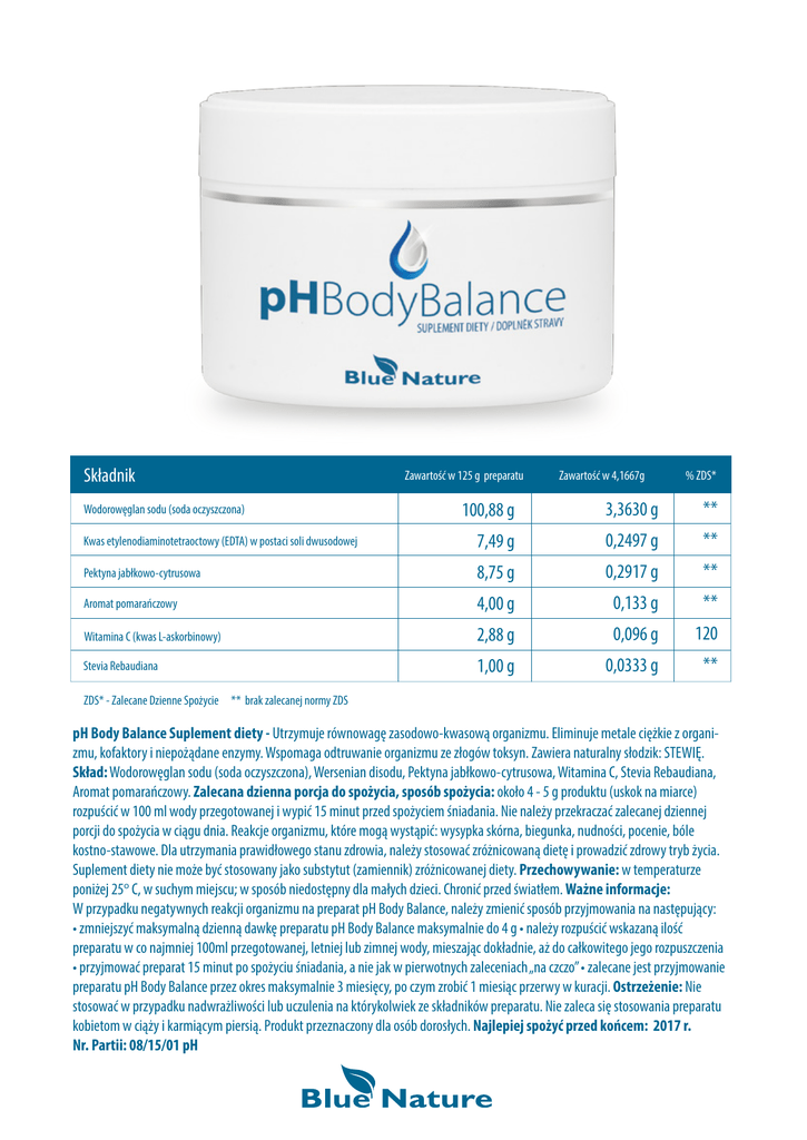 Składnik Zawartość w 125 g preparatu Zawartość w 4,1667g % ZDS* 100,88 g 3,3630 g ** Kwas etylenodiaminotetraoctowy (EDTA) w postaci soli dwusodowej 7,49 g 0,2497 g ** Pektyna jabłkowo-cytrusowa 8,75 g 0,2917 g ** Aromat pomarańczowy 4,00 g 0,133 g ** Witamina C (kwas L-askorbinowy) 2,88 g 0,096 g 120 Stevia Rebaudiana 1,00 g 0,0333 g ** Wodorowęglan sodu (soda oczyszczona) ZDS* - Zalecane Dzienne Spożycie ** brak zalecanej normy ZDS pH Body Balance Suplement diety - Utrzymuje równowagę zasodowo-kwasową organizmu. Eliminuje metale ciężkie z organizmu, kofaktory i niepożądane enzymy. Wspomaga odtruwanie organizmu ze złogów toksyn. Zawiera naturalny słodzik: STEWIĘ. Skład: Wodorowęglan sodu (soda oczyszczona), Wersenian disodu, Pektyna jabłkowo-cytrusowa, Witamina C, Stevia Rebaudiana, Aromat pomarańczowy. Zalecana dzienna porcja do spożycia, sposób spożycia: około 4 - 5 g produktu (uskok na miarce) rozpuścić w 100 ml wody przegotowanej i wypić 15 minut przed spożyciem śniadania. Nie należy przekraczać zalecanej dziennej porcji do spożycia w ciągu dnia. Reakcje organizmu, które mogą wystąpić: wysypka skórna, biegunka, nudności, pocenie, bóle kostno-stawowe. Dla utrzymania prawidłowego stanu zdrowia, należy stosować zróżnicowaną dietę i prowadzić zdrowy tryb życia. Suplement diety nie może być stosowany jako substytut (zamiennik) zróżnicowanej diety. Przechowywanie: w temperaturze poniżej 25o C, w suchym miejscu; w sposób niedostępny dla małych dzieci. Chronić przed światłem. Ważne informacje: W przypadku negatywnych reakcji organizmu na preparat pH Body Balance, należy zmienić sposób przyjmowania na następujący: • zmniejszyć maksymalną dzienną dawkę preparatu pH Body Balance maksymalnie do 4 g • należy rozpuścić wskazaną ilość preparatu w co najmniej 100ml przegotowanej, letniej lub zimnej wody, mieszając dokładnie, aż do całkowitego jego rozpuszczenia • przyjmować preparat 15 minut po spożyciu śniadania, a nie jak w pierwotnych zaleceniach „na czczo” • zalecane jest przyjmowanie preparatu pH Body Balance przez okres maksymalnie 3 miesięcy, po czym zrobić 1 miesiąc przerwy w kuracji. Ostrzeżenie: Nie stosować w przypadku nadwrażliwości lub uczulenia na którykolwiek ze składników preparatu. Nie zaleca się stosowania preparatu kobietom w ciąży i karmiącym piersią. Produkt przeznaczony dla osób dorosłych. Najlepiej spożyć przed końcem: 2017 r. Nr. Partii: 08/15/01 pH