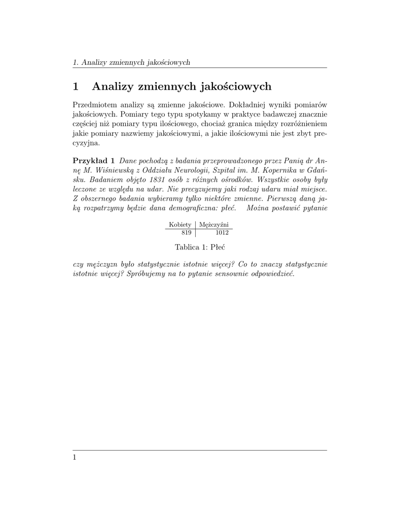1. Analizy zmiennych jakościowych 1 Analizy zmiennych jakościowych Przedmiotem analizy są zmienne jakościowe. Dokładniej wyniki pomiarów jakościowych. Pomiary tego typu spotykamy w praktyce badawczej znacznie częściej niż pomiary typu ilościowego, chociaż granica między rozróżnieniem jakie pomiary nazwiemy jakościowymi, a jakie ilościowymi nie jest zbyt precyzyjna. Przykład 1 Dane pochodzą z badania przeprowadzonego przez Panią dr Annę M. Wiśniewską z Oddziału Neurologii, Szpital im. M. Kopernika w Gdańsku. Badaniem objęto 1831 osób z różnych ośrodków. Wszystkie osoby były leczone ze względu na udar. Nie precyzujemy jaki rodzaj udaru miał miejsce. Z obszernego badania wybieramy tylko niektóre zmienne. Pierwszą daną jaką rozpatrzymy będzie dana demograficzna: płeć. Można postawić pytanie Kobiety 819 Mężczyźni 1012 Tablica 1: Płeć czy mężczyzn było statystycznie istotnie więcej? Co to znaczy statystycznie istotnie więcej? Spróbujemy na to pytanie sensownie odpowiedzieć. 1 1. Analizy zmiennych jakościowych 2 Rysunek 1: Huff: How to Lie with Statistics 1. Analizy zmiennych jakościowych Przykład 2 Następną zmienną, która odgrywa już poważną rolę jest identyfikacja zgonu. Nie było 1419 Zgon 412 Tablica 2: Zgon Postawimy kilka naturalnych pytań: 1. Czy zgonów było „dużo” czy „mało”? 2. Jak rozumieć sformułowania „dużo” i „mało”? 3. Jak rozumieć proces decyzyjny w tym przypadku? 3 1. Analizy zmiennych jakościowych Przykład 3 Pójdziemy dalej i popatrzymy na łączną postać płci i zgonu. Kobiety Mężczyźni Nie było 606 813 Zgon 213 199 Tablica 3: Liczba zgonów Intuicyjnie interesują nas częstości zgonów w grupie kobiet i grupie mężczyzn. Częstości te są łatwe do obliczenia: Płeć = DS[,8] Zgon = DS[,212] round(100*prop.table(table(Płeć,Zgon),1),1) Kobiety Mężczyźni Nie było 74% 80.3% Zgon 26% 19.7% Tablica 4: Płeć i zgon Jest oczywiste, że zadajemy pytanie: Czy 26% jest statystycznie istotnie większe niż 19.7%? Jednak odpowiedź tak lub na ogół nie jest zadawalająca. Chcemy wiedzieć w jakim stopniu jest ta różnica znacząca? Dobrze by było podać jakieś wskaźniki, które by określały tę siłę związku. Propozycja pada na dwa wskaźniki RR - ryzyko względne (relative risk) i OR - iloraz szans (Odds ratio). Postaramy się je omówić. 4 1. Analizy zmiennych jakościowych Zanim odpowiemy na pytanie dotyczące siły związku dwóch wielkości jakościowych postawmy pytanie prostsze: Czy Zgon nie zależy od płci? Sformułowanie „nie zależy” jest oczywiste w sensie filozoficznym. Oznacza to, że nie ma związku przyczynowo skutkowego między tymi wielkościami, ale my w analizie statystycznej nie odwołujemy się do filozofii, tylko matematyki! Zasadniczy problem polega na tym by powiedzieć, na bazie procedur statystycznych jak sprawdzać ową niezależność, jakkolwiek byśmy ją rozumieli. Dokładniej prześledzimy w tym zakresie dokładny test Fishera (Exact Fisher Test). 5 1. Analizy zmiennych jakościowych Idziemy dalej, powiedzmy, że zmienne są zależne, jakkolwiek byśmy to uzyskali, to wpadamy w całe kontinuum różnych form zależności. Może udałoby się przypisać otrzymanym wynikom jakiś model i na jego podstawie coś powiedzieć o tych zależnościach. Wydaje się, że model analizy log-liniowej będzie przydatny. Skupimy się na nim i powiemy co z niego wynika. To podejście jest jednak tylko wstępem do analiz zależności trzech zmiennych. 6 1. Analizy zmiennych jakościowych Rozpatrzymy trzecią zmienną: Cukrzyca Nie było 1476 Cukrzyca 355 Tablica 5: Cukrzyca Jak już zauważyliśmy, zgonów wśród kobiet jest więcej. Może zgony są w większej częstości spowodowane cukrzycą? Na przykład może być tak, że więcej kobiet ma cukrzycę i to ta cukrzyca podwyższa śmiertelność wśród kobiet? Popatrzmy na związki podwójne: Kobiety Mężczyźni Nie było 648 828 Cukrzyca 171 184 Tablica 6: Płeć vs. cukrzyca Kobiety Mężczyźni Nie było 79.1% 81.8% Cukrzyca 20.9% 18.2% Tablica 7: Płeć vs. cukrzyca[%] 7 1. Analizy zmiennych jakościowych Nie było Cukrzyca Nie było 1174 245 Zgon 302 110 Tablica 8: Cukrzyca vs. zgon Nie było Cukrzyca Nie było 79.5% 69% Zgon 20.5% 31% Tablica 9: Cukrzyca vs. zgon[%] Musimy podjąć próbę przyporządkowania otrzymanym wynikom surowym szczególnego modelu opisującego związki między wszystkimi trzema zmiennymi. Niestety nie mamy zbyt szerokiej palety tych modeli, a i interpretacje są dość zawiłe, ale spróbujemy. 8 2. Podejście bayesowskie 2 Podejście bayesowskie Jest to nowoczesne podejście które de facto jest ukierunkowane na oszacowanie, a nie na decyzyjność. Podejście jest dość naturalne i ideologię łatwo sobie przyswoić, ale rachunki są makabryczne. Trzeba zatem wyposażyć się w dosyć skuteczną aparaturę obliczeniową dostępną na przykład w języku R. Tradycyjnie używane pakiety takie jak Statistica nie obsługuje procedur bayesowskich. By przybliżyć tematykę rozpatrzymy przykład: Przykład 4 Badanie przeprowadzone w szpitalu AA wykazało, że wystąpienie powikłania w określonej chorobie wynosi 60%. Okazało się, że w szpitalu BB to powikłanie wynosi 40%. Zespół ze szpitala CC podjął również próbę oszacowania wystąpienia tego powikłania i okazało się, że na 120 pacjentów u 56 pojawiła się to powikłanie. Jak połączyć, te trzy informacje w sensowny sposób? Przyjmujemy, że Θ jest zmienną losową odpowiadającą pojawieniu się powikłania. Informacje ze szpitala AA i BB interpretujemy w postaci określenia rozkładu apriori zmiennej Θ. 1 3 = , Pr Θ = 5 2 2 1 Pr Θ = = . 5 2 Wyniki badań własnych są realizacją otrzymaną z rozkładu warunkowego zmiennej K pod warunkiem Θ = θ, który jest rozkładem dwumianowym z parametrami (120, θ) , θ ∈ (0, 1) . Zatem rozkład łączny zmiennych K i Θ ma postać 3 Pr Θ = ∧ K