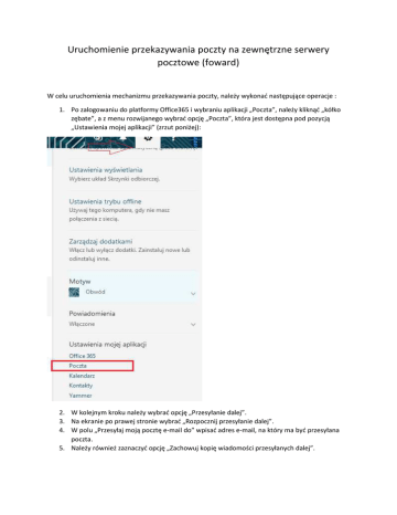 Uruchomienie przekazywania poczty na zewnętrzne serwery pocztowe (foward) W celu uruchomienia mechanizmu przekazywania poczty, należy wykonać następujące operacje : 1. Po zalogowaniu do platformy Office365 i wybraniu aplikacji „Poczta”, należy kliknąć „kółko zębate”, a z menu rozwijanego wybrać opcję „Poczta”, która jest dostępna pod pozycją „Ustawienia mojej aplikacji” (zrzut poniżej): 2. W kolejnym kroku należy wybrać opcję „Przesyłanie dalej”. 3. Na ekranie po prawej stronie wybrać „Rozpocznij przesyłanie dalej”. 4. W polu „Przesyłaj moją pocztę e-mail do” wpisać adres e-mail, na który ma być przesyłana poczta. 5. Należy również zaznaczyć opcję „Zachowuj kopię wiadomości przesyłanych dalej”.