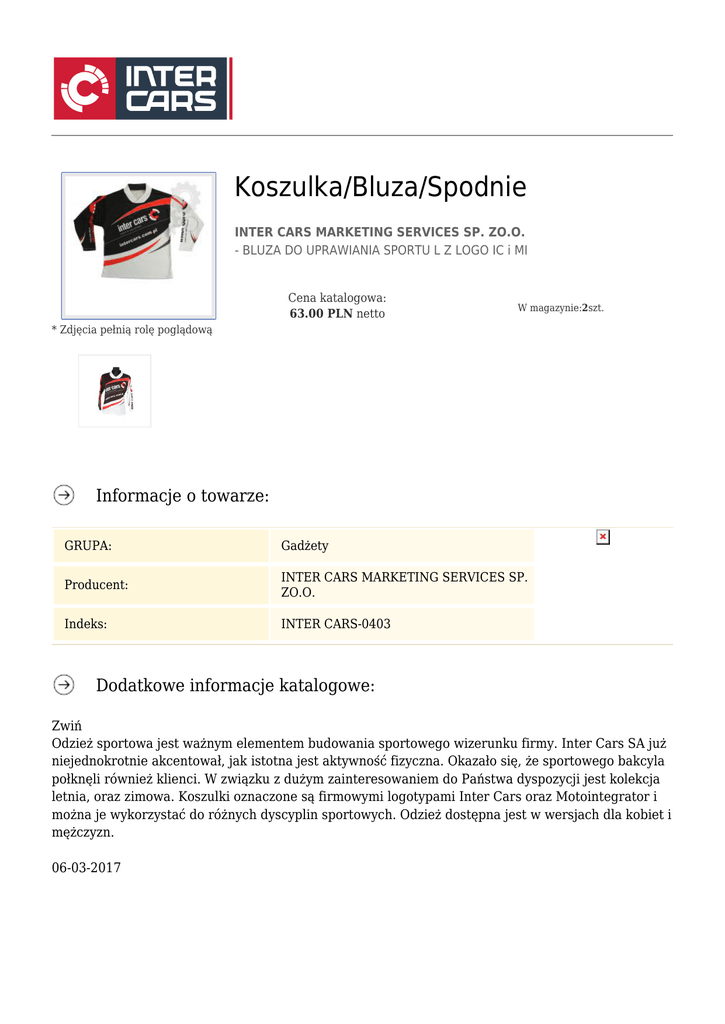 Koszulka/Bluza/Spodnie INTER CARS MARKETING SERVICES SP. ZO.O. - BLUZA DO UPRAWIANIA SPORTU L Z LOGO IC i MI Cena katalogowa: 63.00 PLN netto W magazynie:2szt. * Zdjęcia pełnią rolę poglądową Informacje o towarze: GRUPA: Gadżety Producent: INTER CARS MARKETING SERVICES SP. ZO.O. Indeks: INTER CARS-0403 Dodatkowe informacje katalogowe: Zwiń Odzież sportowa jest ważnym elementem budowania sportowego wizerunku firmy. Inter Cars SA już niejednokrotnie akcentował, jak istotna jest aktywność fizyczna. Okazało się, że sportowego bakcyla połknęli również klienci. W związku z dużym zainteresowaniem do Państwa dyspozycji jest kolekcja letnia, oraz zimowa. Koszulki oznaczone są firmowymi logotypami Inter Cars oraz Motointegrator i można je wykorzystać do różnych dyscyplin sportowych. Odzież dostępna jest w wersjach dla kobiet i mężczyzn. 06-03-2017