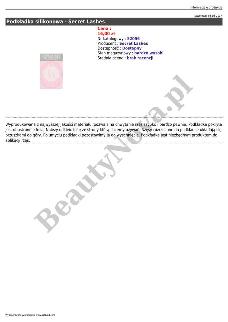 Informacje o produkcie Utworzono 06-03-2017 Podkładka silikonowa - Secret Lashes Cena : 16,00 zł a. pl Nr katalogowy : 52056 Producent : Secret Lashes Dostępność : Dostępny Stan magazynowy : bardzo wysoki Średnia ocena : brak recenzji B ea ut yN ov Wyprodukowana z najwyższej jakości materiału, pozwala na chwytanie rzęs szybko i bardzo pewnie. Podkładka pokryta jest obustronnie folią. Należy odkleić folię ze strony którą chcemy używać. Rzęsy rozrzucone na podkładce układają się brzuszkami do góry. Po umyciu podkładki pozostawimy ją do wyschnięcia. Podkładka Jest niezbędnym produktem do aplikacji rzęs. Wygenerowano w programie www.oscGold.com