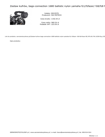 Zestaw kufrów, bags-connection 1680 ballistic nylon yamaha fz1/fzfazer/ fz8/fz8 f Indeks: SM15579 Producent: SW-MOTECH Cena brutto: 1192.54 zł Cena netto: 969.54 zł Podatek VAT: 223.00 zł Link do produktu: serwismotocyklowy.pl/Zestaw-kufrow-bags-connection-1680-ballistic-nylon-yamaha-fz1-fzfazer--fz8-fz8-fazer-BC.HTA.06.740.10300-B,p,155 Opis produktu: SERWISMOTOCYKLOWY.pl | www.serwismotocyklowy.pl | e-mail: [email protected] | tel. 606 814 814 Strona 1 z 1