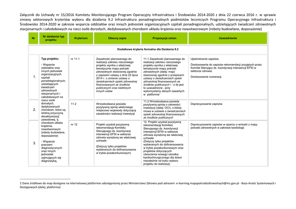 Załącznik do Uchwały nr 15/2016 Komitetu Monitorującego Program Operacyjny Infrastruktura i Środowisko 2014-2020 z dnia 22 czerwca 2016 r. w sprawie zmiany sektorowych kryteriów wyboru dla działania 9.2 Infrastruktura ponadregionalnych podmiotów leczniczych Programu Operacyjnego Infrastruktura i Środowisko 2014-2020 w zakresie wsparcia oddziałów oraz innych jednostek organizacyjnych szpitali ponadregionalnych, udzielających świadczeń zdrowotnych stacjonarnych i całodobowych na rzecz osób dorosłych, dedykowanych chorobom układu krążenia oraz nowotworowym (roboty budowlane, doposażenie) Nr Nr działania/ typ projektu Kryterium Obecny zapis Propozycja zmian Uzasadnienie Dodatkowe kryteria formalne dla Działania 9.2 Typ projektu: 1. 2. 3. - Wsparcie oddziałów oraz innych jednostek organizacyjnych szpitali ponadregionalnych, udzielających świadczeń zdrowotnych stacjonarnych i całodobowych na rzecz osób dorosłych, dedykowanych chorobom, które są istotną przyczyną dezaktywizacji zawodowej, tj. chorobom układu krążenia, nowotworowym (roboty budowlane, doposażenie) - Wsparcie pracowni diagnostycznych oraz innych jednostek zajmujących się diagnostyką, nr 11.1 Zasadność planowanego do realizacji zakresu rzeczowego projektu wynika z właściwej tematycznie mapy potrzeb zdrowotnych stworzonej zgodnie z zapisami ustawy z dnia 22 lipca 2014 r. o zmianie ustawy o świadczeniach opieki zdrowotnej finansowanych ze środków publicznych oraz niektórych innych ustaw 11.2 Wnioskodawca posiada pozytywną opinię właściwego miejscowo wojewody dotyczącą zasadności realizacji inwestycji nr 12 Projekt uzyskał pozytywną rekomendację Komitetu Sterującego ds. koordynacji interwencji EFSI w sektorze zdrowia wyrażoną we właściwej uchwale (Dotyczy tylko projektów wybieranych do dofinansowania w trybie pozakonkursowym) 11.1 Zasadność planowanego do realizacji zakresu rzeczowego projektu wynika z właściwej tematycznie mapy potrzeb zdrowotnych (dalej: map) stworzonej zgodnie z przepisami ustawy o świadczeniach opieki zdrowotnej finansowanych ze środków publicznych i - o ile jest to uzasadnione - przy wykorzystaniu danych zawartych w platformie1 11.2 Wnioskodawca posiada pozytywną opinię o celowości inwestycji (dalej: OCI), o której mowa w ustawie o świadczeniach opieki zdrowotnej finansowanych ze środków publicznych 12. Projekt uzyskał pozytywną rekomendację Komitetu Sterującego ds. koordynacji interwencji EFSI w sektorze zdrowia wyrażoną we właściwej uchwale (Dotyczy tylko projektów wybieranych do dofinansowania w trybie pozakonkursowym oraz projektów dotyczących utworzenia nowego ośrodka kardiochirurgicznego dla dzieci niezależnie od trybu wyboru projektu do realizacji) Ujednolicenie zapisów; Dostosowanie do zapisów rekomendacji przyjętych przez Komitet Sterujący ds. koordynacji interwencji EFSI w sektorze zdrowia. Dostosowanie numeracji. Doprecyzowanie zapisów Doprecyzowanie zapisów w oparciu o wnioski z mapy potrzeb zdrowotnych w zakresie kardiologii. 1 Dane źródłowe do map dostępne na internetowej platformie udostępnionej przez Ministerstwo Zdrowia pod adresem: [email protected] - Baza Analiz Systemowych i Dostępowych (dalej: platforma) współpracujących z jednostkami wymienionymi powyżej (roboty budowlane, doposażenie) nr 13.1 4. Podmiot leczniczy udziela świadczeń opieki zdrowotnej na podstawie umowy zawartej z Dyrektorem oddziału wojewódzkiego NFZ o udzielanie świadczeń opieki w rodzaju leczenie szpitalne w zakresie zbieżnym z zakresem projektu 13.1 Podmiot leczniczy udziela świadczeń opieki zdrowotnej na podstawie umowy zawartej z Dyrektorem oddziału wojewódzkiego NFZ o udzielanie świadczeń opieki w rodzaju leczenie szpitalne w zakresie zbieżnym z zakresem projektu lub na podstawie innych umów finansowanych ze środków publicznych Doprecyzowanie zapisu w oparciu o rekomendacje dla kryteriów wyboru projektów dla Priorytetu Inwestycyjnego 9a Inwestycje w infrastrukturę zdrowotną i społeczną, które przyczyniają się do rozwoju krajowego, regionalnego i lokalnego, zmniejszania nierówności w zakresie stanu zdrowia, promowanie włączenia społecznego poprzez lepszy dostęp do usług społecznych, kulturalnych i rekreacyjnych oraz przejścia z usług instytucjonalnych do usług na poziomie społeczności lokalnych (dalej: rekomendacje). Rekomendacji zostały przyjęte przez Komitet Sterujący ds. koordynacji interwencji EFSI w sektorze zdrowia uchwałą nr 28/2016 z dnia 19.05.2016 Dostosowanie numeracji. nr 13.2 5. Podmiot leczniczy będzie udzielał świadczeń opieki zdrowotnej na podstawie umowy zawartej z Dyrektorem wojewódzkiego oddziału NFZ o udzielanie świadczeń opieki zdrowotnej w rodzaju leczenie szpitalne w zakresie zbieżnym z zakresem projektu najpóźniej w kolejnym okresie kontraktowania świadczeń po zakończeniu realizacji projektu 13.2 Podmiot leczniczy będzie udzielał świadczeń opieki zdrowotnej na podstawie umowy zawartej z Dyrektorem wojewódzkiego oddziału NFZ o udzielanie świadczeń opieki zdrowotnej w rodzaju leczenie szpitalne w zakresie zbieżnym z zakresem projektu najpóźniej w kolejnym okresie kontraktowania świadczeń po zakończeniu realizacji projektu lub na podstawie innych umów finansowanych ze środków publicznych Doprecyzowanie zapisów. Dostosowanie numeracji. (Dotyczy tylko projektów pozakonkursowych i ma zastosowanie w przypadku projektów przewidujących rozwój działalności medycznej podmiotu leczniczego lub zwiększenie jego potencjału w tym zakresie (np. poprzez zakup dodatkowych wyrobów medycznych lub zwiększenie liczby łóżek szpitalnych)). nr 13.3 6. 13.3 Podmiot leczniczy zapewnia lub będzie zapewniać najpóźniej w kolejnym okresie kontraktowania świadczeń opieki Kryterium dodane w związku z zapisami rekomendacji. Dostosowanie numeracji. 2/17 zdrowotnej po zakończeniu realizacji projektu, kompleksową opiekę kardiolog