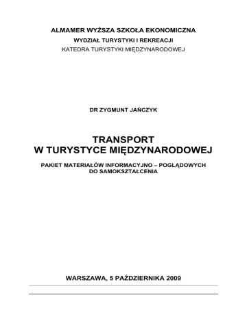 ALMAMER WYŻSZA SZKOŁA EKONOMICZNA WYDZIAŁ TURYSTYKI I REKREACJI KATEDRA TURYSTYKI MIĘDZYNARODOWEJ DR ZYGMUNT JAŃCZYK TRANSPORT W TURYSTYCE MIĘDZYNARODOWEJ PAKIET MATERIAŁÓW INFORMACYJNO – POGLĄDOWYCH DO SAMOKSZTAŁCENIA WARSZAWA, 5 PAŹDZIERNIKA 2009 WPROWADZENIE Szanowni Państwo ! W niniejszym pakiecie materiałów poglądowych przedstawiono wybrane, najważniejsze informacje i zagadnienia z zakresu organizowania turystyki międzynarodowej, dotyczące transportu osobowego, a więc tych zagadnień, które są ogólnie sformułowane w obowiązującym syllabusie z tego przedmiotu. Przedkładany Państwu dobór informacji wynika z dotychczasowego, publikowanego w literaturze dorobku specjalistów z zakresu logistyki i transportu osobowego, uwarunkowań ekonomicznych, zwyczajów oraz - co oczywiste - ze stosownych przepisów prawa obowiązującego w Rzeczypospolitej Polskiej oraz Unii Europejskiej. Problemy związane z transportem, a zwłaszcza podmiotowe i przedmiotowe regulacje umożliwiające - zgodnie z prawem - efektywne realizowanie usługi transportowej są istotnym elementem zarówno w planowaniu i urzeczywistnianiu turystyki, zwłaszcza międzynarodowej, a także w strategii funkcjonowania przedsiębiorstw, jak i w ich bieżącej działalności gospodarczej. Zatem zaprezentowane zakresy i formy publikowanych informacji, wyjaśnień i komentarzy mają w zamyśle wykładowców pomagać w samodzielnym przyswajaniu zagadnień egzaminacyjnych. Umożliwiają również zaplanowanie i zrealizowanie długofalowych przedsięwzięć samokształceniowych. Należy jednak podkreślić, że wszelkie materiały i komentarze zawarte w tym pakiecie mają charakter wyłącznie informacyjny oraz poglądowy i nie mogą być traktowane jako podstawa do czynności mających skutki prawne. Informacje były redagowane wyłącznie jako pomoc metodyczna w samodzielnym studiowaniu podstawowych zagadnień transportu międzynarodowego – przewozu osób. WSKAZÓWKI METODYCZNE W przedsiębiorstwie turystycznym problematyka transportu jest jedną z najbardziej złożonych i skomplikowanych w czasie prowadzenia działalności na rynkach międzynarodowych Związana jest z kilkoma dziedzinami aktywności kadry kierowniczej przedsiębiorstwa: organizacją i zarządzaniem, logistyką, eksploatacją środków przewozowych; prawem administracyjnym, finansowym, gospodarczym i międzynarodowym /.../. Kolejnymi problemami są także wzajemne zobowiązania i uprawnienia osób uczestniczących w imprezie turystycznej, kontrolne uprawnienia publicznych organów administracji oraz oczekiwania, zachowania i zwyczaje klientów. A ponadto, w miarę poznawania kolejnych zagadnień z zakresu przewozu osób obszar niewiedzy także proporcjonalnie się powiększa. Po prostu - odkrywane są kolejne obszary poznawcze. I stanem wręcz idealnym jest sytuacja, w której można powiedzieć: "już wiem, czego jeszcze nie wiem". Ten stan uświadomionej niewiedzy umożliwia jednak racjonalne zaplanowanie dalszego samokształcenia i doskonalenia zawodowego. Stąd też wypływa pierwsza wskazówka: poznawania zagadnień transportowych nie można traktować lekceważąco lub wybiórczo. Albo decydujemy się na ich długotrwałe, wielomiesięczne, uporczywe studiowanie albo zrezygnujmy. Niestaranne zapoznawanie się z regulacjami w tym zakresie powoduje w praktyce zazwyczaj bardzo poważne konsekwencje, niektóre o nieodwracalnych skutkach. Bardzo dolegliwe są też konsekwencje finansowe. Tak przynajmniej wynika z analizy dotychczasowego orzecznictwa oraz zawodowych doświadczeń szefów wielu firm przewozowych rozstrzygających spory ze 2 swoimi partnerami handlowymi lub urzędami ze pośrednictwem organów wymiaru sprawiedliwości i arbitrażu gospodarczego. Zakładając, że Czytelnicy - Studentki i Studenci naszej Uczelni - uszanują swój dobrowolny wybór i zechcą poświęcić czas, energię i ... pieniądze na zgłębienie tajników kilku zagadnień związanych z tematyką transportu, wskazane jest uwzględnienie i przestrzeganie podczas samokształcenia kilku następnych wskazówek. ∗ Na uważne przeczytanie, przeanalizowanie i przyswojenie treści niniejszego opracowania (foliogramów) potrzeba około trzech - czterech godzin. Szybkie przeczytanie (0,5 godziny) nic nie da oprócz ogólnego chaosu pojęć, unormowań i relacji między poszczególnymi zapisami. Należy także pamiętać, iż zagadnienia transportowe mogą być dla mniej ambitnych osób doskonałym środkiem ... nasennym. Stąd też ich nocne czytanie jest zazwyczaj bezskuteczne. Najlepiej zatem przeglądać je codziennie po 20 - 30 minut, dwukrotnie powtórzyć i dopiero potem można przejść do kolejnej partii materiału. ∗ W pakiecie wspomniano tylko o najtrudniejszych, najważniejszych kwestiach lub pojęciach, zostały one specjalnie wyodrębnione drukiem pogrubionym lub pochyłym. Wskazane jest zatem zapamiętanie ich przed przystąpieniem do dalszego studiowania następnych kwestii. ∗ Bardzo istotne jest pełne przyswojenie specjalistycznych pojęć. Dla wielu osób będą one nieco obco brzmiące ale niezbędne jest ich pamięciowe opanowanie, zrozumienie i poprawne używanie. ∗ Wskazane jest także uchwycenie związków między poszczególnymi zagadnieniami. Stąd też nie należy pomijać podczas przeglądania zalecanej literatury licznych (bardzo licznych) odnośników, dookreśleń i uzupełnień zawartych w zapisach. Utrudnia to nieco przyswajanie treści ale umożliwia z kolei zrozumienie istoty przyjętych regulacji i ich wzajemnych relacji. ∗ Koniecznie jest samodzielne (oczywiście druga osoba mile widziana) przerobienie zalecanych ćwiczeń – ułatwi to zrozumienie zaprezentowanego materiału, pokaże praktyczne zastosowanie wiedzy teoretycznej oraz zapamiętanie treści poszczególnych zagadnień. Zapraszam zatem do spokojnego - ale konsekwentnego zaprezentowanych pakietu i stosownej literatury podstawowej. - przerobienia dr Zygm