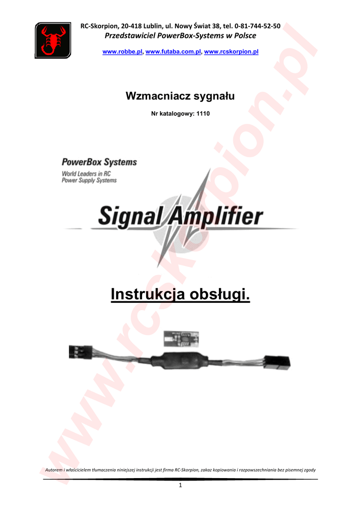 RC‐Skorpion, 20‐418 Lublin, ul. Nowy Świat 38, tel. 0‐81‐744‐52‐50 on .pl Przedstawiciel PowerBox‐Systems w Polsce www.robbe.pl, www.futaba.com.pl, www.rcskorpion.pl Wzmacniacz sygnału Nr katalogowy: 1110 rcs ko rpi ww w. Instrukcja obsługi. Autorem i właścicielem tłumaczenia niniejszej instrukcji jest firma RC‐Skorpion, zakaz kopiowania i rozpowszechniania bez pisemnej zgody 1 RC‐Skorpion, 20‐418 Lublin, ul. Nowy Świat 38, tel. 0‐81‐744‐52‐50 on .pl Przedstawiciel PowerBox‐Systems w Polsce www.robbe.pl, www.futaba.com.pl, www.rcskorpion.pl Wstęp: ww w. rcs ko rpi Serwomechanizmy i inne urządzenia wykonawcze (np. regulatory obrotów, włączniki, żyroskopy) w naszych modelach są łączone z odbiornikami trzy żyłowymi kablami, gdzie czerwony to „+” zasilania, czarny (brązowy) to „-” zasilania, i trzeci biały (pomarańczowy) to sygnał sterujący. Większość modelarzy jest świadoma problemów, które mogą powstać, kiedy do serwa prowadzimy długi kabel, szczególnie jeśli dotyczy to serw szybkich i dużej mocy. Jednym ze stosowanych rozwiązań jest zastosowanie zasilania o dużej pojemności i wyższym napięciu, oraz zastosowanie grubszych przewodów do serw, aby zapewnić odpowiednie zasilanie na dłuższym odcinku przewodu. Jakkolwiek te zabiegi w żaden sposób nie poprawiają jakości sygnału RC na linii odbiornik – serwomechanizm (żyroskop, włącznik lub regulator). Standardowo wyjście sygnałowe serwomechanizmu, generowane jest z wyjścia procesora odbiornika (bezpośrednie wyjście logiczne z nóżki mikroprocesora) i dedykowane jest do wysterowania jednego serwomechanizmu na odcinku 1-2 m (zależnie od grubości przewodów). Jeżeli kabel do serwomechanizmu jest zbyt długi lub steruje więcej jak jednym serwomechanizmem, to jest bardzo prawdopodobne ze całość nie będzie pracować stabilnie i niezawodnie. Elektronika wejściowa serwomechanizmu może tylko pracować właściwie, jeżeli otrzymuje dokładny (pełny i dobrej jakości) sygnał sterujący, jeśli sygnał jest zbyt słaby, układ wejściowy serwa może być niezdolny, by analizować dane i wykonać polecenia z odbiornika, co może spowodować nierówną pracę serwa, drgania, lub brak jakiejkolwiek pracy. Drgania serw są najczęstszymi objawami wykrywanymi przez modelarzy, mogą być również nagłe niekontrolowane wychylenia serw. Bardzo często interpretowane są jako zakłócenia radiowe, bądź interferencje, chociaż nie wszystkie serwa reagują podobnie, zależy to od czułości obwodów wejściowych wzmacniacza serwa. Co prawda nie zawsze drgania serw spowodowane są zbyt słabym sygnałem sterującym, ale prawi zawsze zastosowanie wzmacniacza sygnału eliminuje te objawy. Zasze w przypadku stosowania długich przewodów wzmacniacz powinien być zainstalowany przy serwomechanizmie, jeśli z jakichś powodów jest to nie możliwe, można zainstalować wzmacniacz przy wyjściu z odbiornika, co zdecydowanie poprawi jakość i czytelność sygnału sterującego na końcu przewodu, i zapewni poprawna pracę serwa. Autorem i właścicielem tłumaczenia niniejszej instrukcji jest firma RC‐Skorpion, zakaz kopiowania i rozpowszechniania bez pisemnej zgody 2 RC‐Skorpion, 20‐418 Lublin, ul. Nowy Świat 38, tel. 0‐81‐744‐52‐50 on .pl Przedstawiciel PowerBox‐Systems w Polsce www.robbe.pl, www.futaba.com.pl, www.rcskorpion.pl rcs ko rpi Specyfikacja: - do wszystkich systemów i typów odbiorników, - do wszystkich systemów nadajników, - do wszystkich typów serwomechanizmów, - zwiększa niezawodność i żywotność serwomechanizmu, - zmniejsza efektywny pobór prądu dzięki stabilnej pracy serw – brak przypadkowych ruchów, - testowany i sprawdzony w wielu dużych modelach przez ostatnie kilka lat, - pobór prądu: ok. 10mA, - waga: 1.5grama, ww w. Autorem i właścicielem tłumaczenia niniejszej instrukcji jest firma RC‐Skorpion, zakaz kopiowania i rozpowszechniania bez pisemnej zgody 3